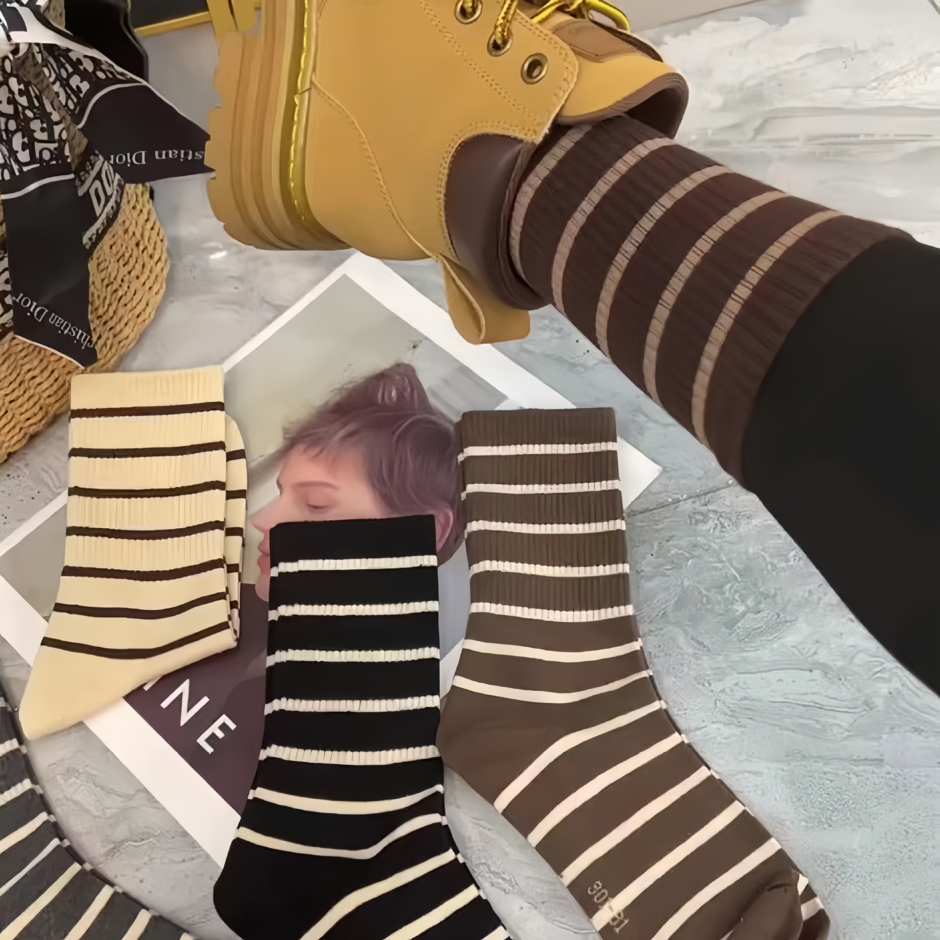 200 핀 양말 여성의 가을과 겨울 흑백 줄무늬 미드 양말 Ins 트렌디 올매치 학술 스타일 스태킹 양말 면 양말 Zhuji
