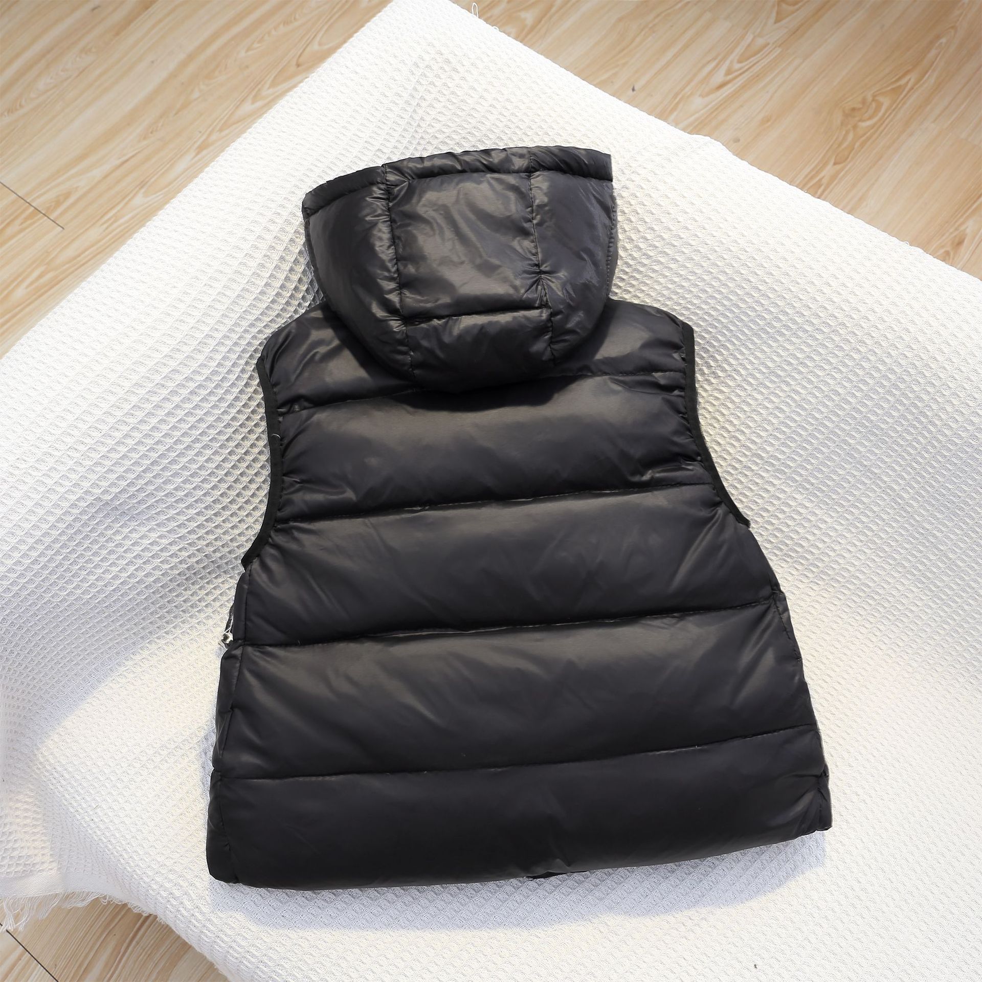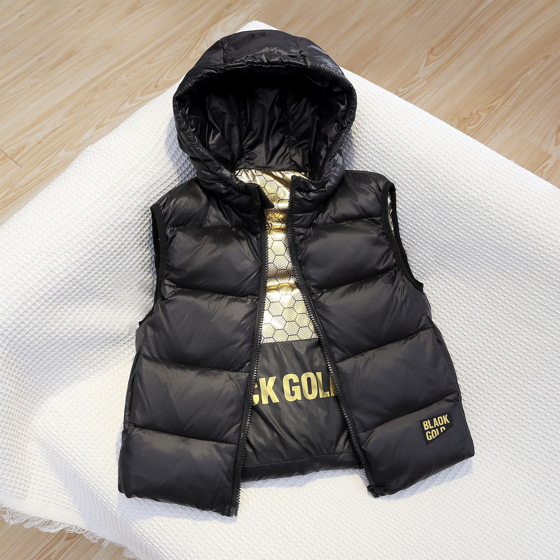 가을과 겨울의 새로운 블랙 골드 어린이 조끼 소년 소녀를위한 모든 경기 일정한 온도 따뜻한 조끼 착용 후드