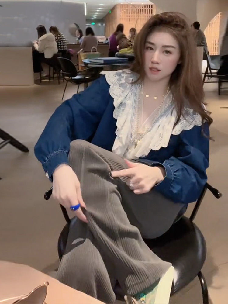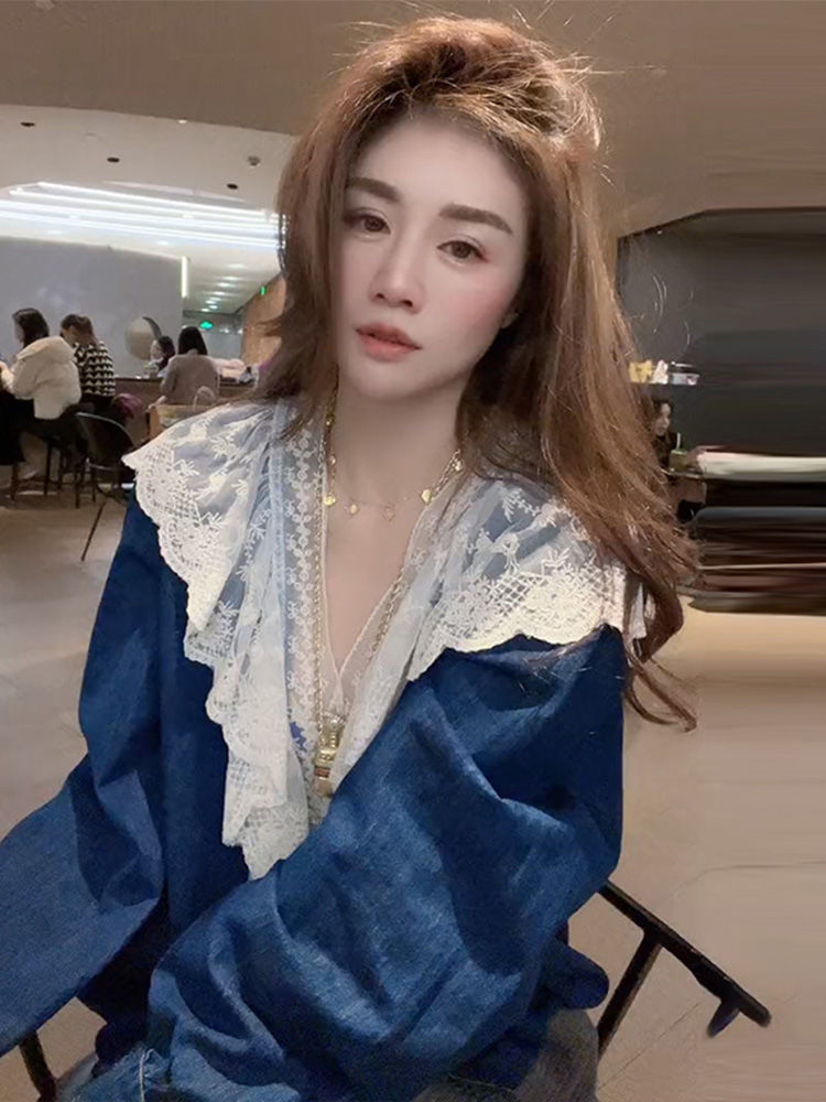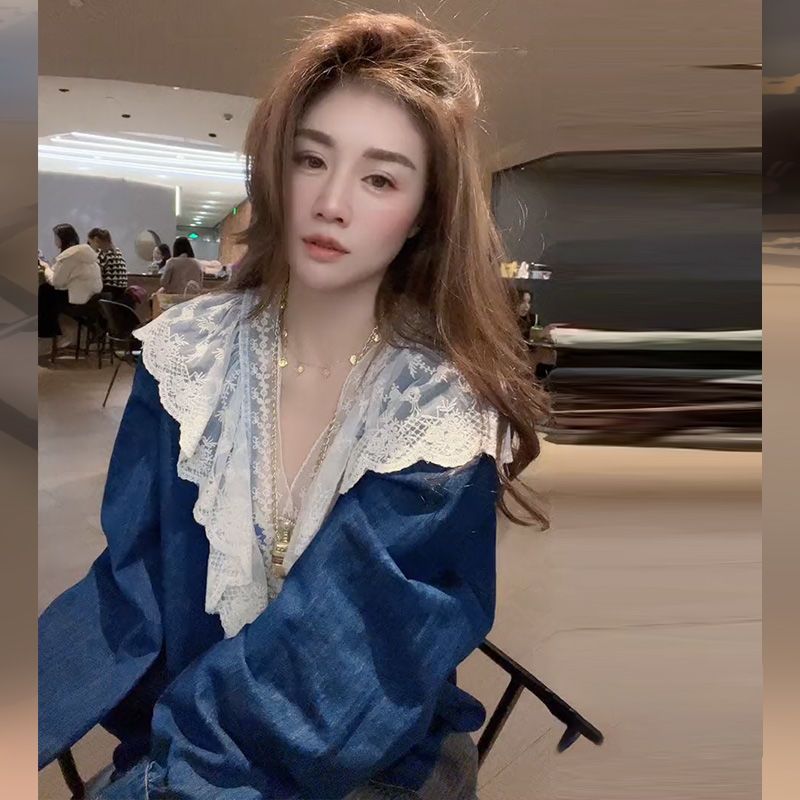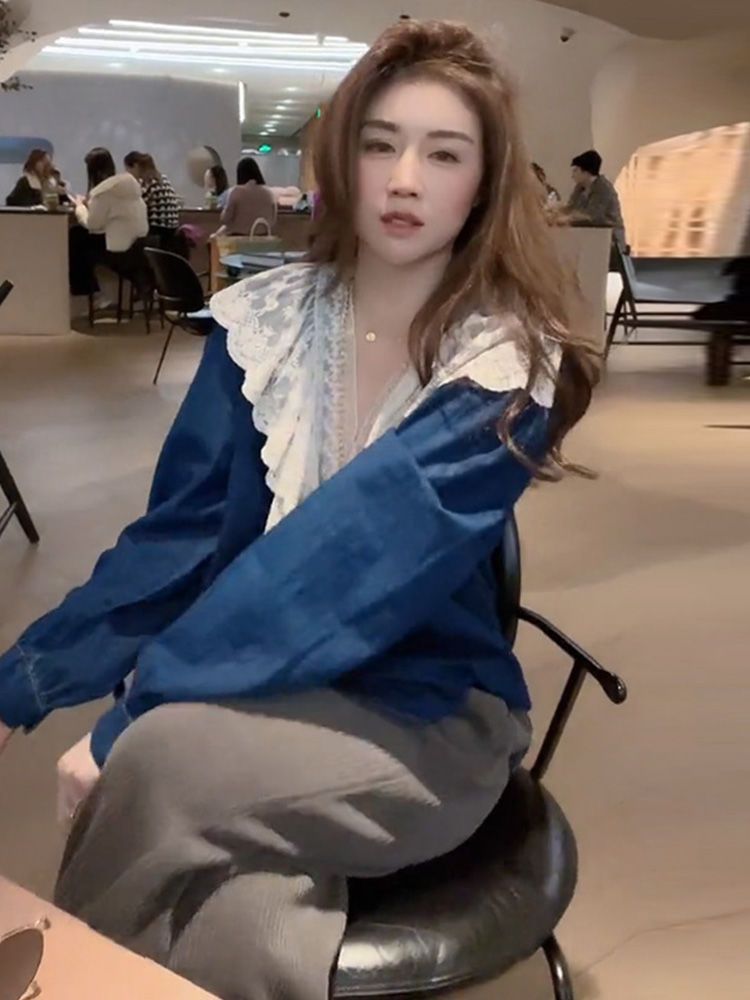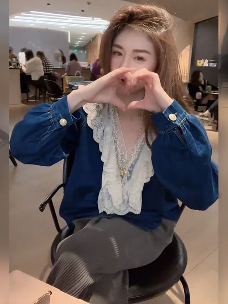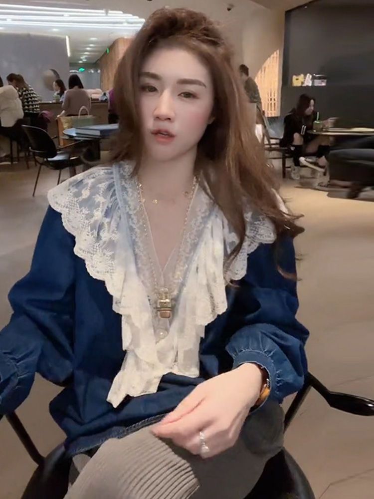 유럽 블루 V 넥 쉬폰 탑 여성 2024 년 봄과 가을 새로운 긴 소매 서양식 하이 엔드 세련된 트렌디 한 작은 셔츠스토어 가기