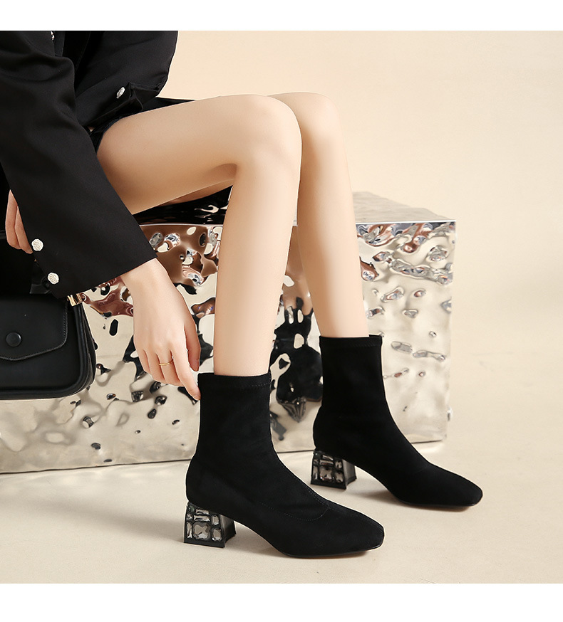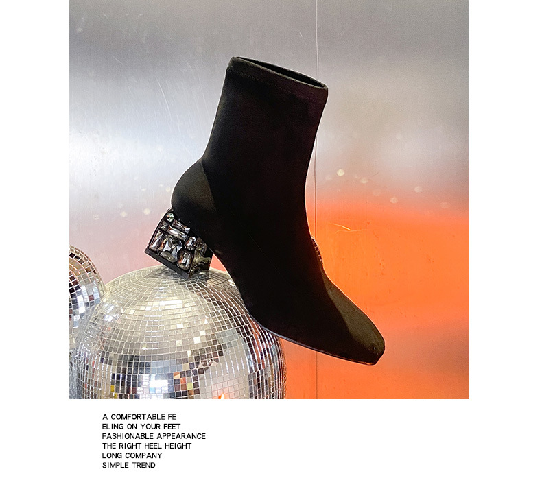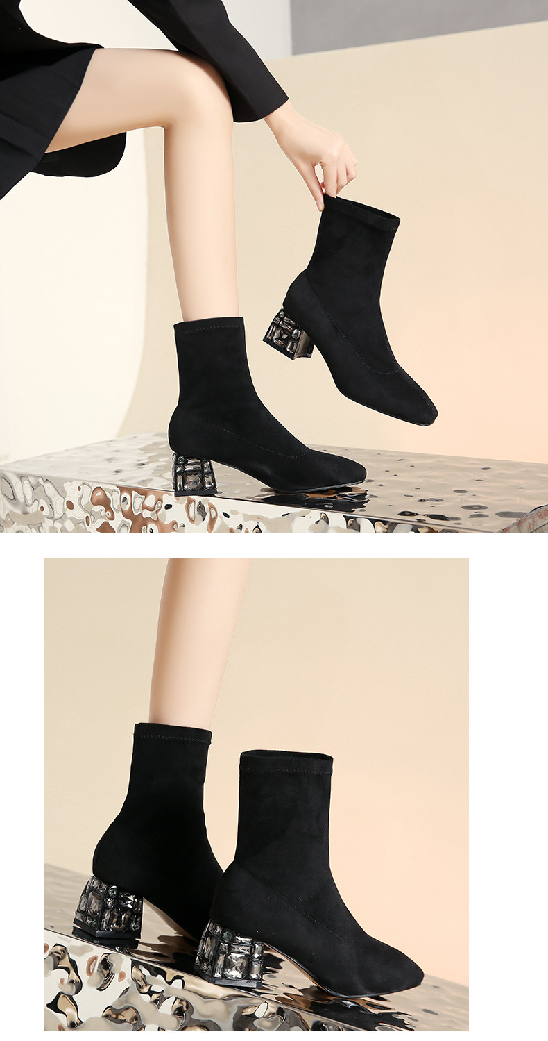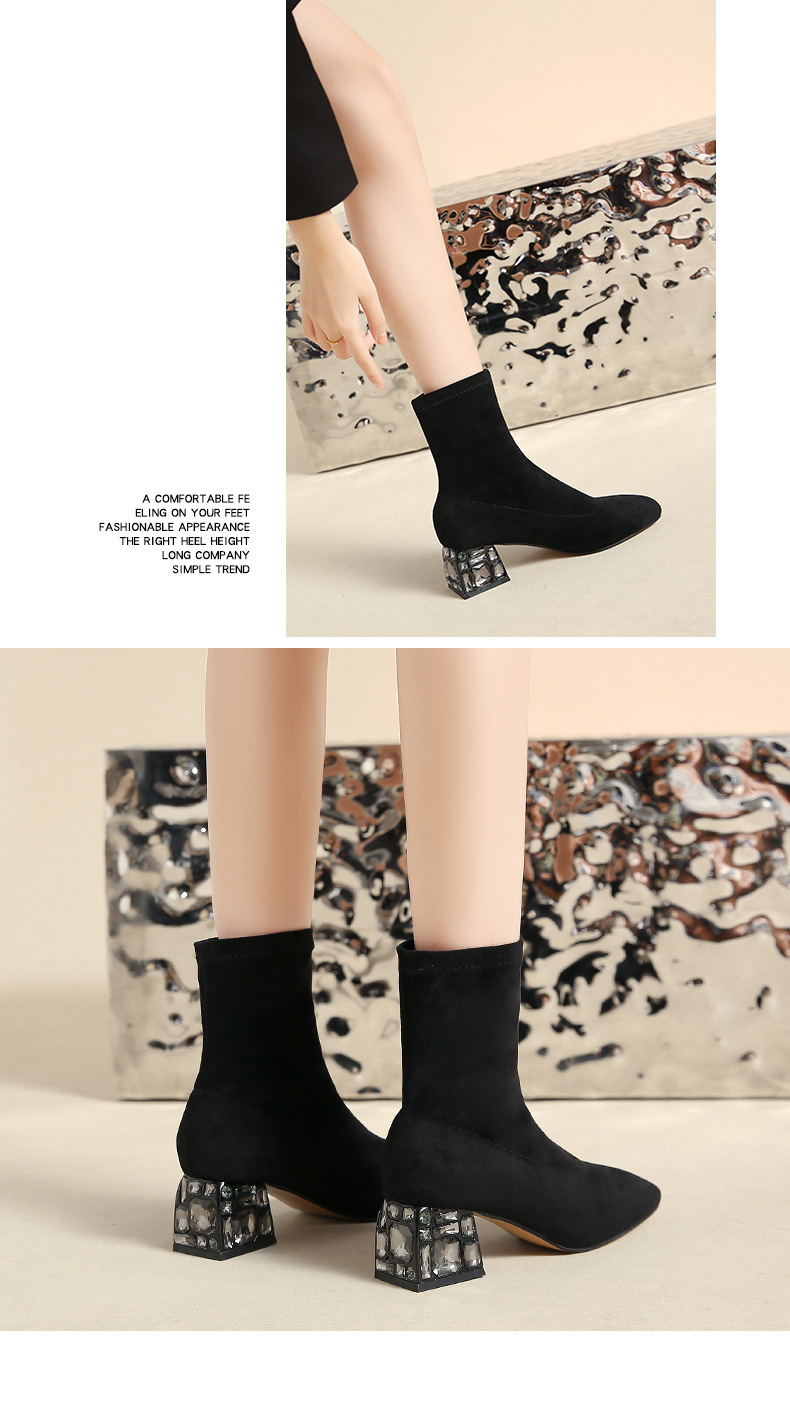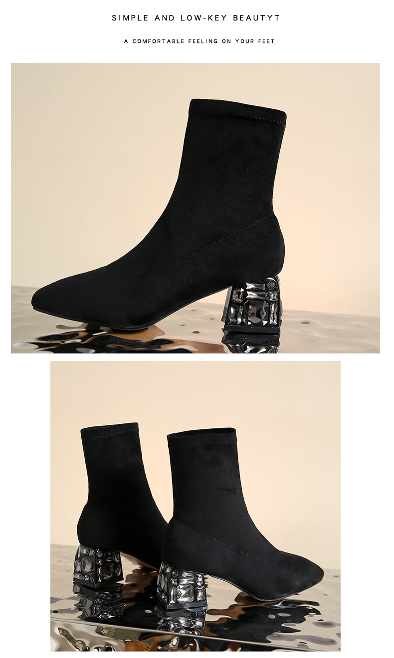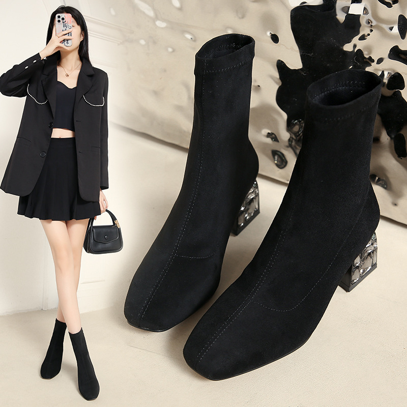 블랙 양말 부츠 여성 2024 가을 겨울 새로운 패션 포인팅 리어 지퍼 하이힐 쇼트 부츠 두꺼운 힐 패션 여성 부츠스토어 가기