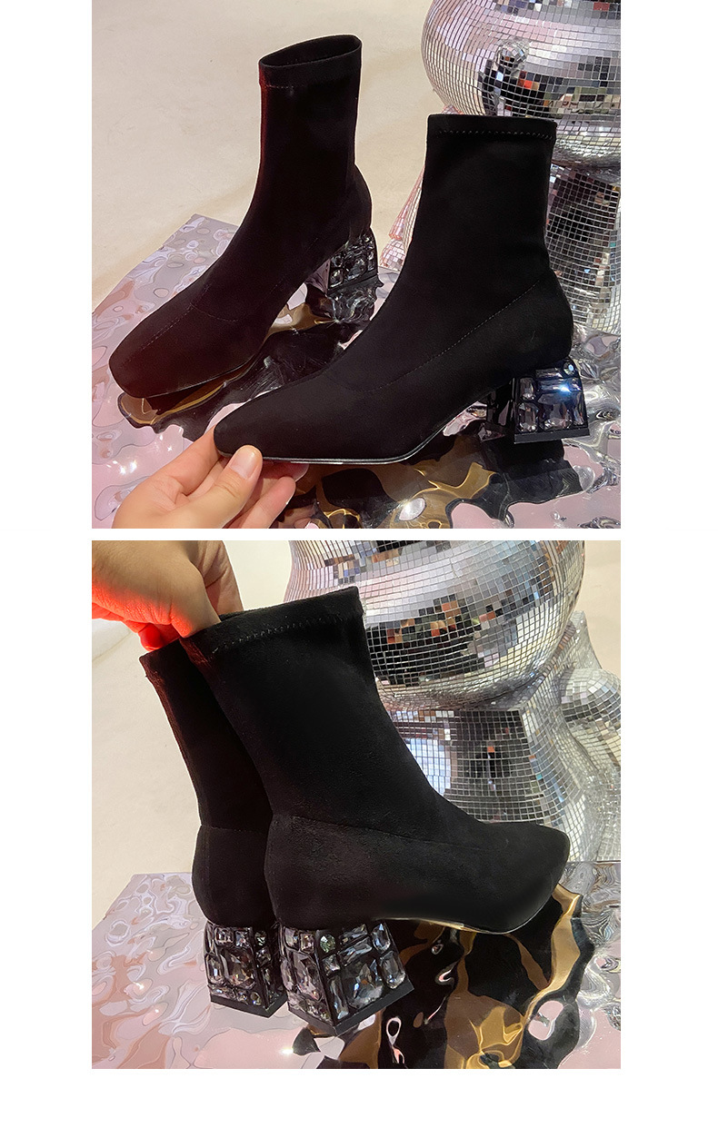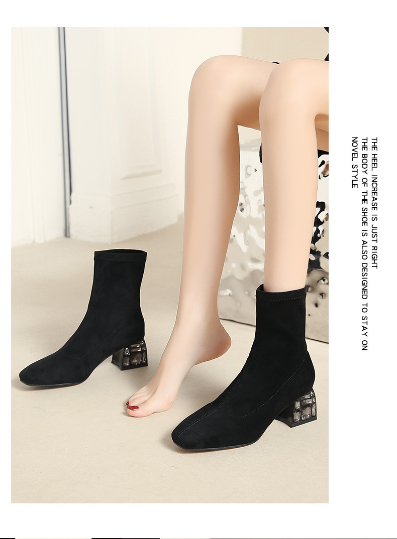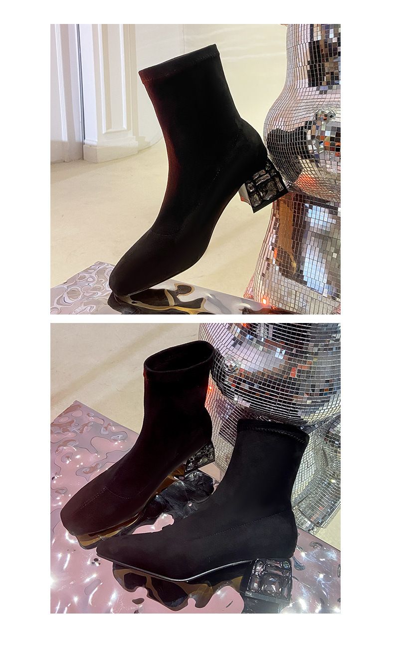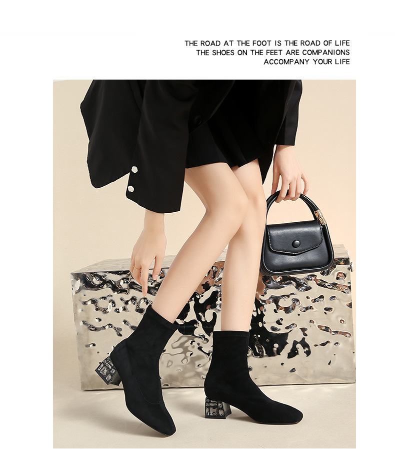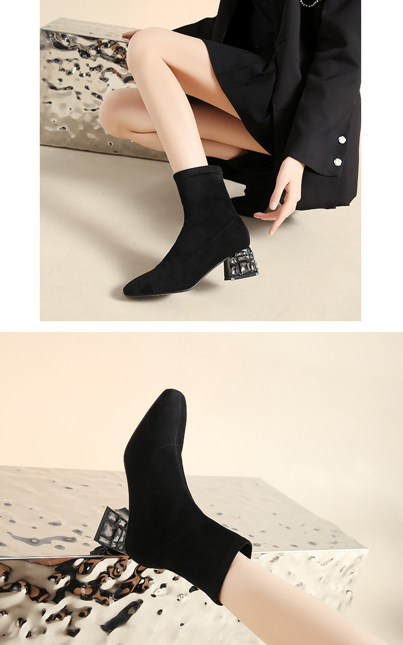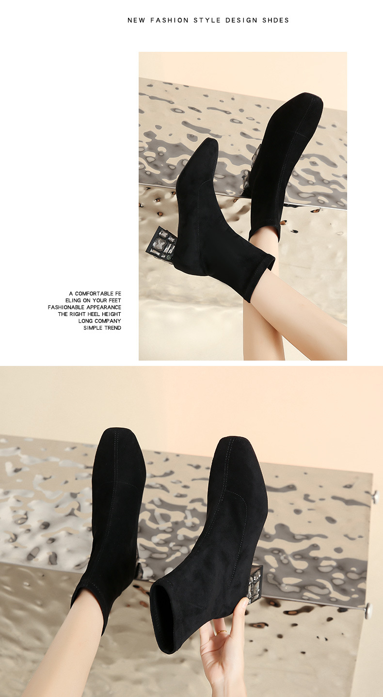 블랙 양말 부츠 여성 2024 가을 겨울 새로운 패션 포인팅 리어 지퍼 하이힐 쇼트 부츠 두꺼운 힐 패션 여성 부츠스토어 가기