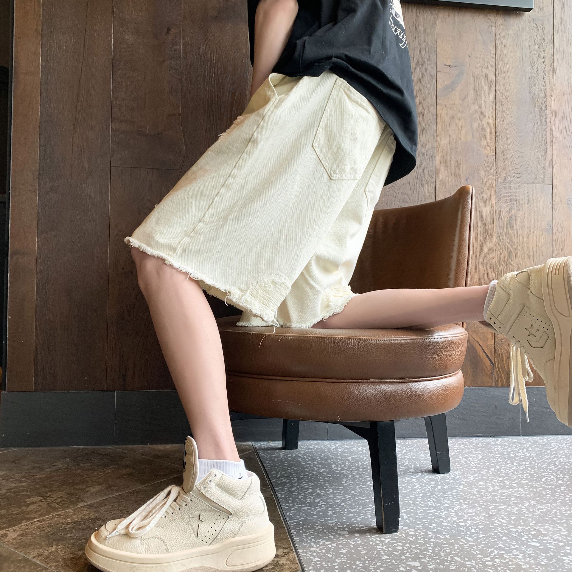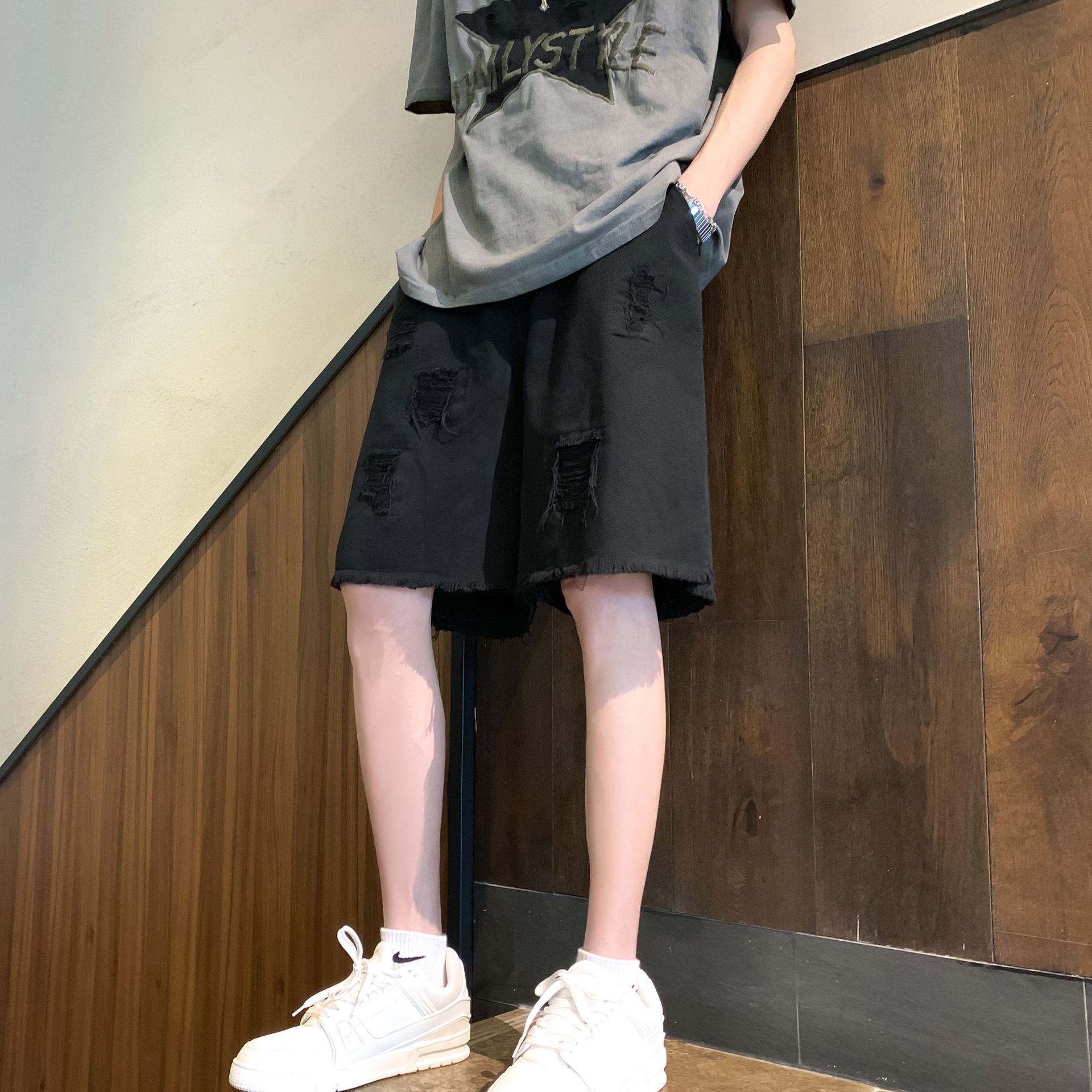 Rhole 데님 반바지 남자 여름 미국 스타일 레트로 트렌디 브랜드 거지 브리치 블랙 램프 가장자리 바지