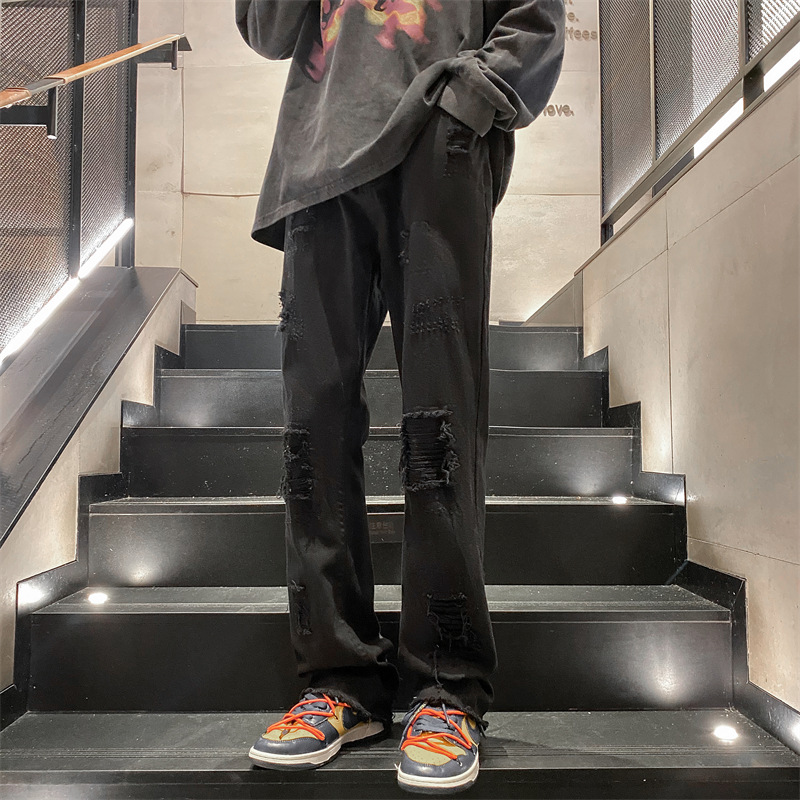유럽과 미국의 프라이드 스트리트 리핑 청바지 남성 봄과 가을 패션 브랜드 하이 스트리트 스트레이트 팬츠 느슨한 올 매치 이퍼 핸섬 바지스토어 가기