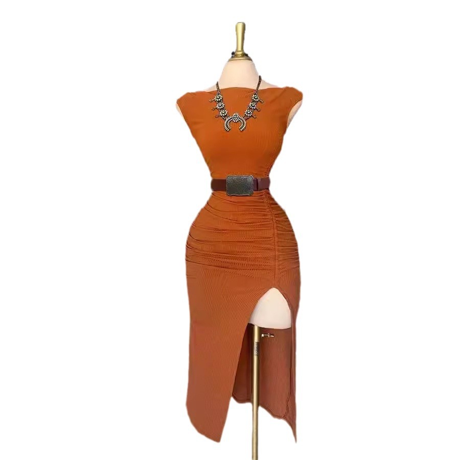 유럽과 미국의 2024 국경 여성 니트 스플릿 슬림 핏 타이트 원피스