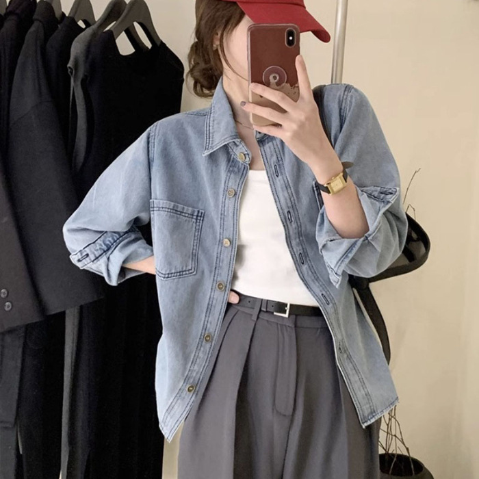 2024 데님 티셔츠 여자 올 매치 루즈 데님 셔츠 캐주얼 셔츠 데님 긴 소매 데님 코트 재킷