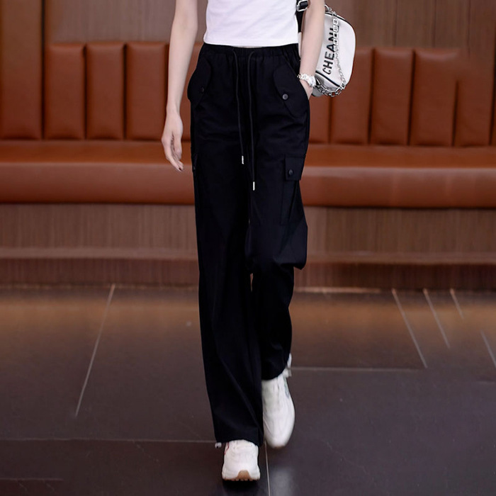 아메리칸 스타일 오버홀 여성 여름 2024 새로운 느슨한 캐주얼 발 등산 스포츠 바지 높은 허리 스트레이트 와이드 다리 바지