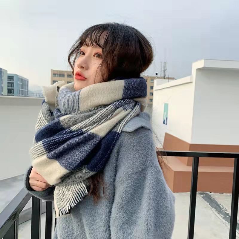 새로운 일본식 블루 스타일 캐시미어 스카프 여성 폭발성 온라인 인기 겨울 여성 겨울 학생 한국식 클래식 격자 무늬