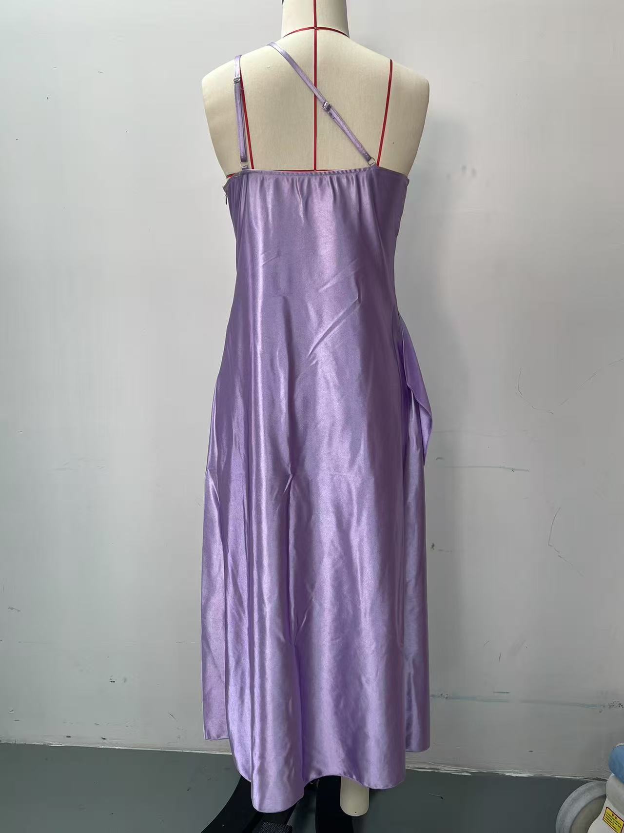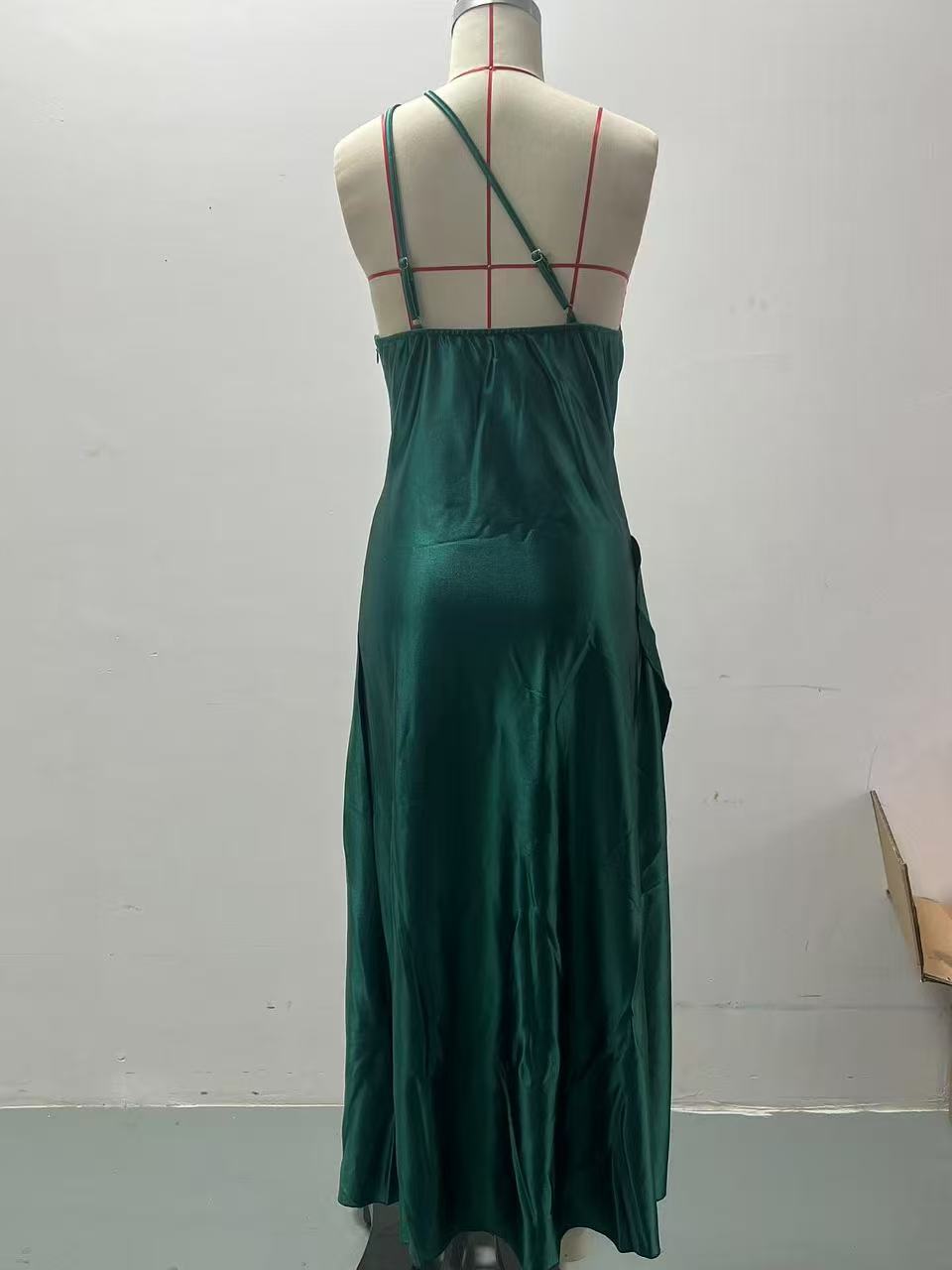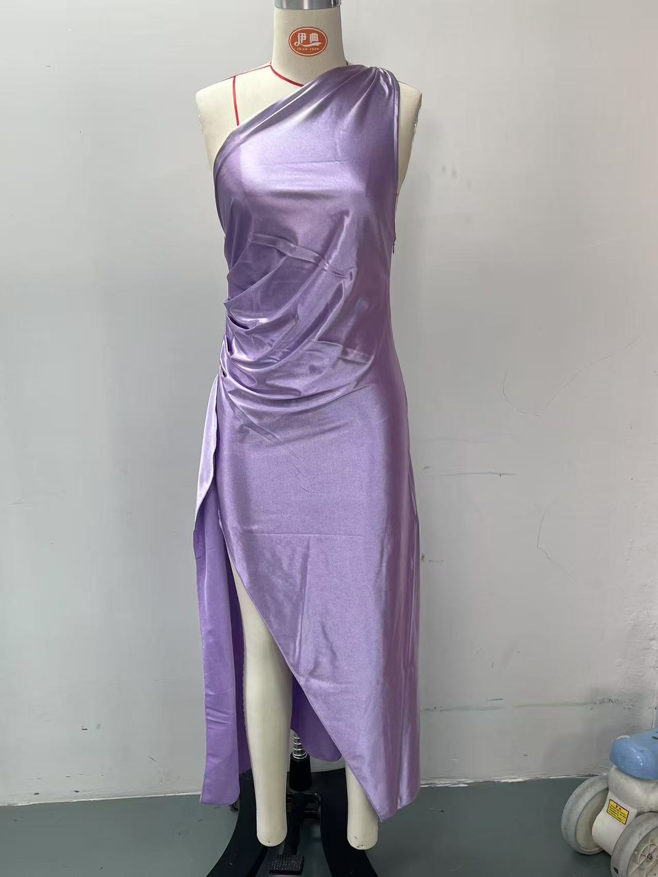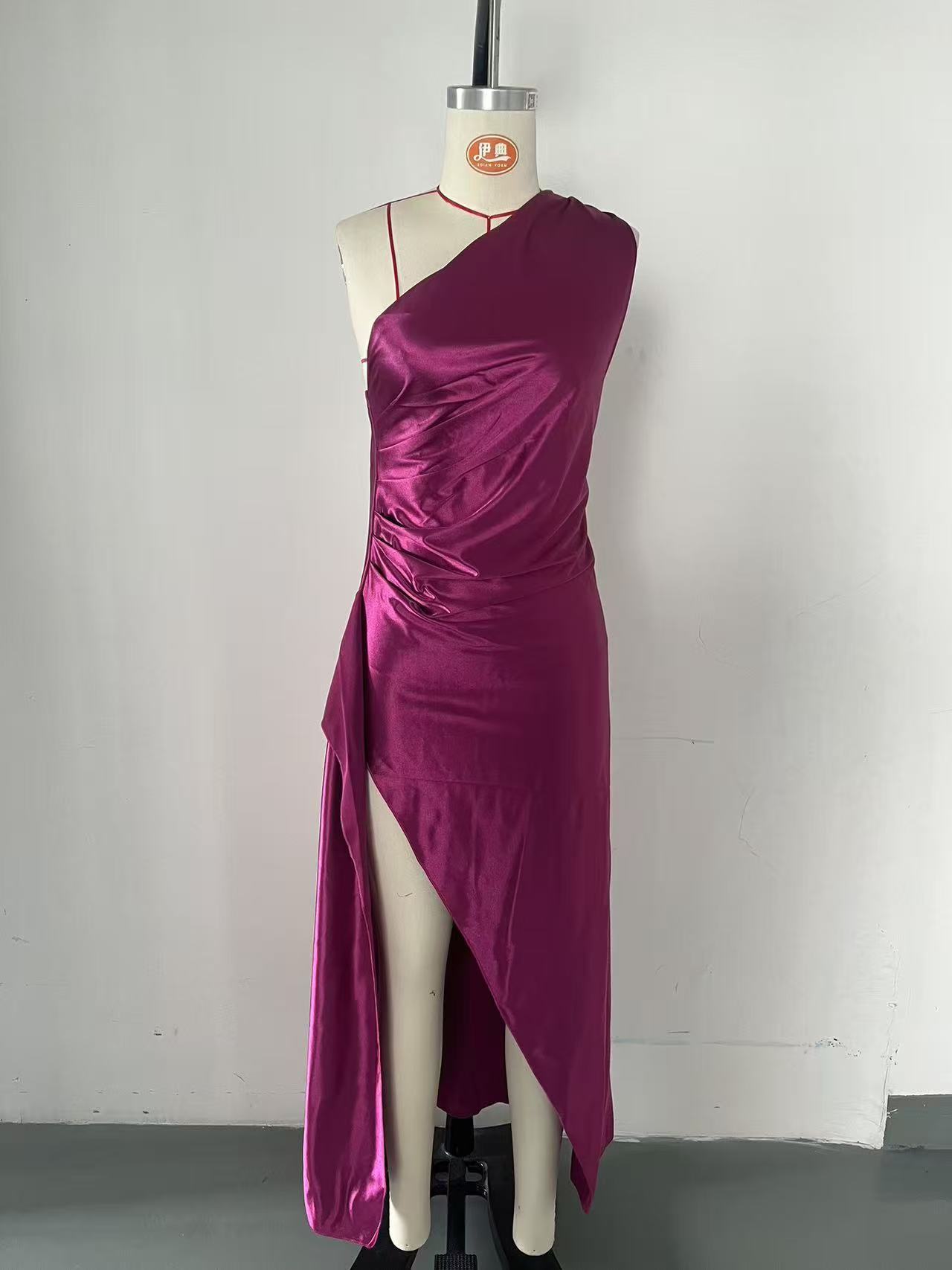 2025년 크로스보더 아마존 원숄더 주름 슬릿 섹시 반팔 새틴 드레스 유럽 및 미국 여름 스타일