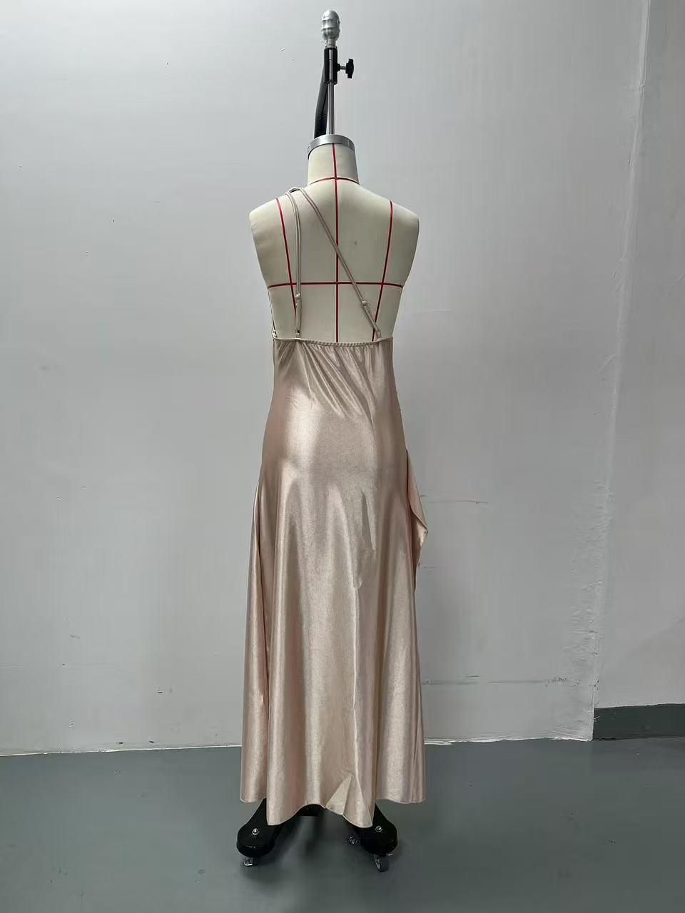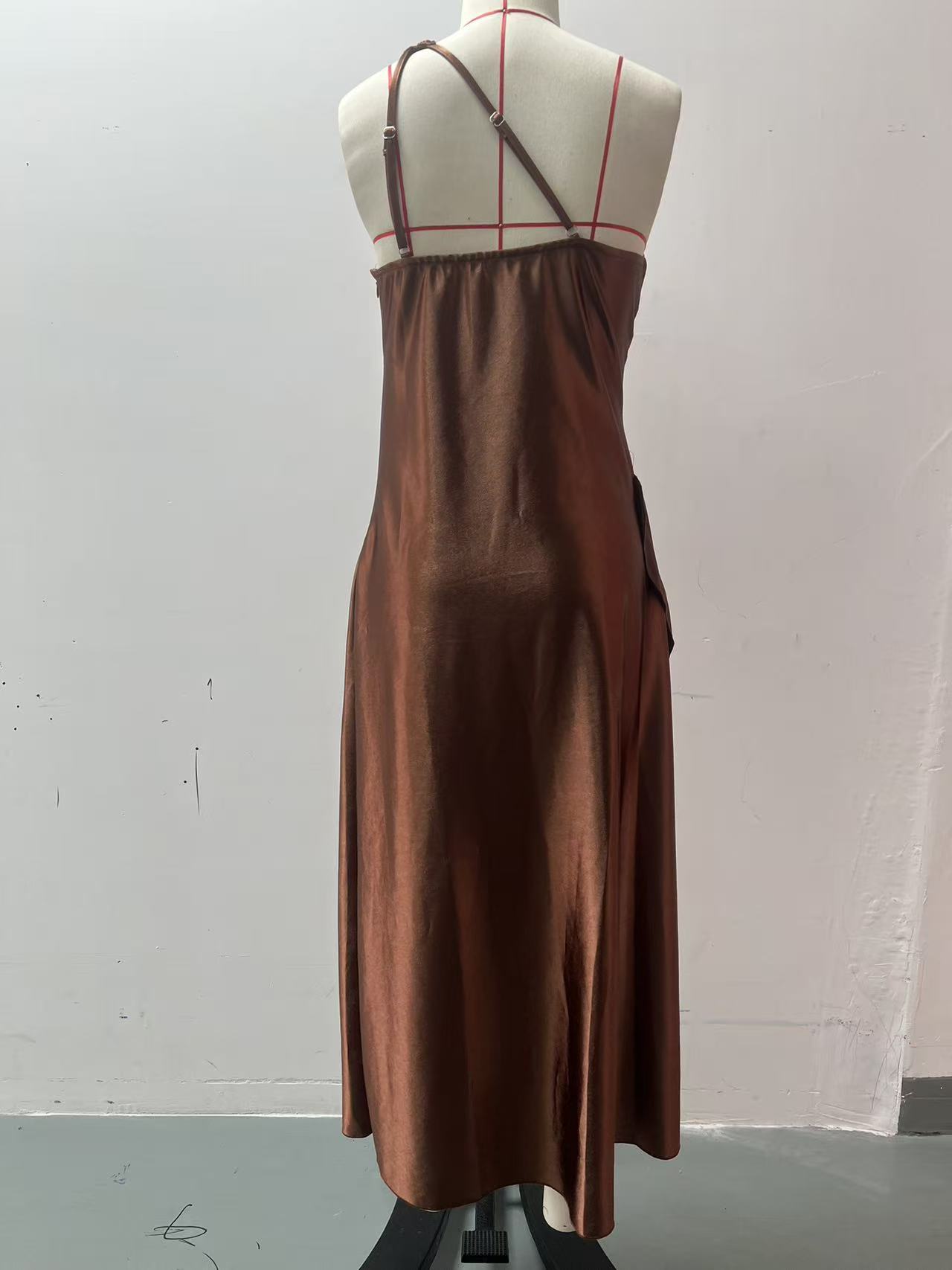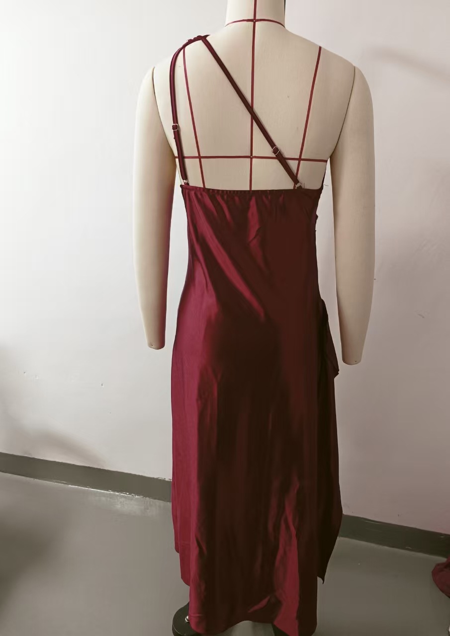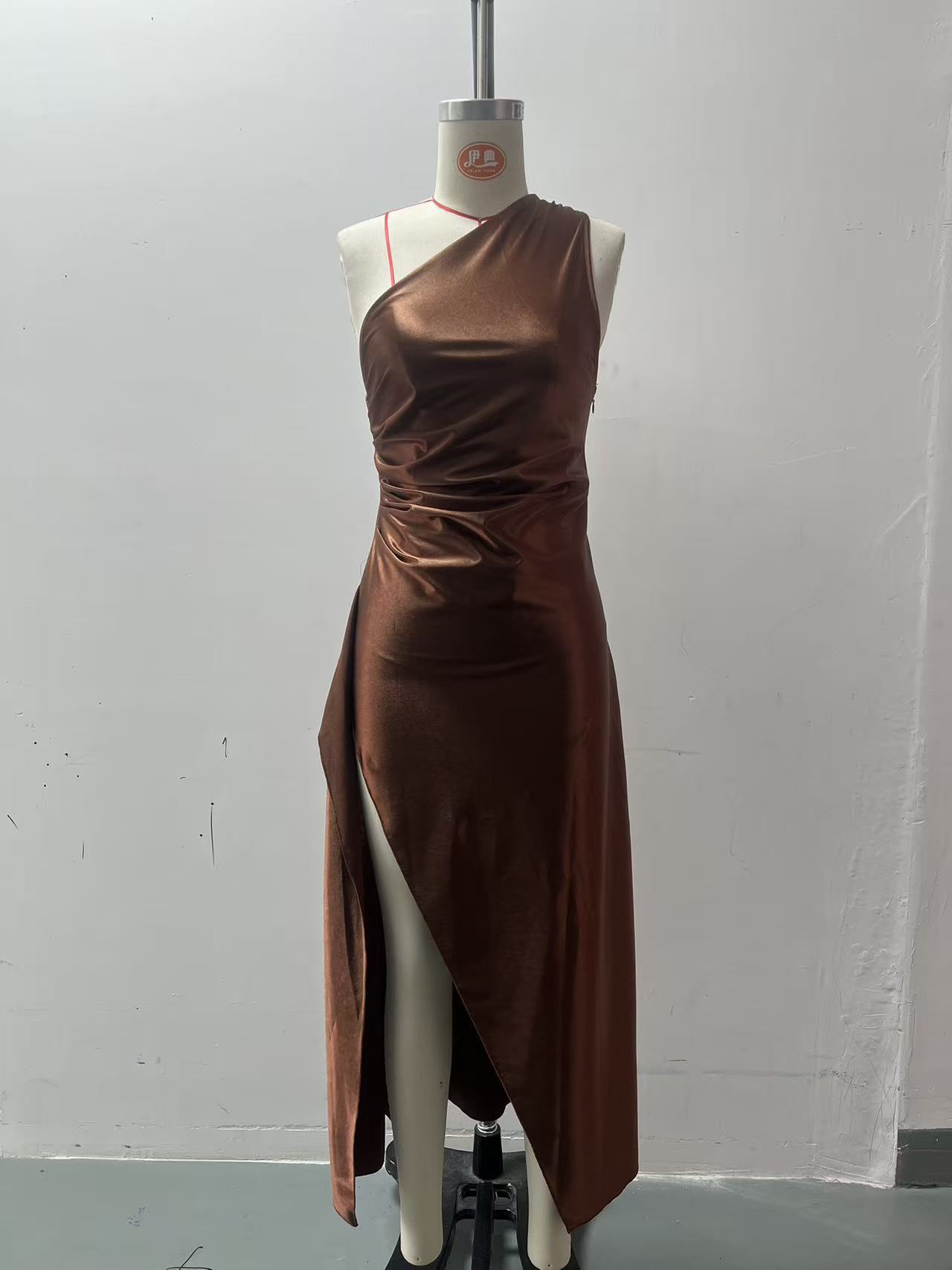 2025년 크로스보더 아마존 원숄더 주름 슬릿 섹시 반팔 새틴 드레스 유럽 및 미국 여름 스타일