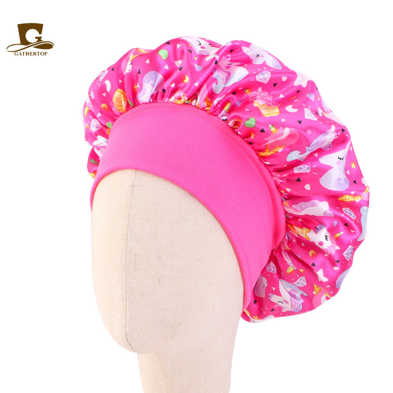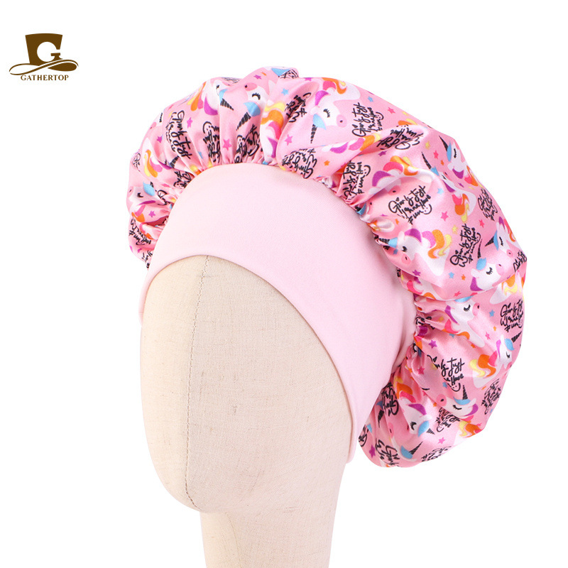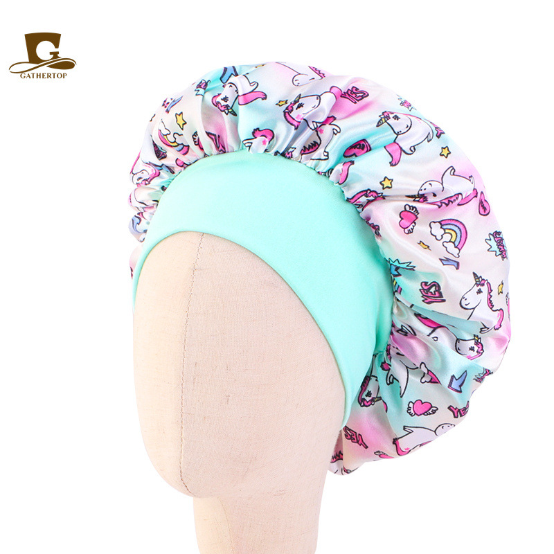 어린이 유니콘 만화 인쇄 사딘 나이트 캡 아기 테이퍼 모자 헤어 컨디셔닝 모자 JDKB-21A-4