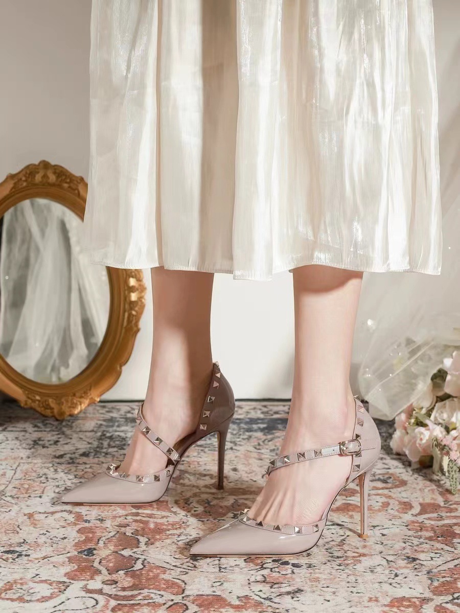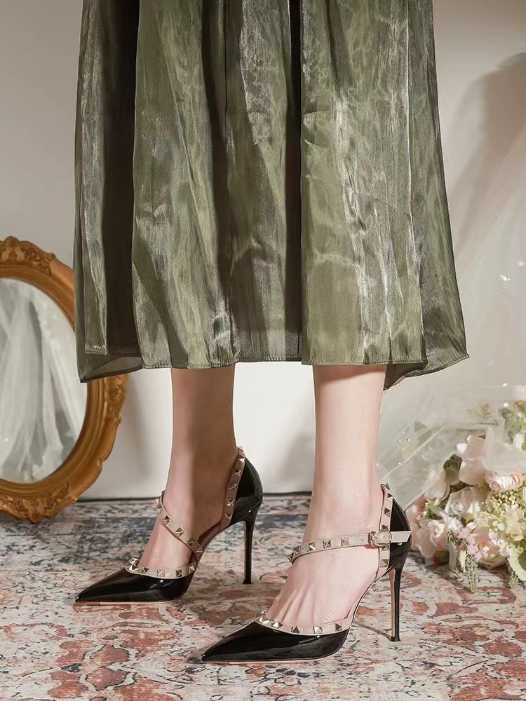 리벳 하이힐 여성 스틸레토 힐 2025 봄과 여름 새로운 패션 지적 발가락 특허 가죽 겉옷 여성을위한 다목적 샌들스토어 가기
