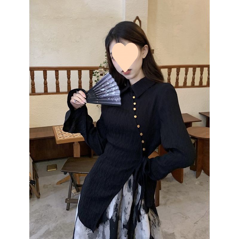 중국 스타일 옷깃 분할 긴 소매 최고 잉크 인쇄 스커트 여성 봄 2024 새로운 패션 세트