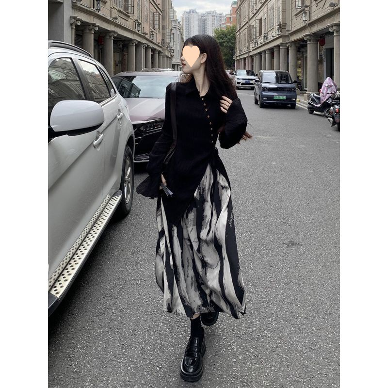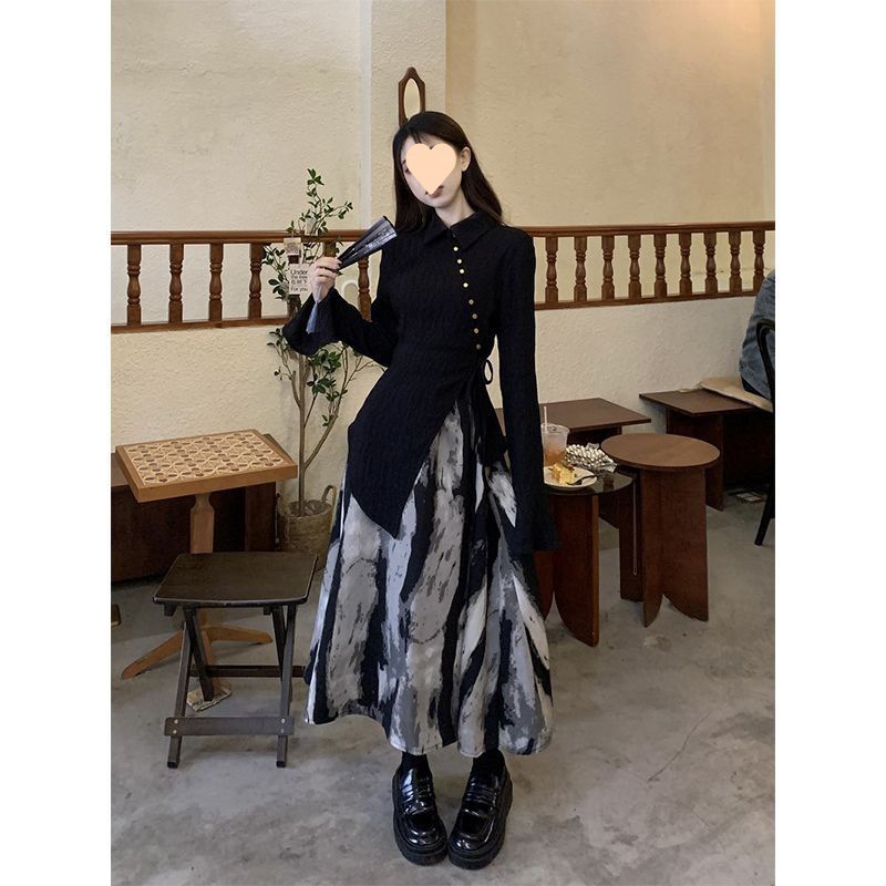 중국 스타일 옷깃 분할 긴 소매 최고 잉크 인쇄 스커트 여성 봄 2024 새로운 패션 세트스토어 가기