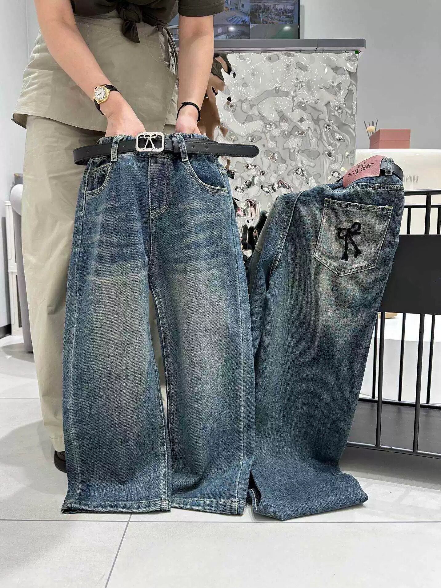 한국 아동복 소녀의 봄과 가을 활 자수 스트레이트 다리 바지 대형 어린이 다크 데님 트렌디 소프트 바지스토어 가기