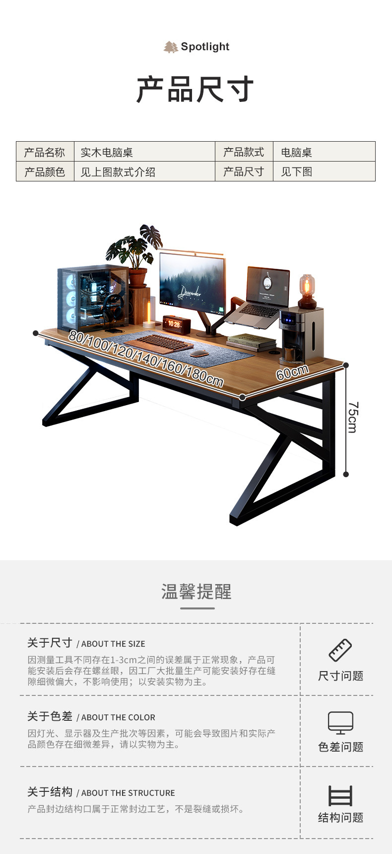 • 라이트 월넛 컬러 80*60*75CM [30MM 전체 원목 데스크탑-50MM 두꺼운 강철 다리]