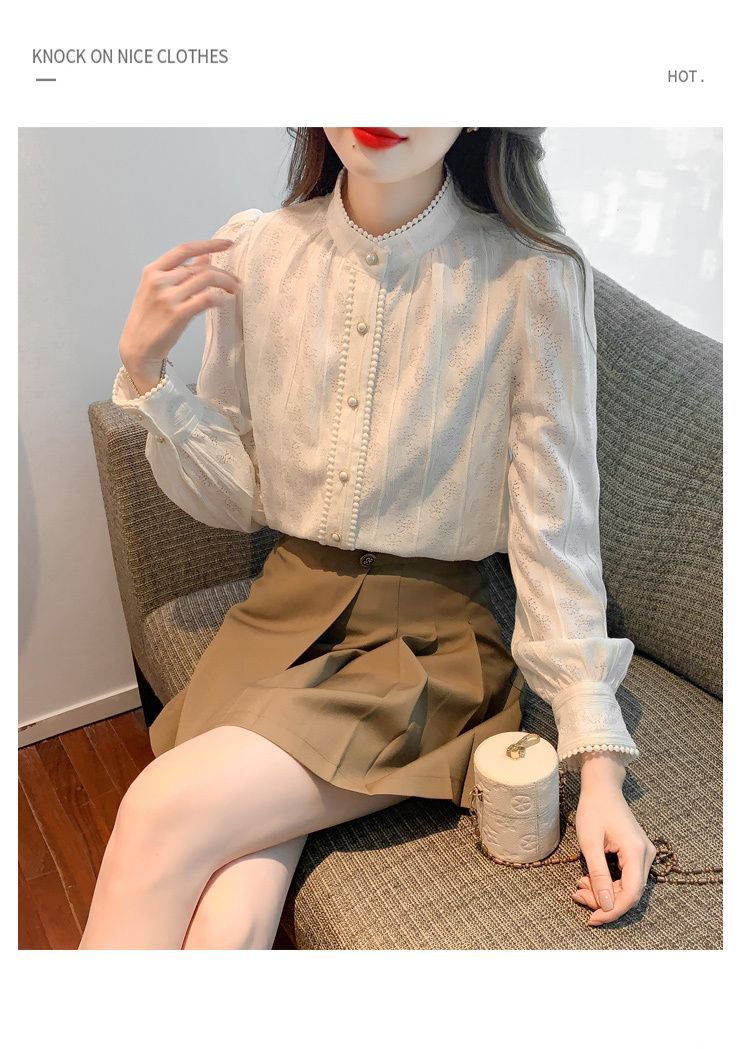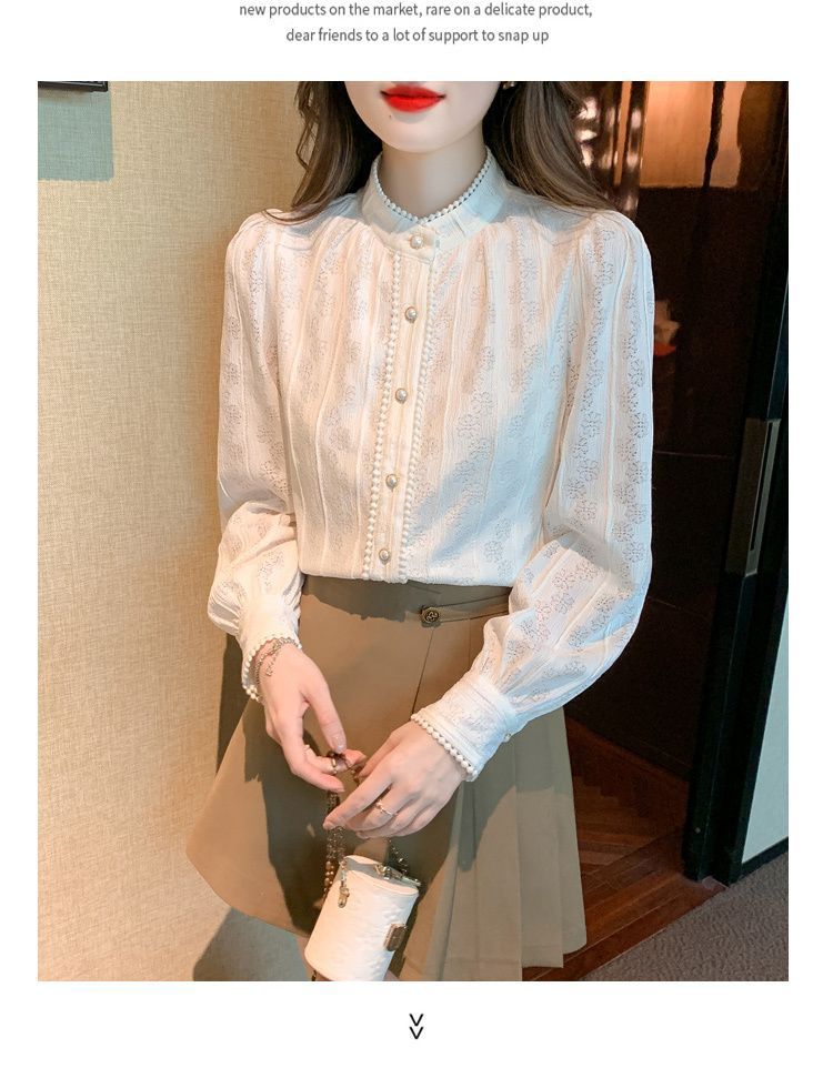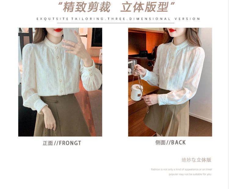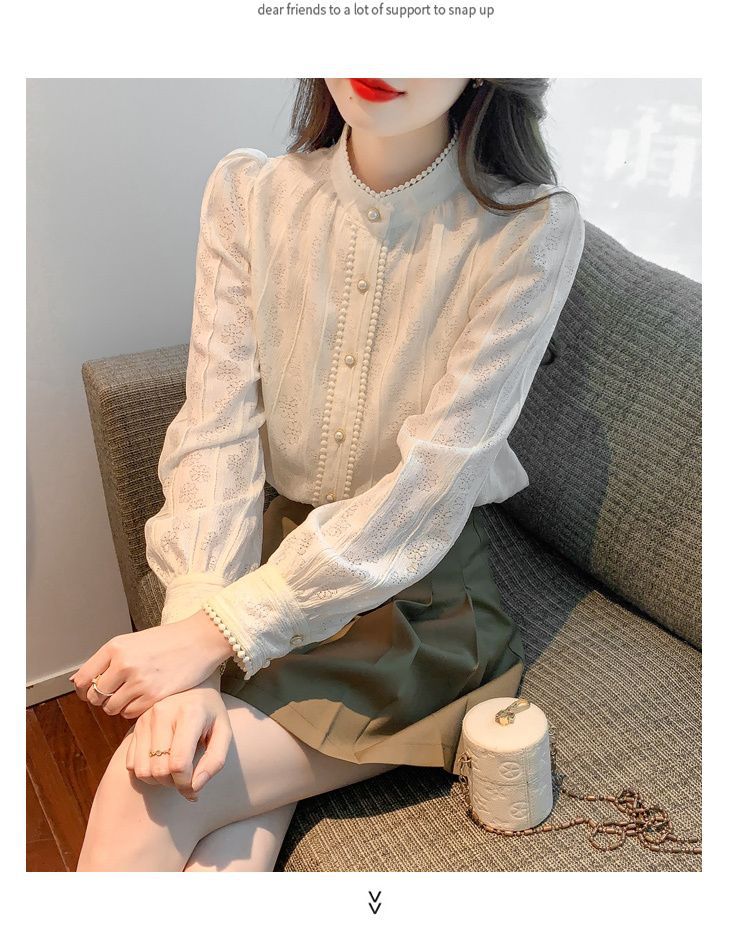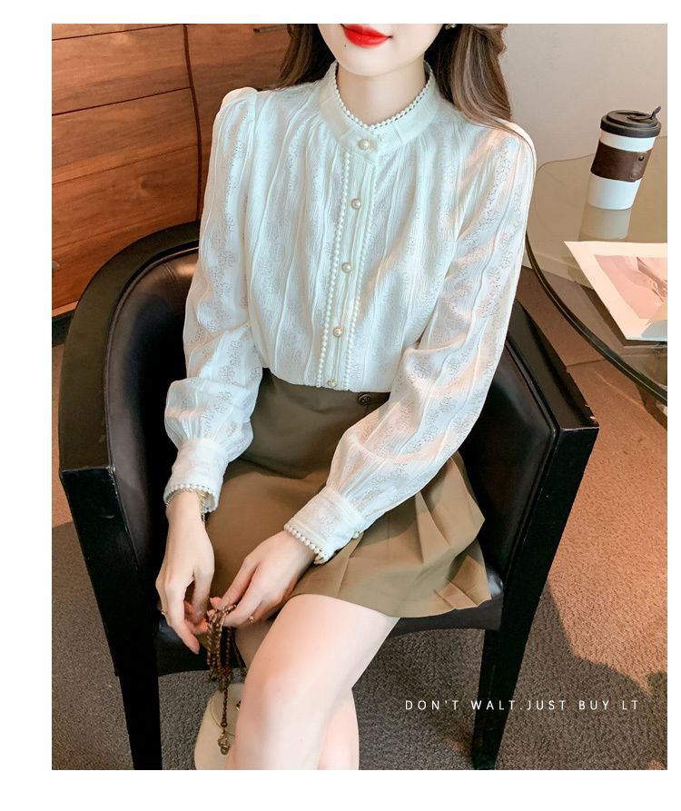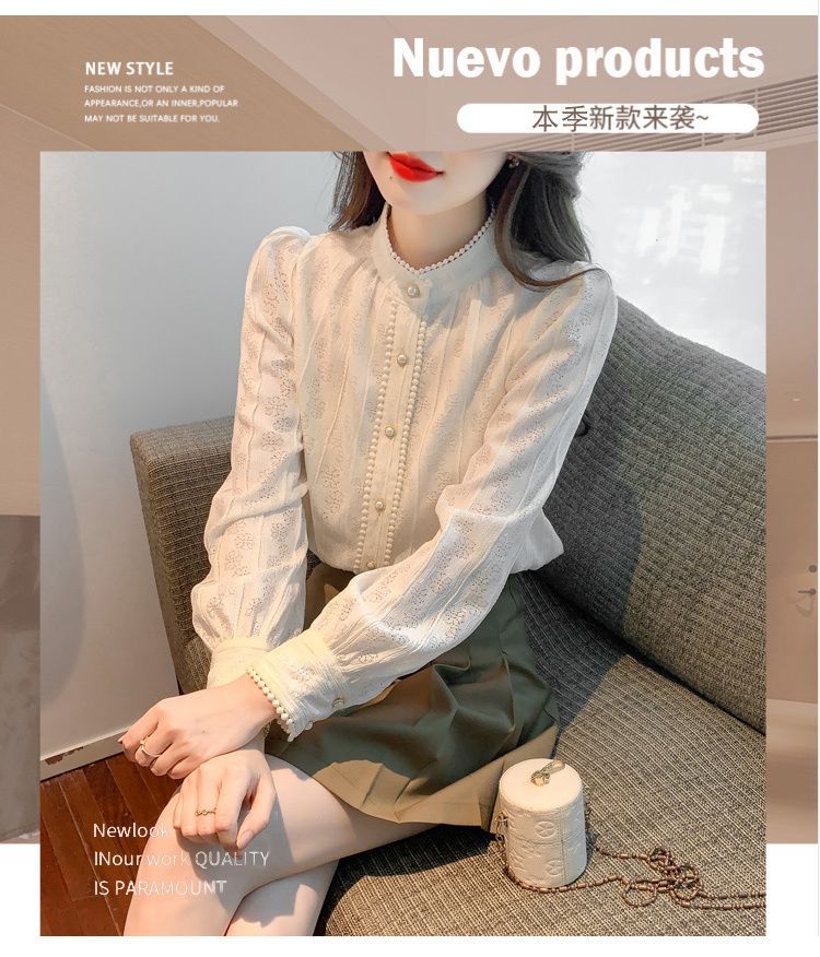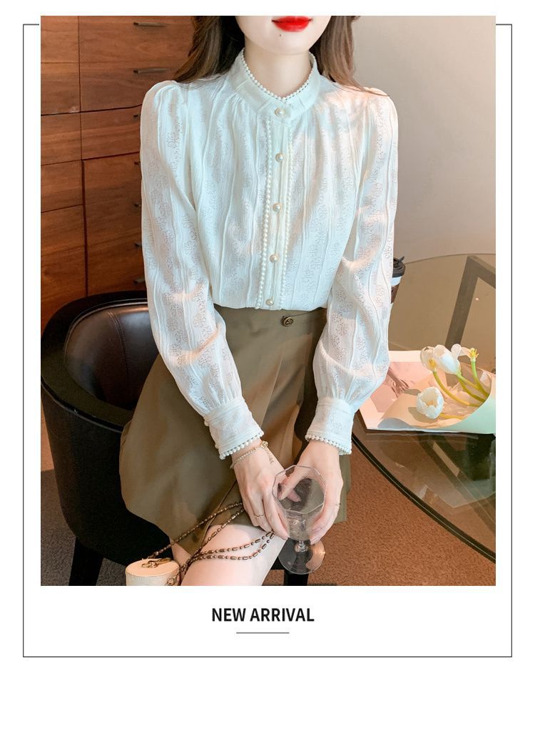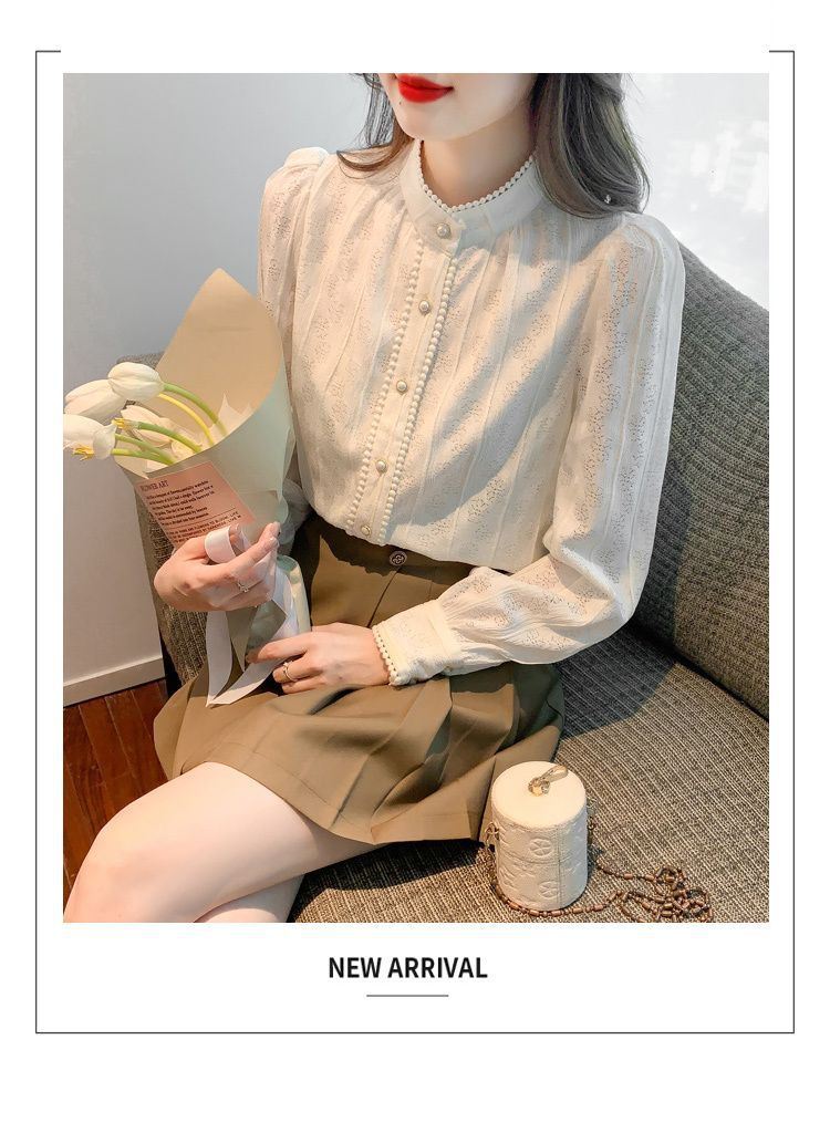 여성의 봄과 가을 스타일 레이스베이스 셔츠 수직 칼라 긴 소매 쉬폰 탑 2024 새로운 아우터웨어 셔츠스토어 가기