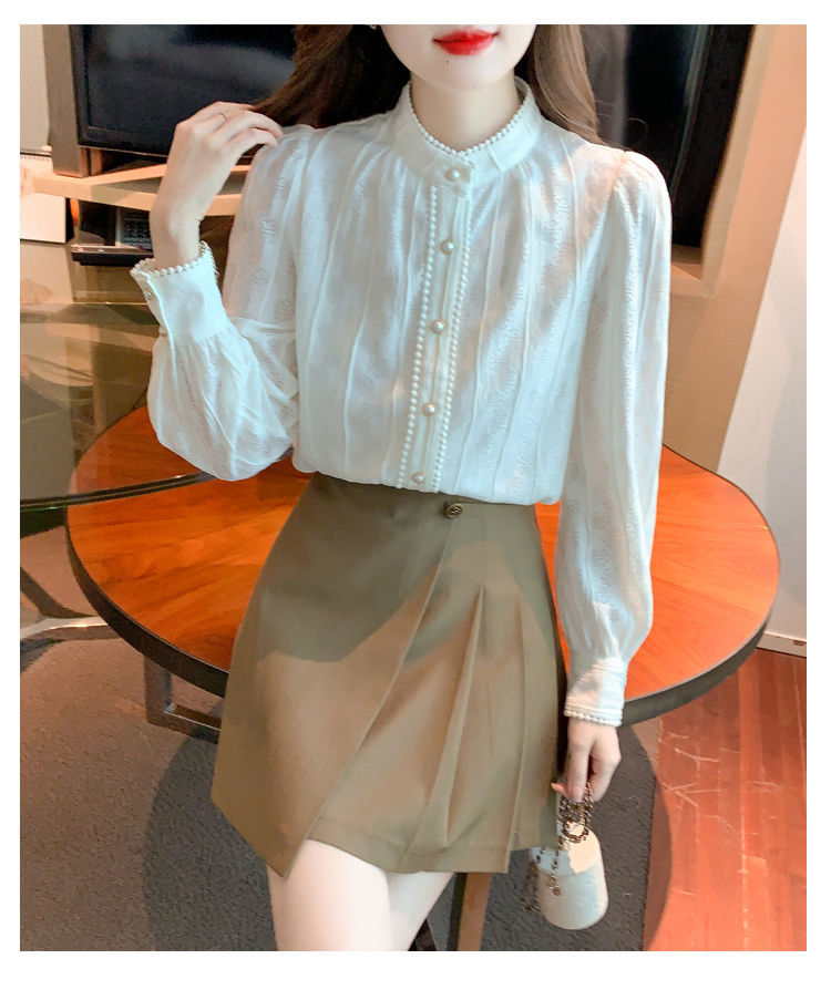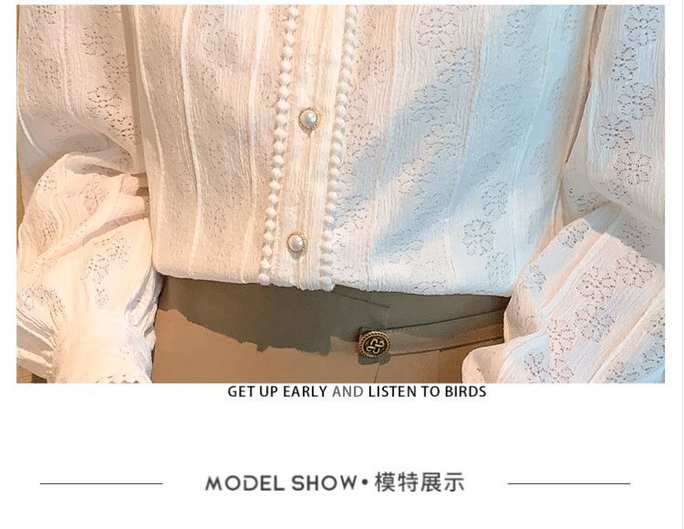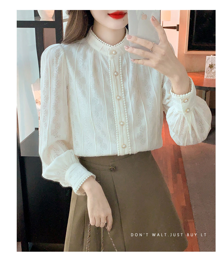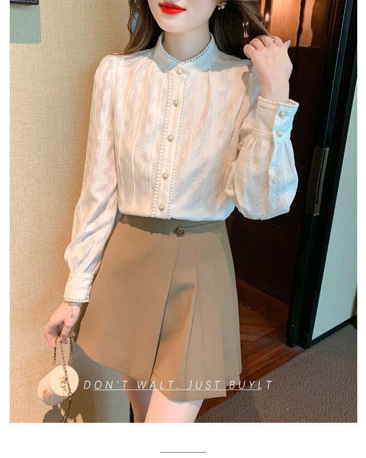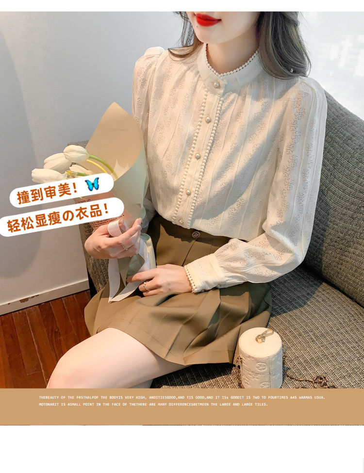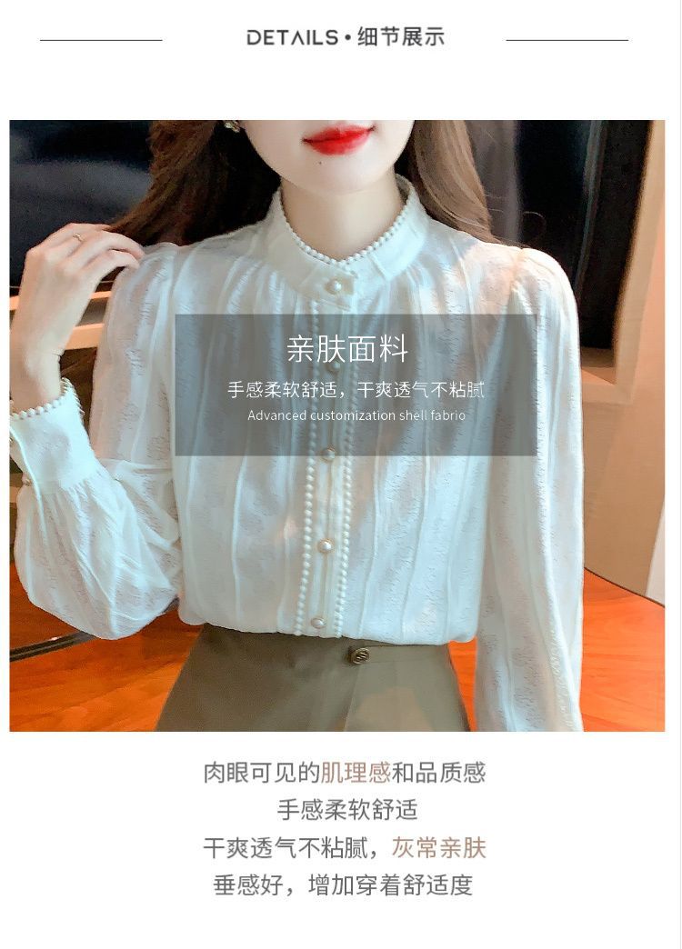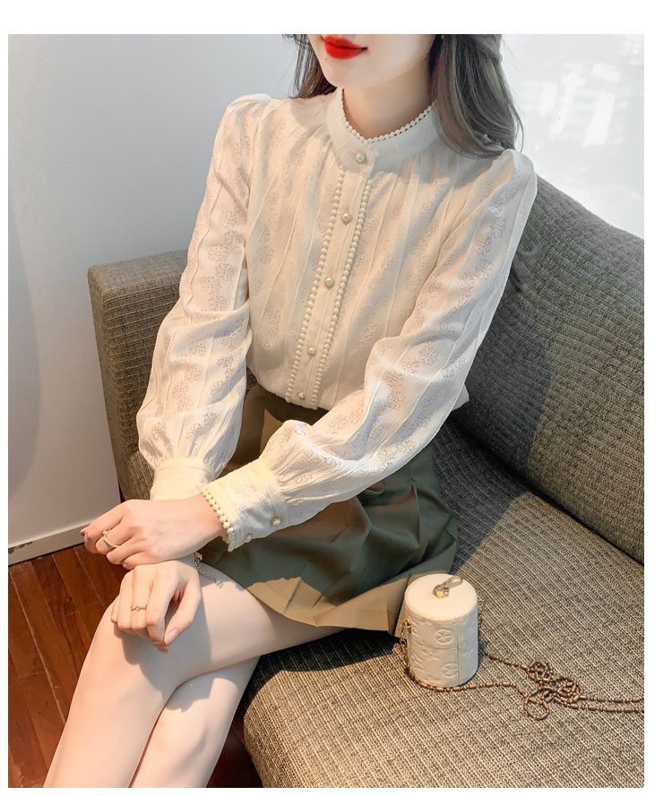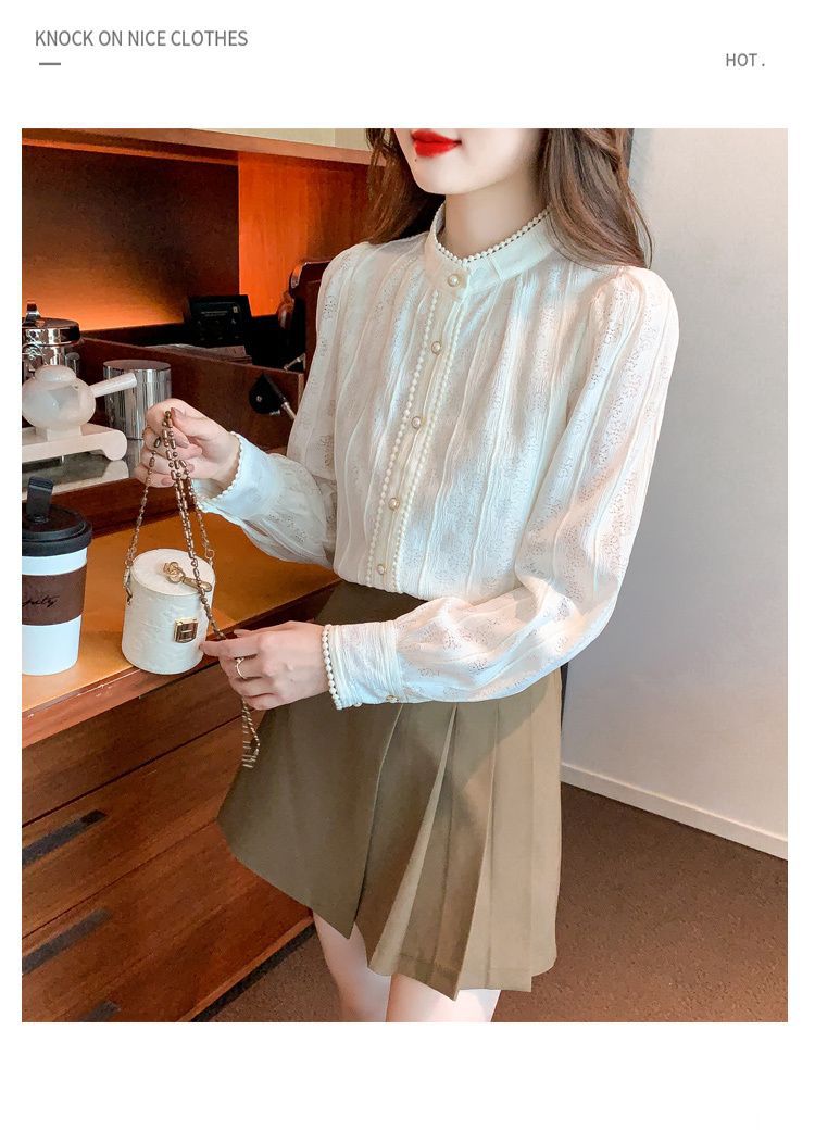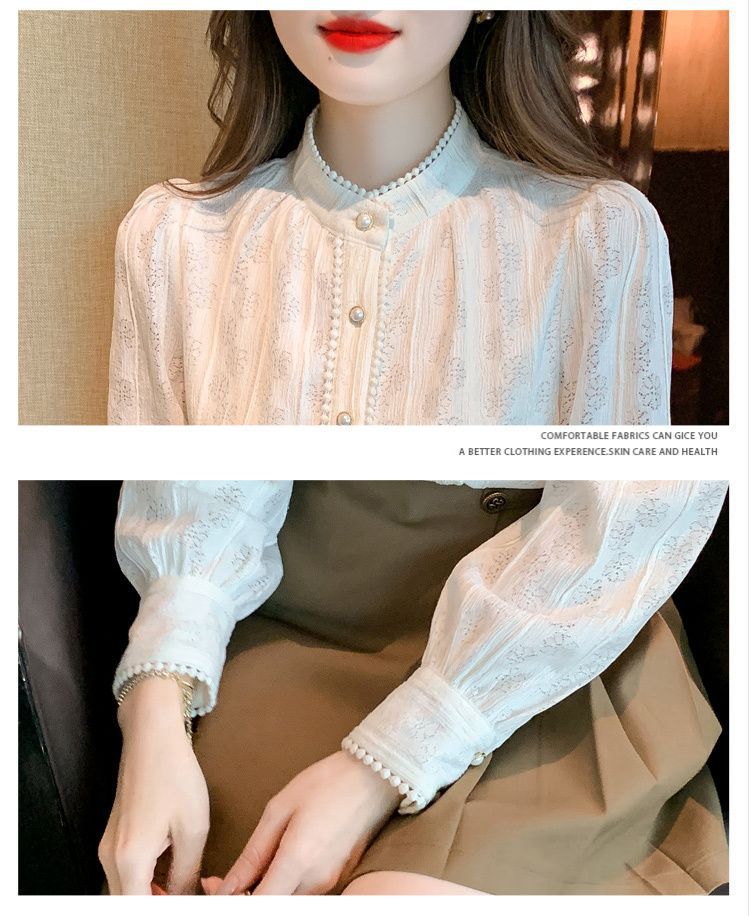 여성의 봄과 가을 스타일 레이스베이스 셔츠 수직 칼라 긴 소매 쉬폰 탑 2024 새로운 아우터웨어 셔츠스토어 가기