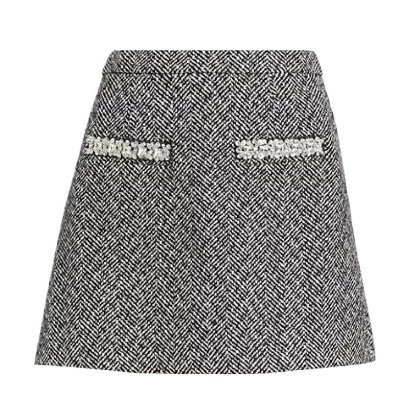회색 헤링본 라운드넥 긴팔 재킷과 A라인 미니스커트로 구성된 투피스 세트, 미우 스타일, 스커트만