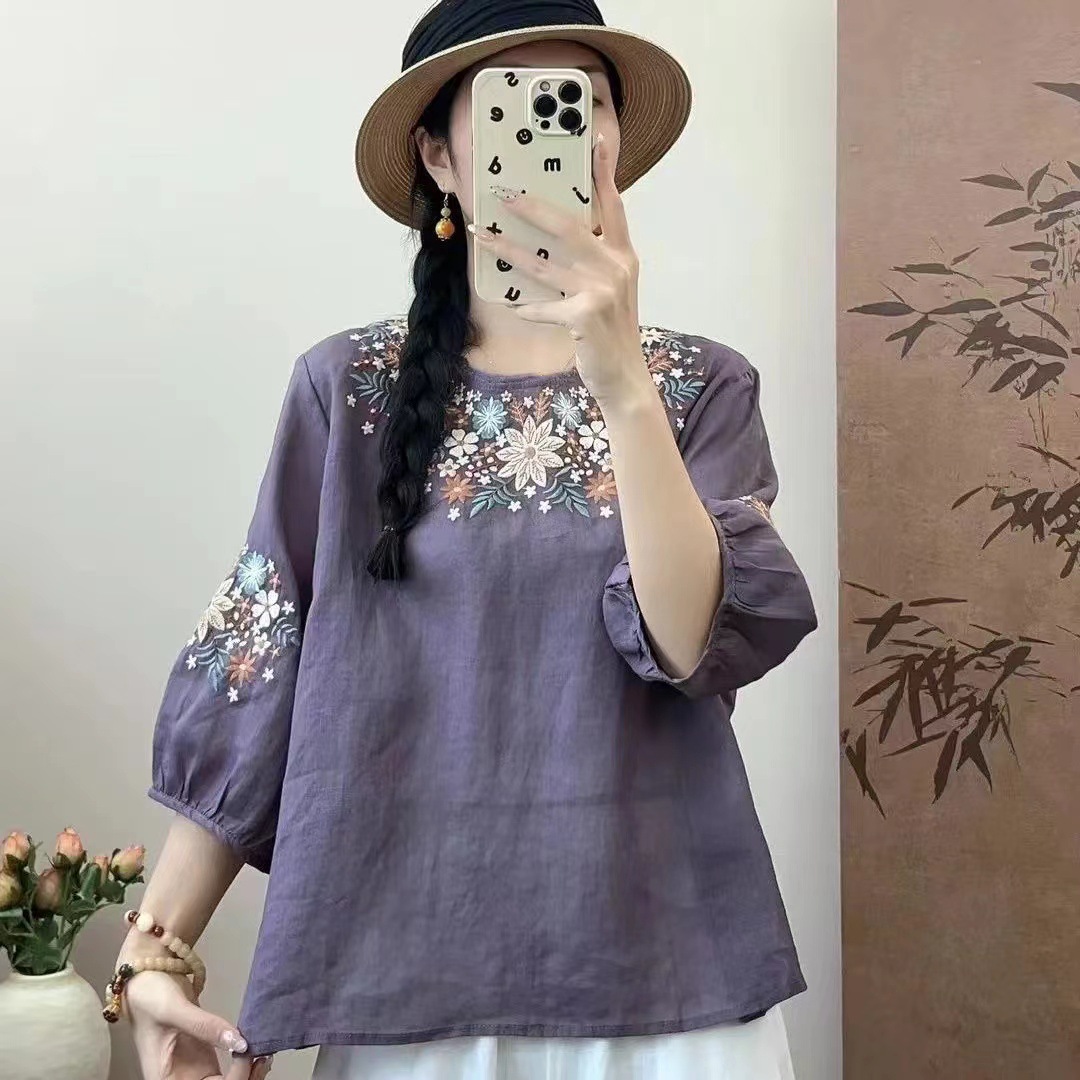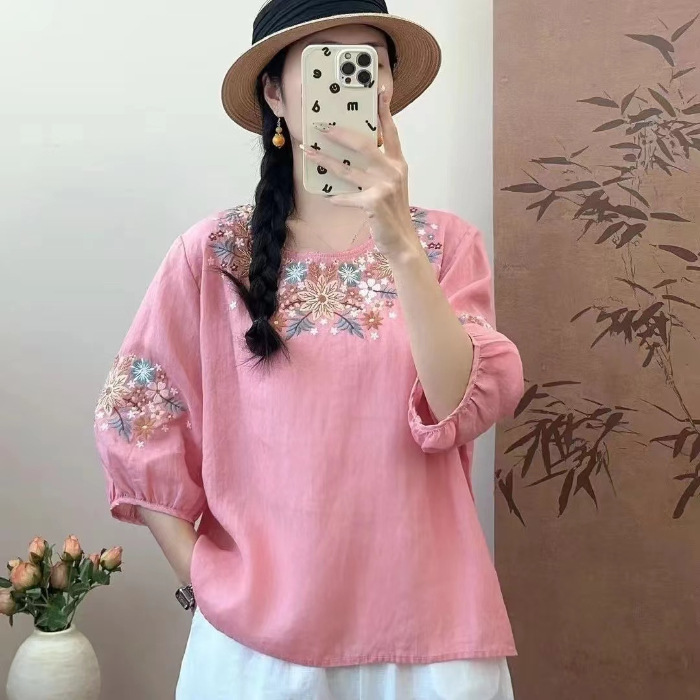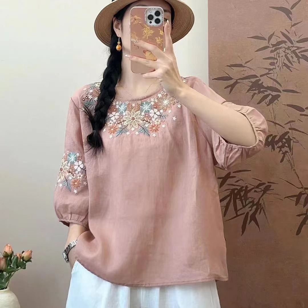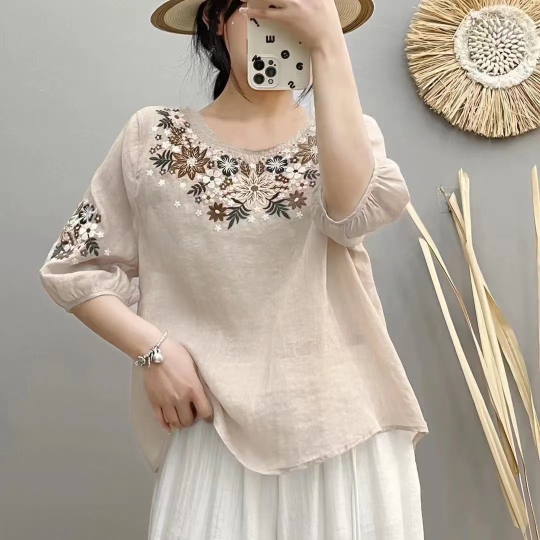 2024 중공업 자수 패션 세븐 슬리브 티셔츠 여름 느슨한 면화 둥근 목 풀오버 셔츠 최고 여성 탑