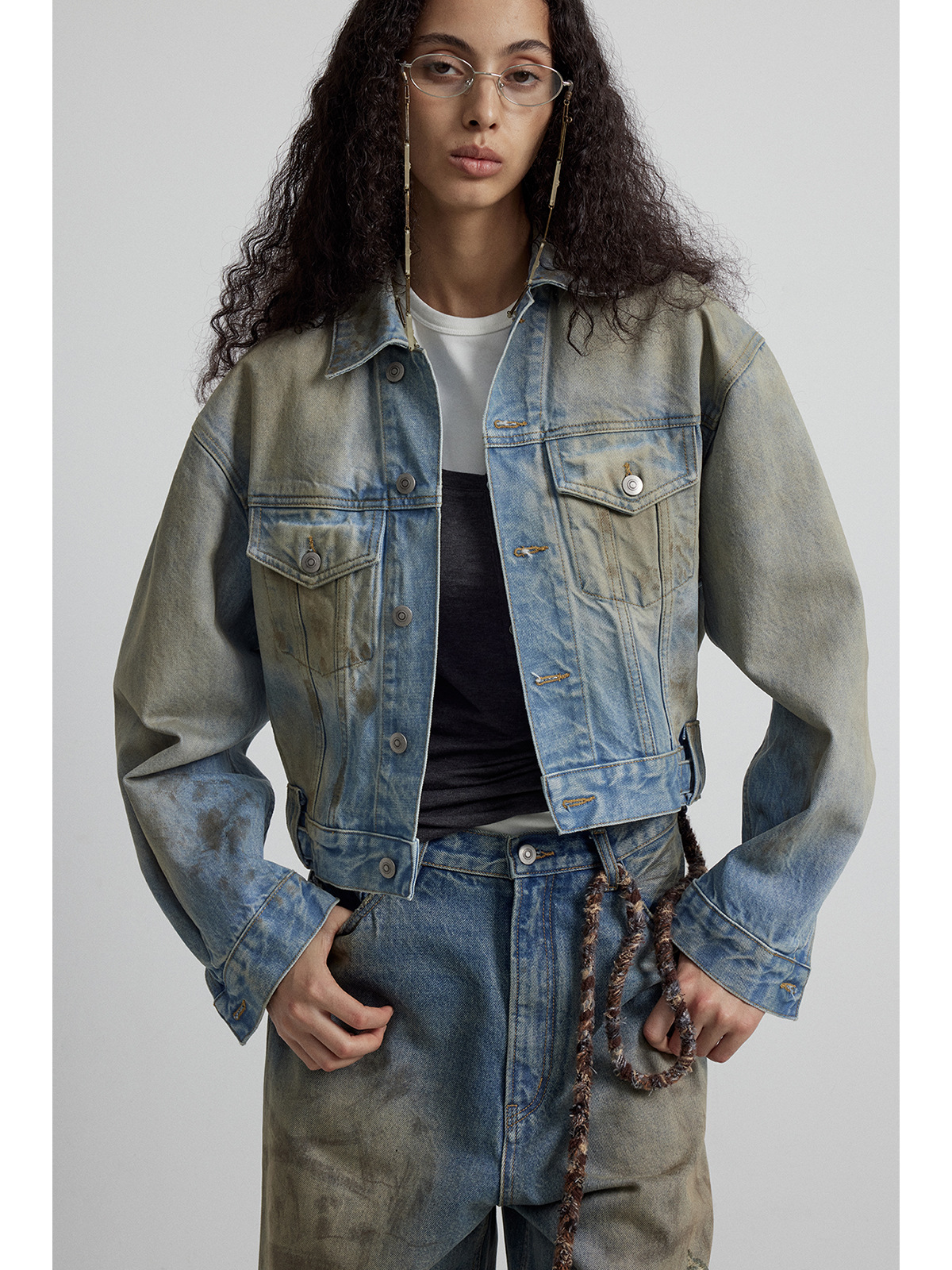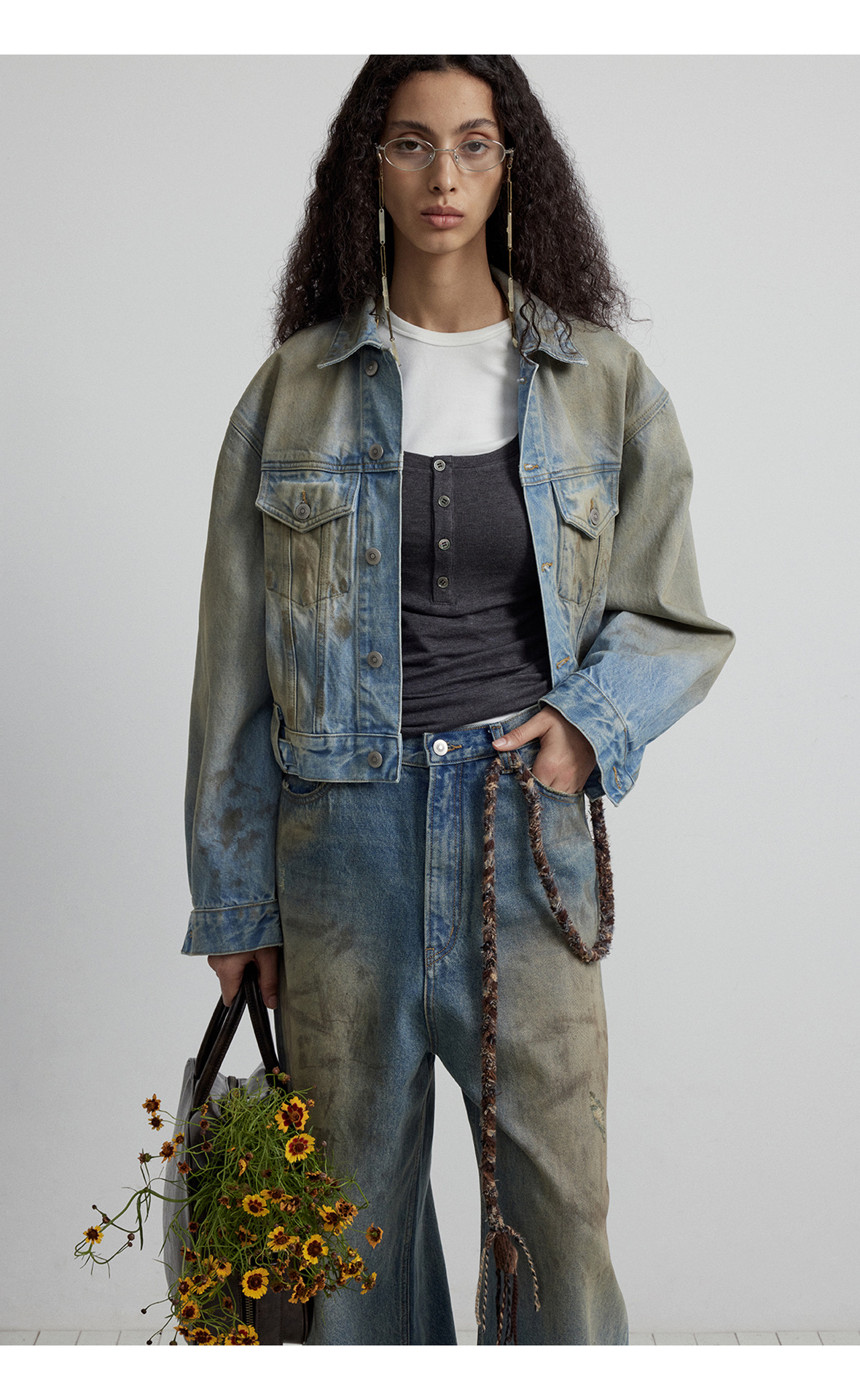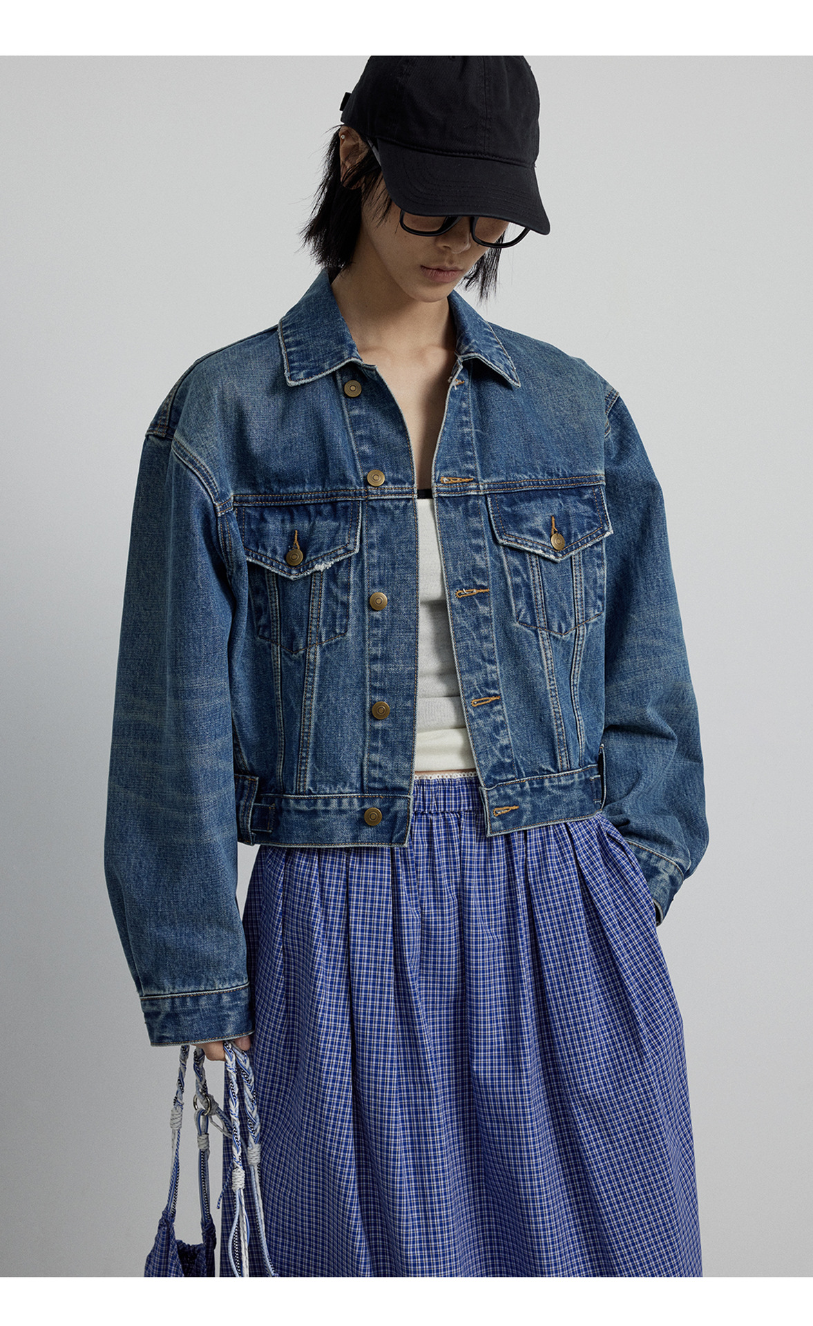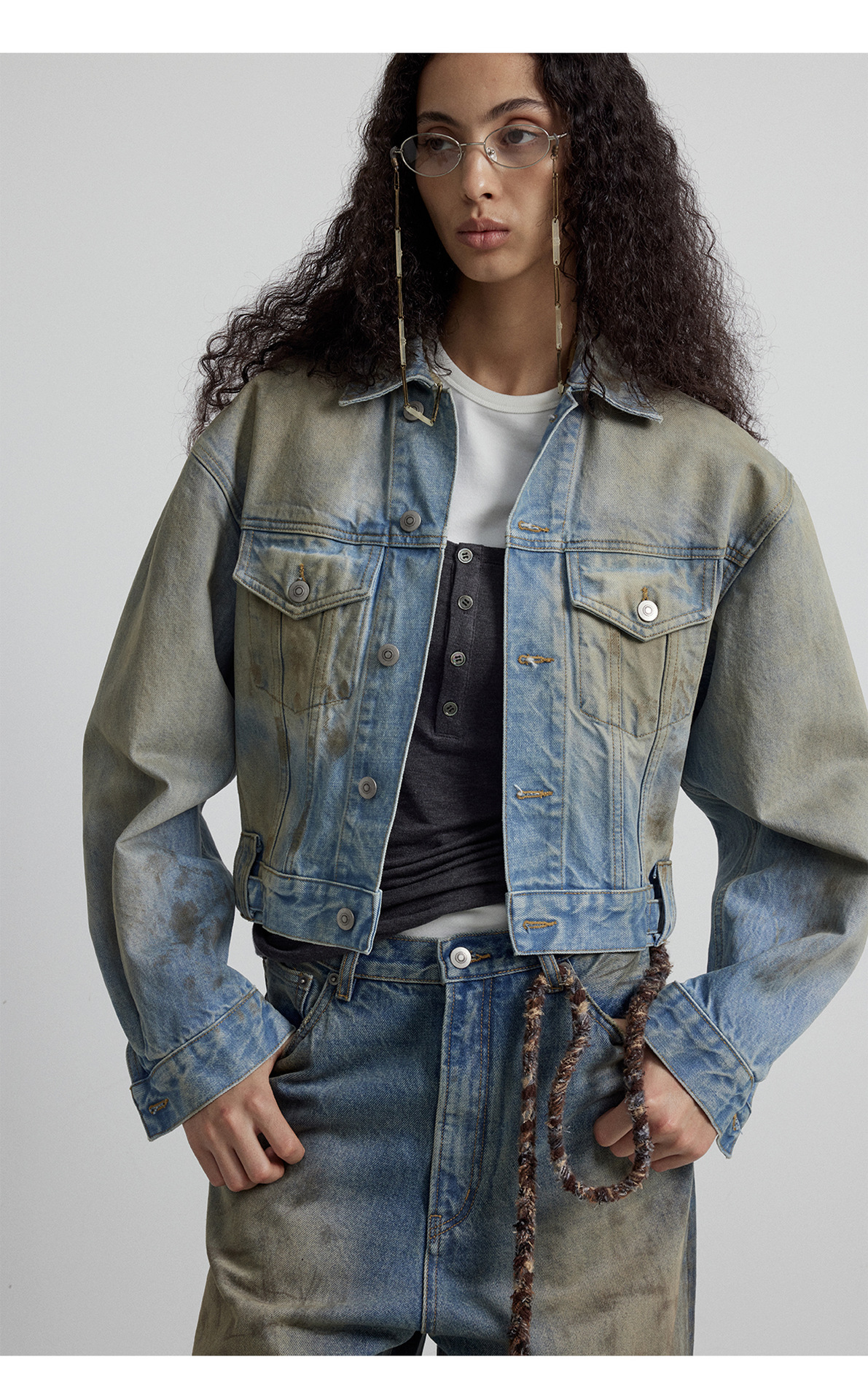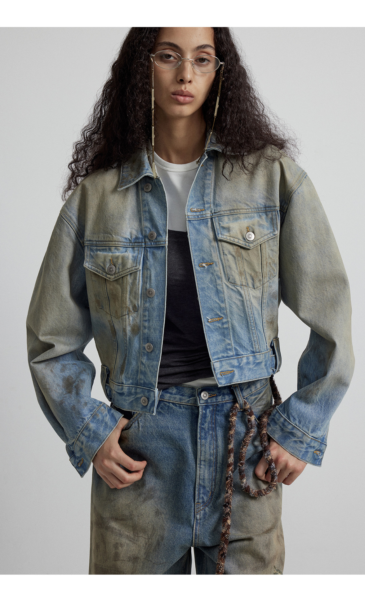 [시티] 신상 레트로 디스트레스드 페이디드 스테인 디자인 트리밍 인버티드 T 퓨어 코튼 라펠 데님 재킷 여성 V7080스토어 가기
