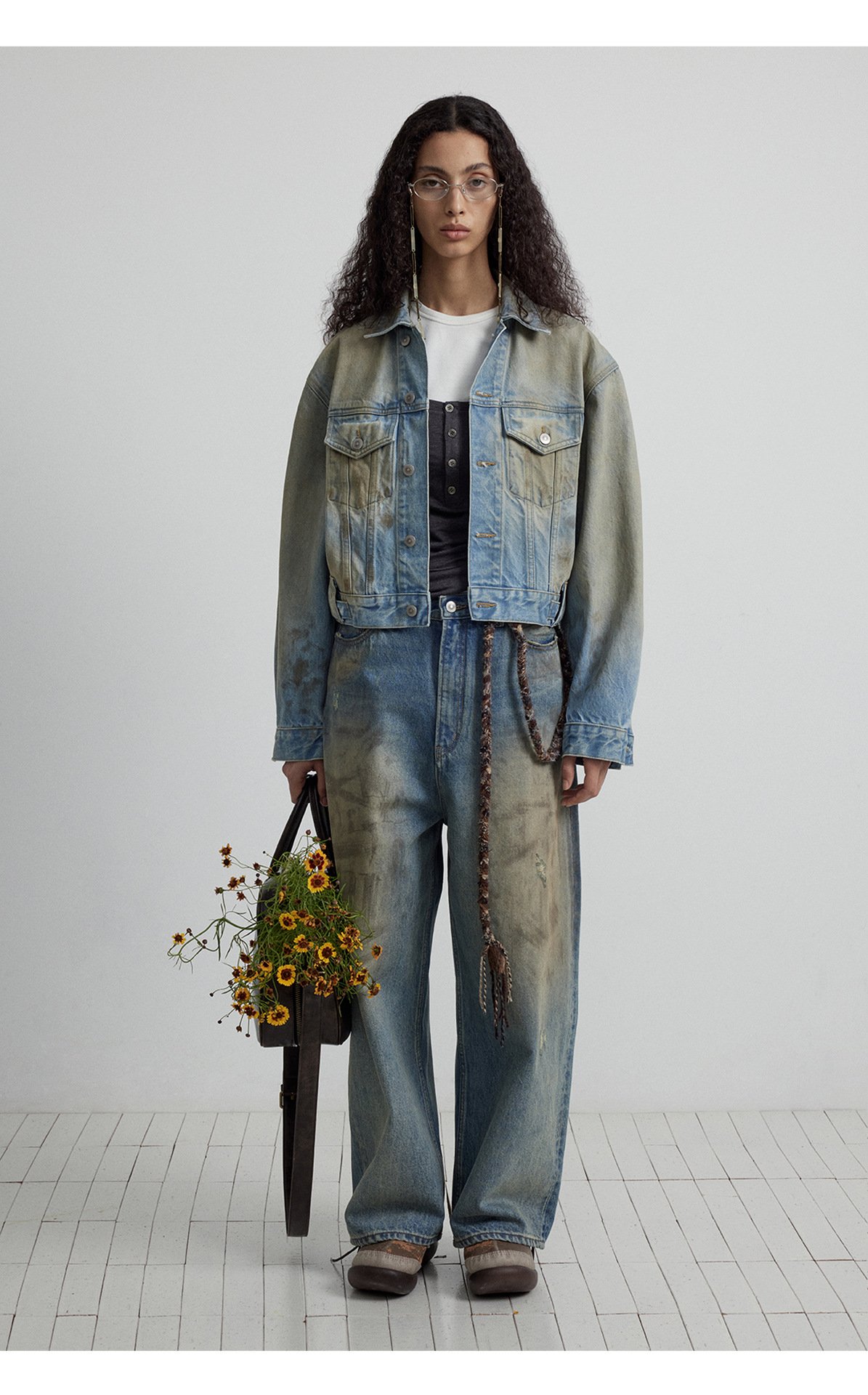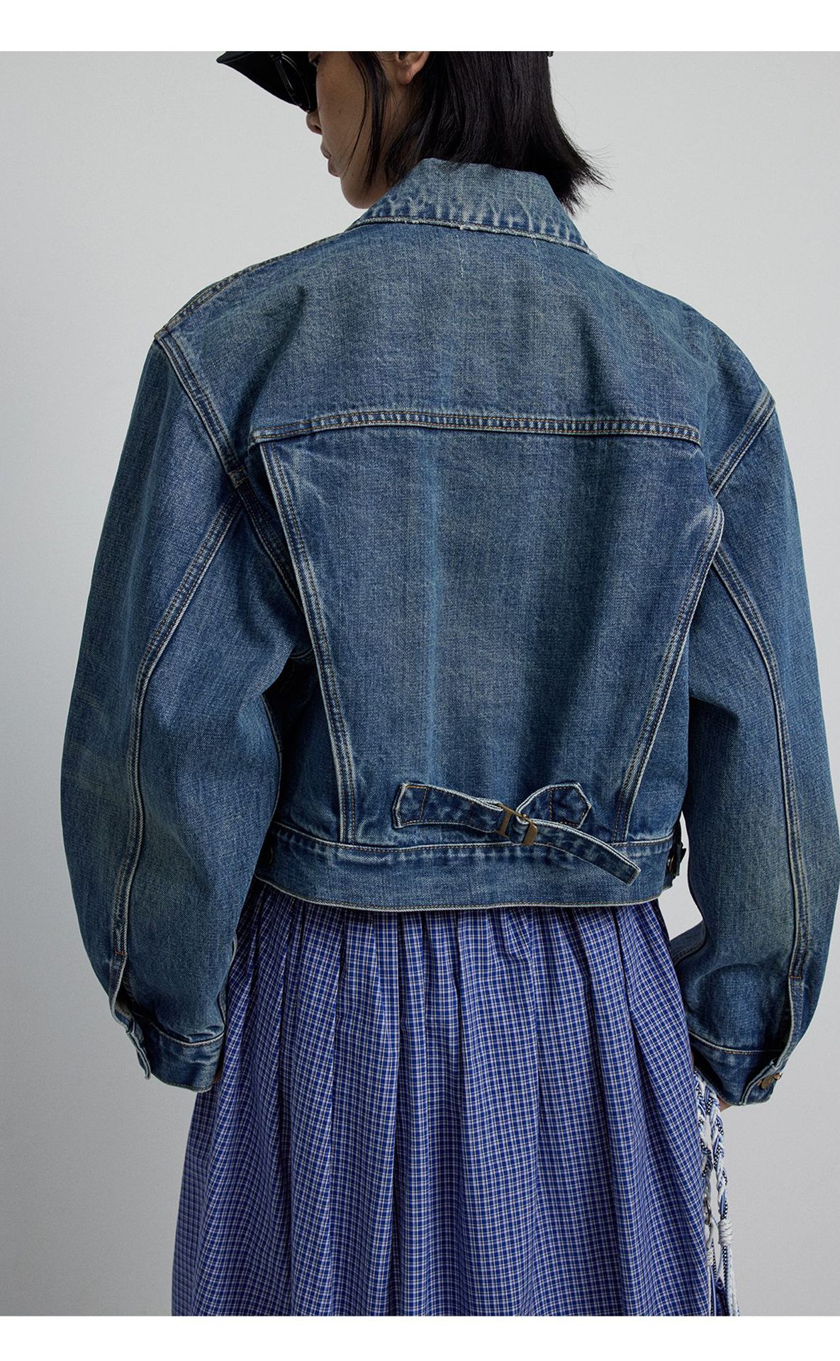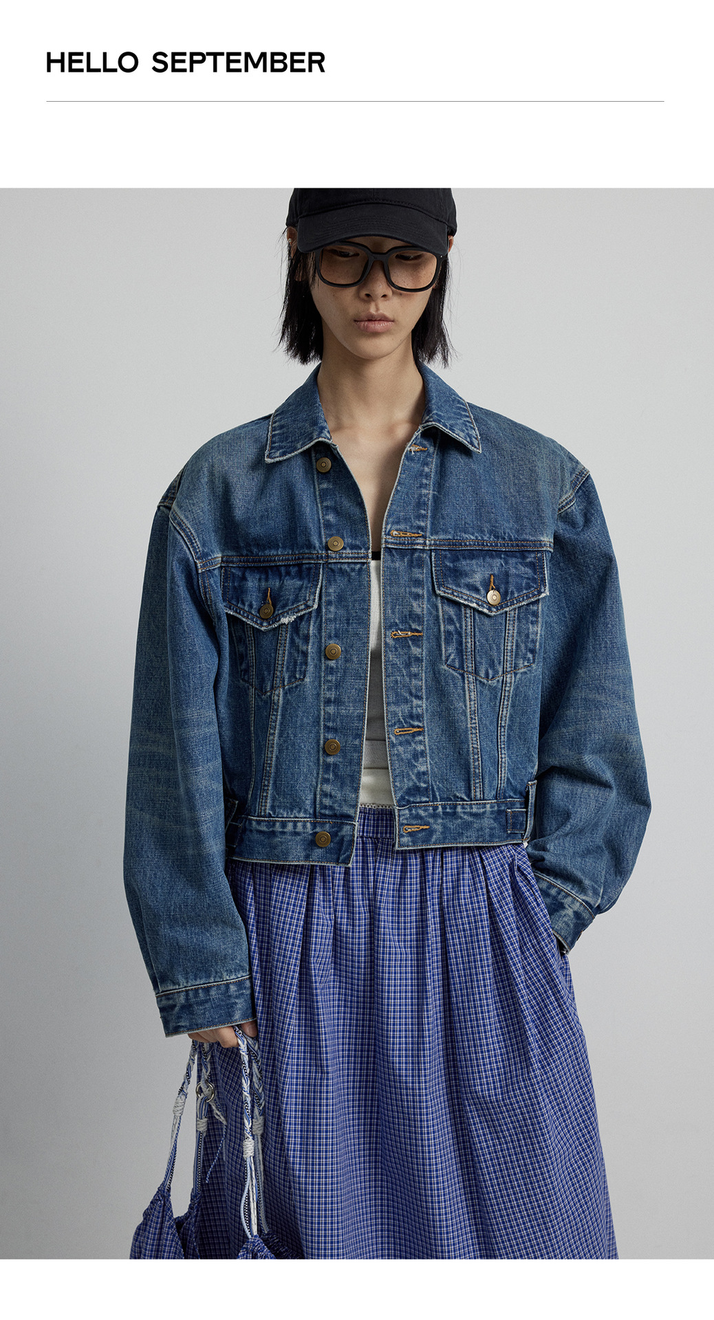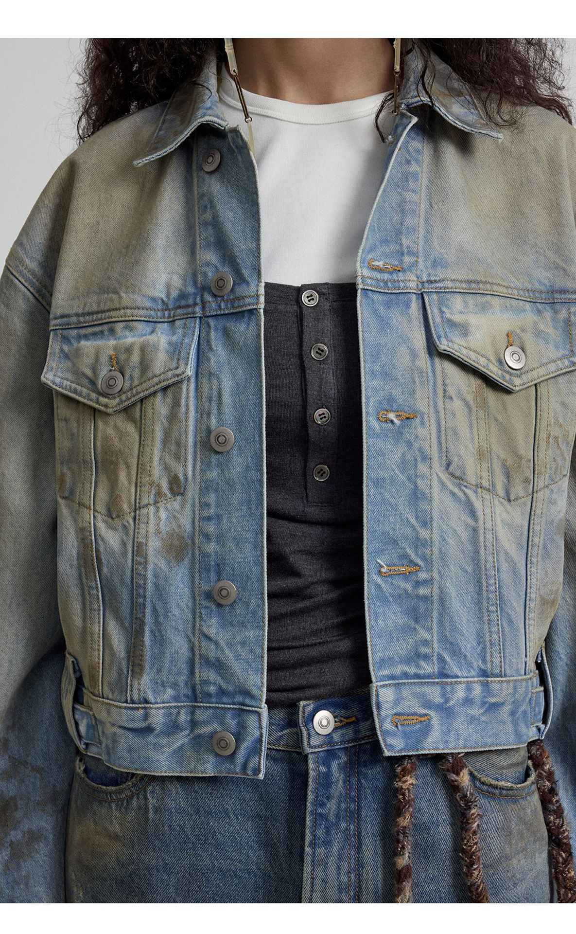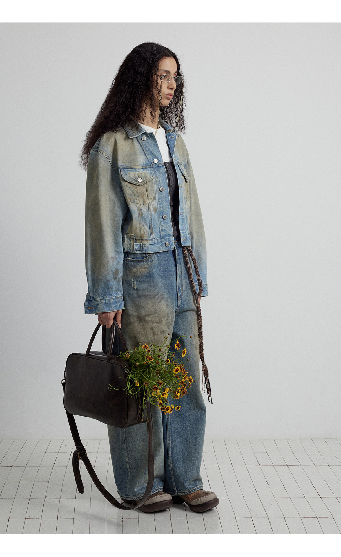 [시티] 신상 레트로 디스트레스드 페이디드 스테인 디자인 트리밍 인버티드 T 퓨어 코튼 라펠 데님 재킷 여성 V7080스토어 가기