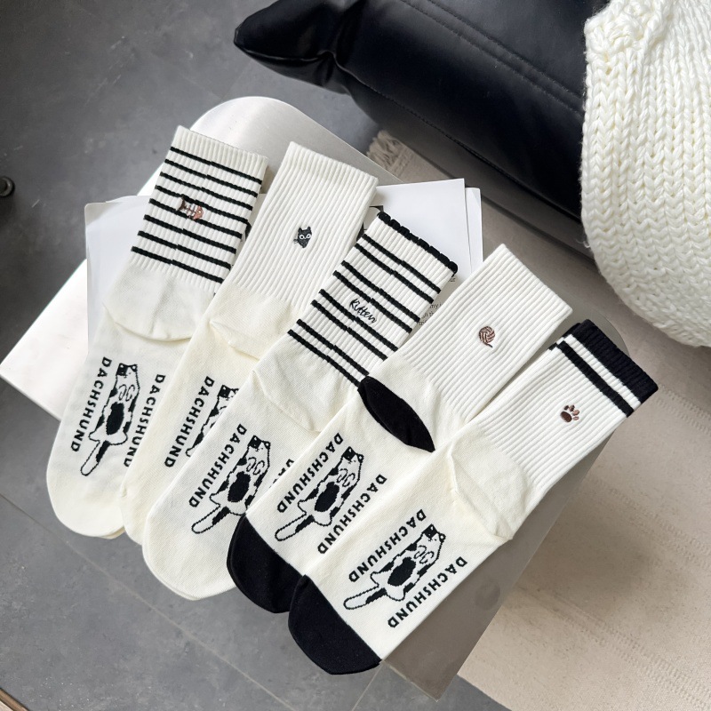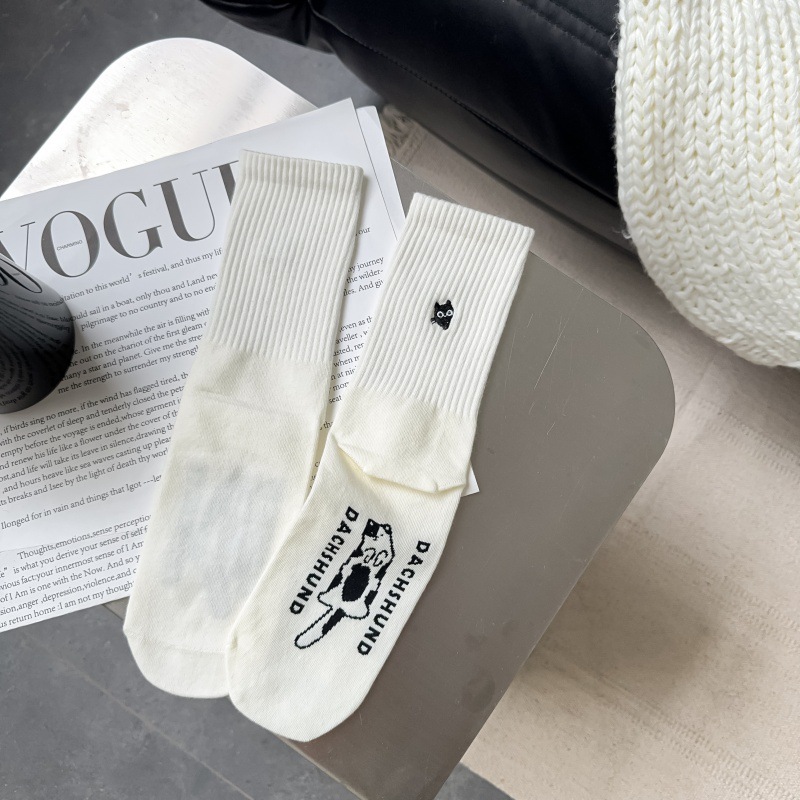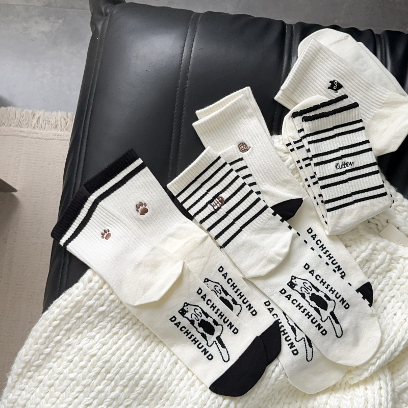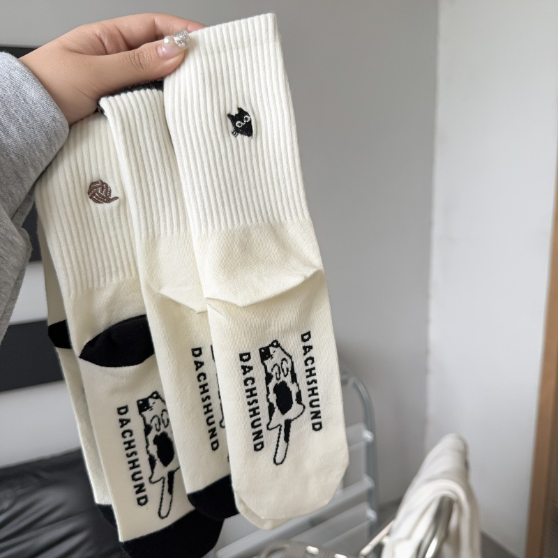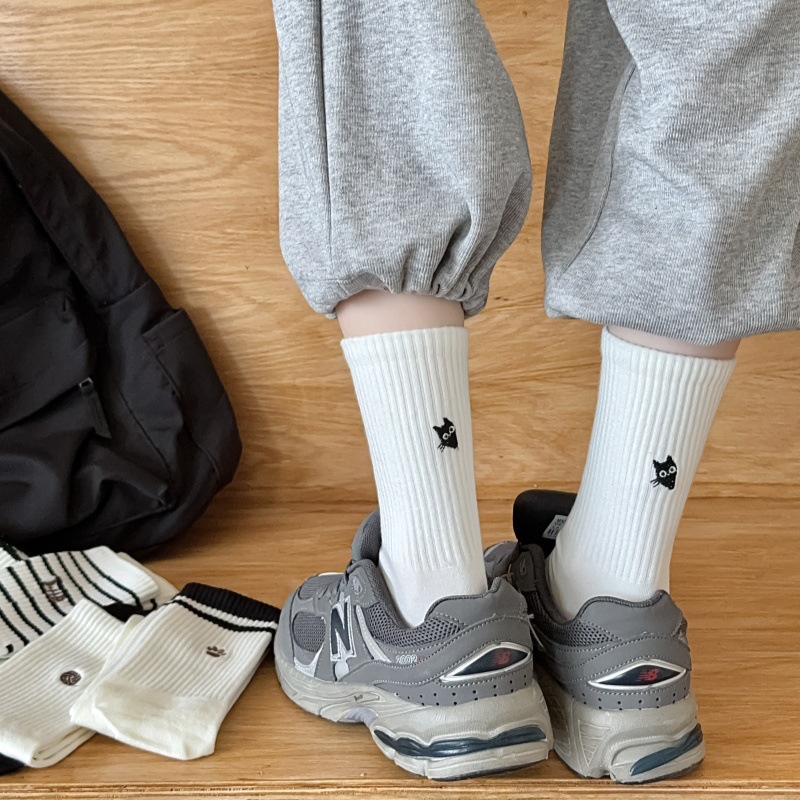 이른 가을 새로운 만화 귀여운 게으른 고양이 여성 튜브 양말 빗질면 높은 고무 흑백 고양이 자수 스포츠 스타킹스토어 가기