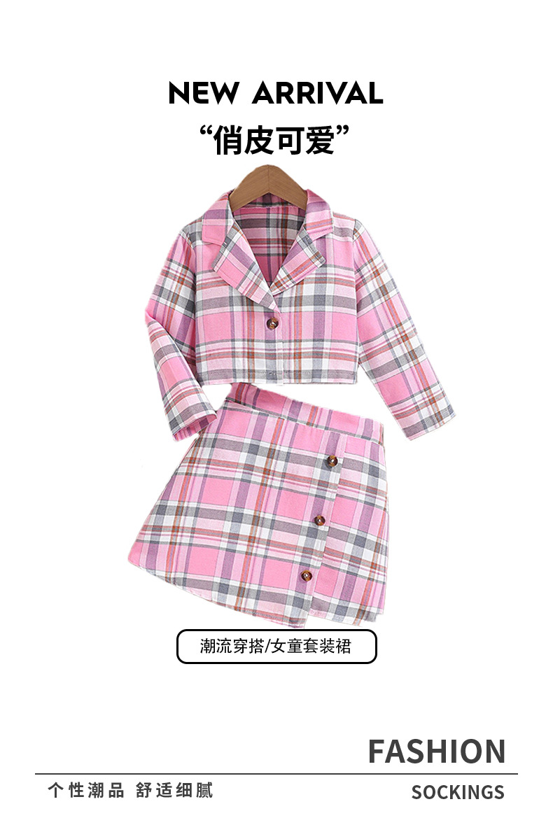 봄과 가을 소녀 격자 무늬 세트 두 조각 세트 한국식 회색 분말 격자 무늬 옷깃 대학 스타일 모자 세트 치마