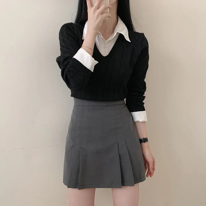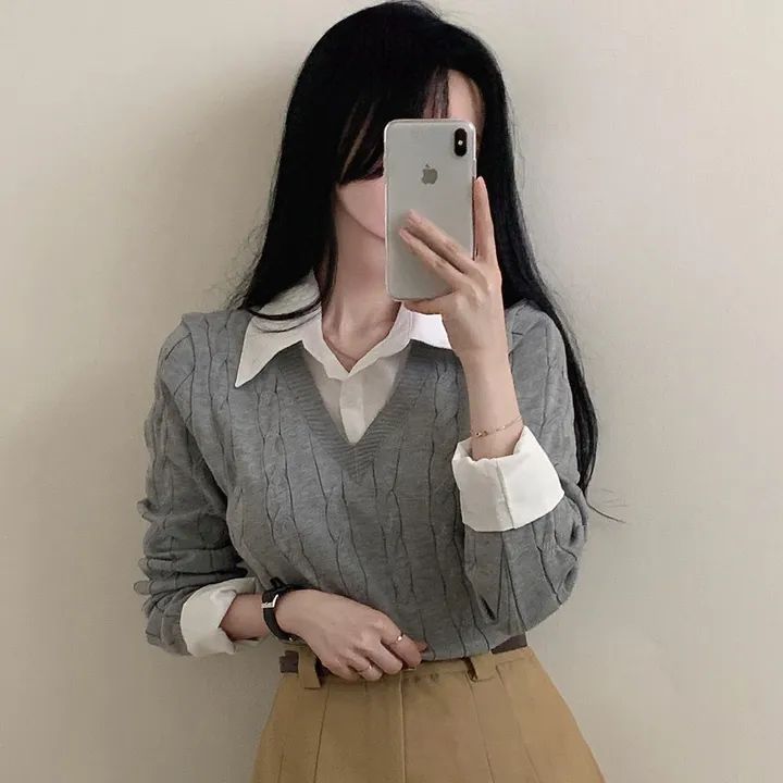 여성을위한 한국 스타일 셔츠 칼라 스플 라이스 가짜 투피스 스웨터 2025 새로운 봄, 가을 짧은 풀오버 탑
