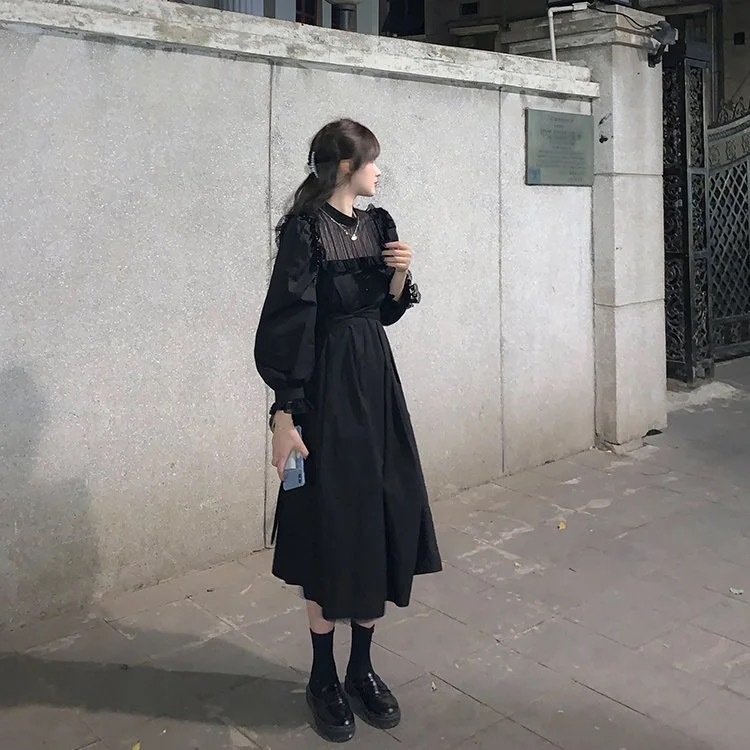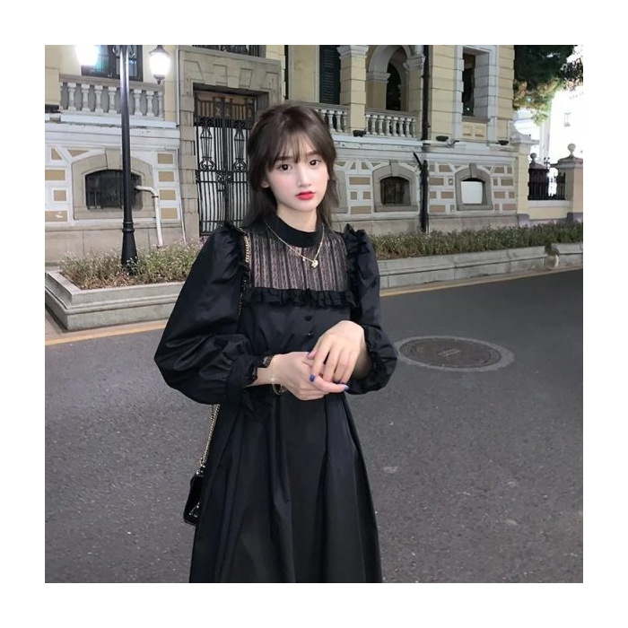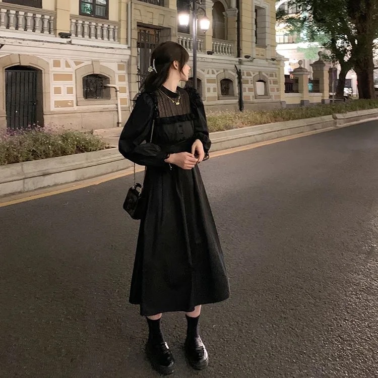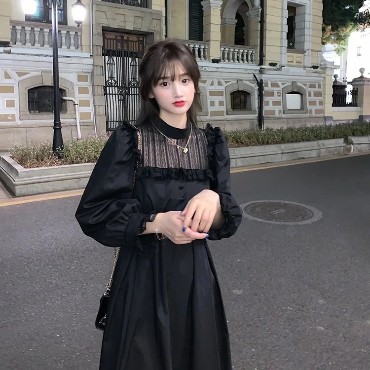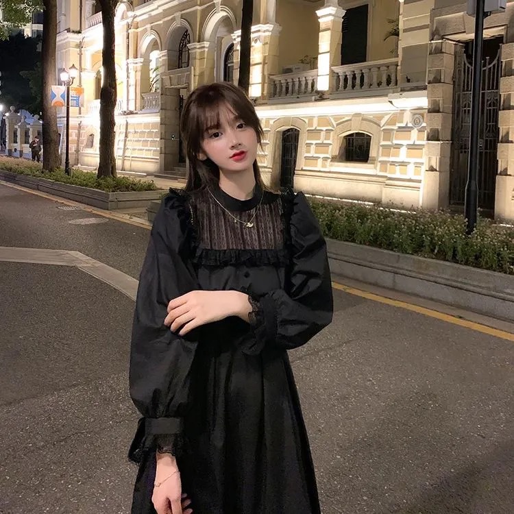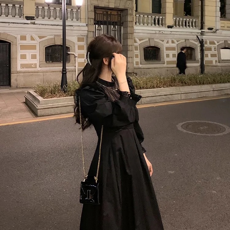 여성복 2025 겨울 신상 한국 스타일 랜턴 슬리브 레이스 스플라이싱 긴팔 원피스 슬림핏 우아한 인기 원피스스토어 가기