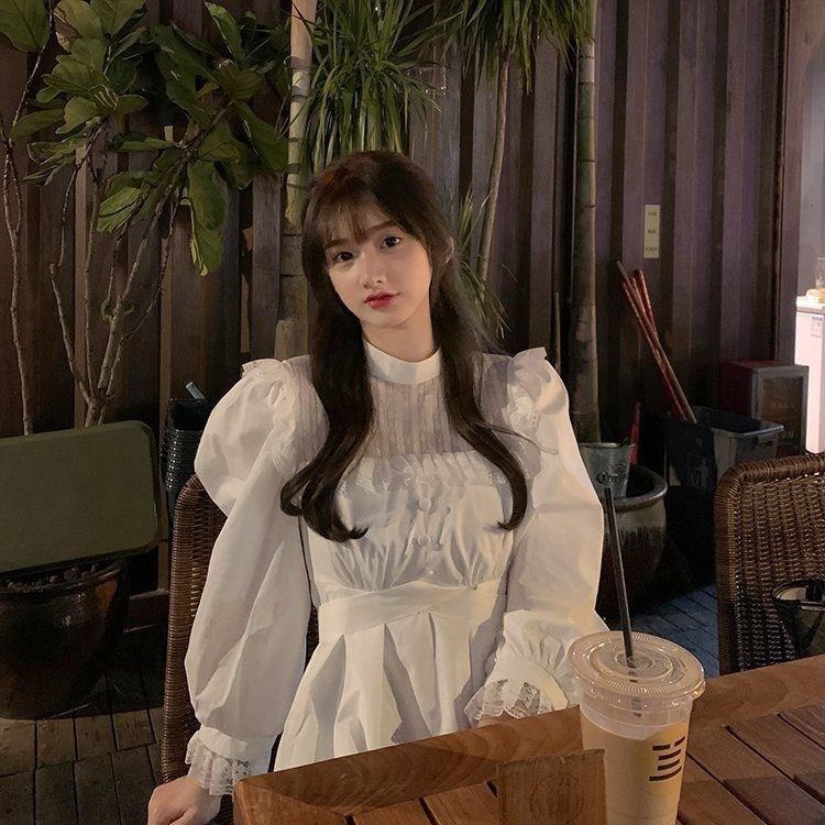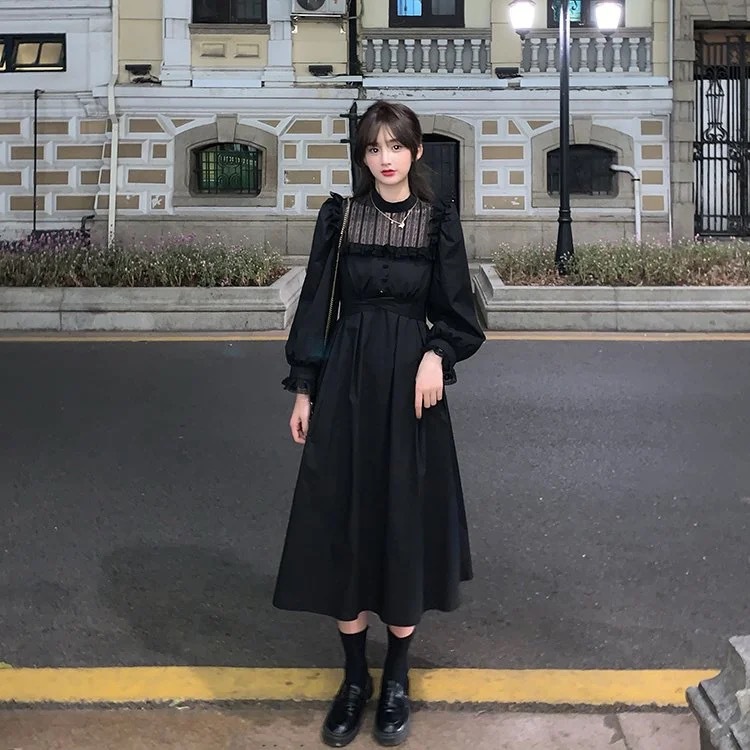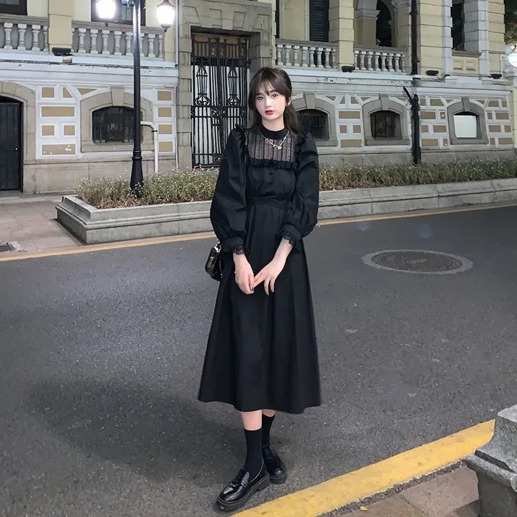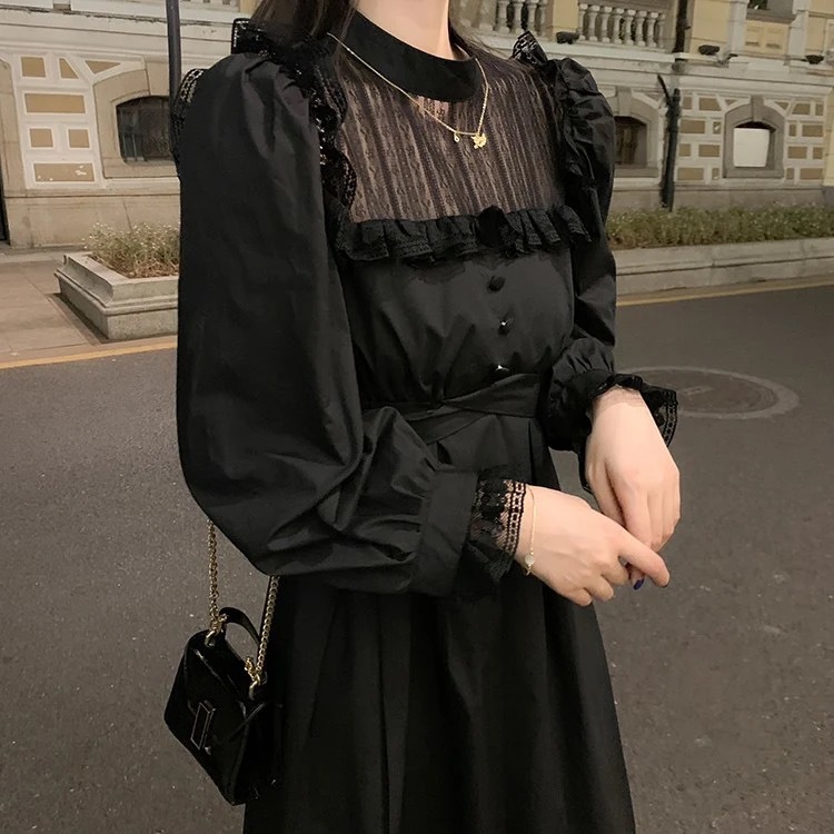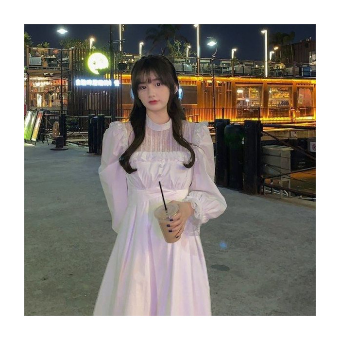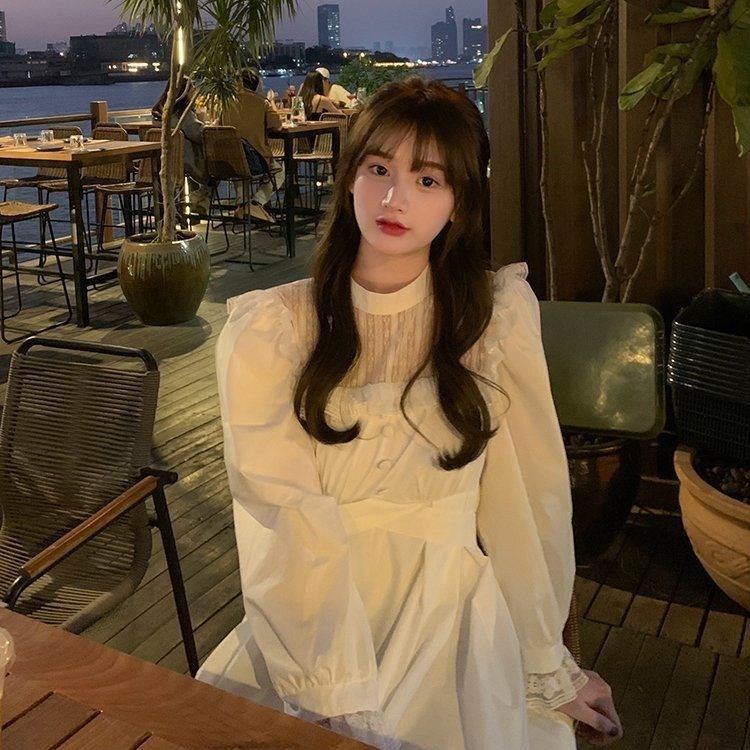 여성복 2025 겨울 신상 한국 스타일 랜턴 슬리브 레이스 스플라이싱 긴팔 원피스 슬림핏 우아한 인기 원피스스토어 가기