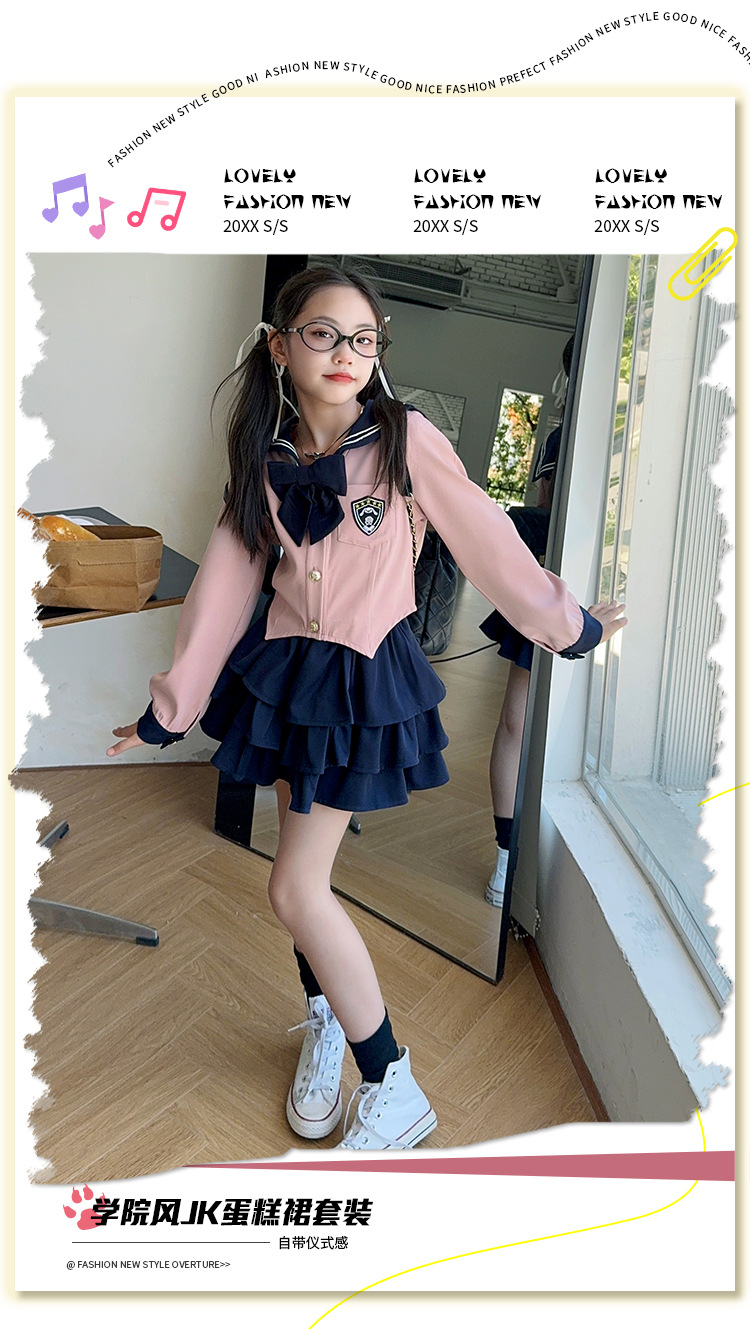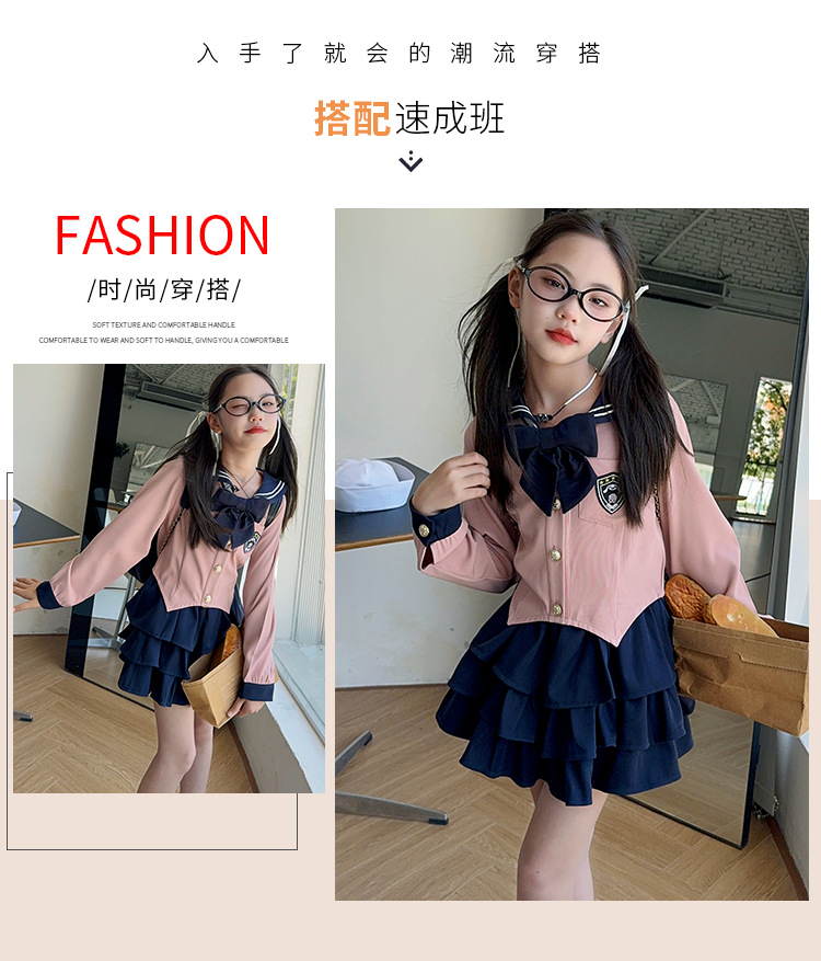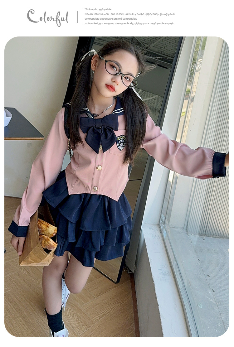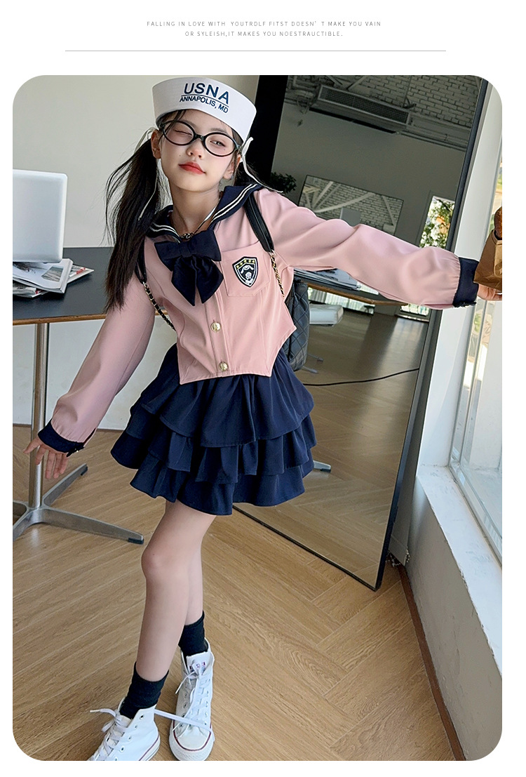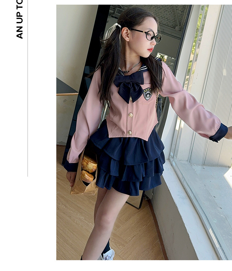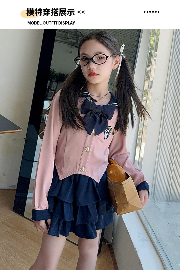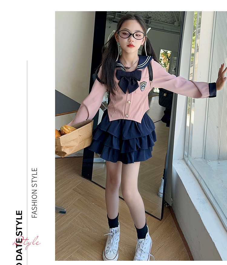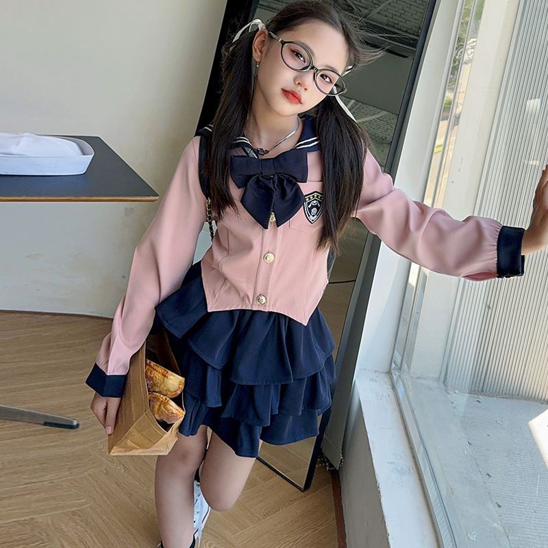 소녀 대학 스타일 JK 유니폼 세트 봄과 가을 2024 새로운 어린이 선원 세트 긴 소매 티셔츠 케이크 스커트 조수