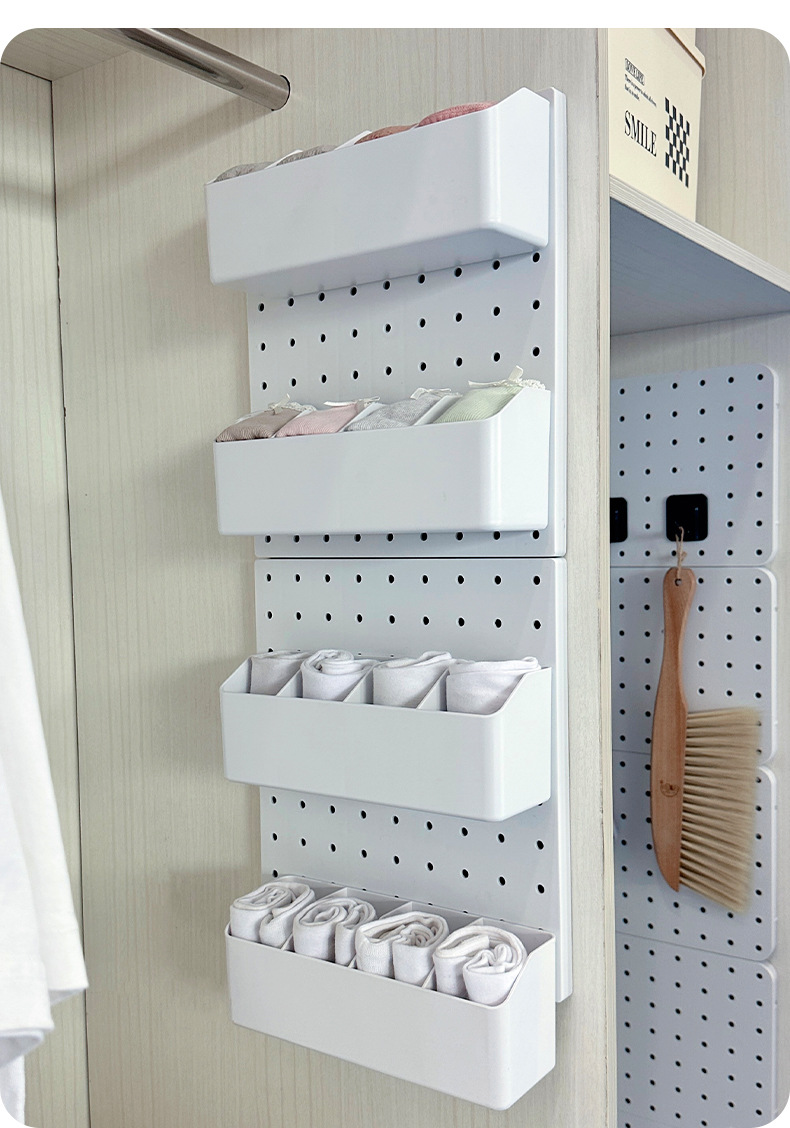 벽에 걸려있는 속옷 양말 저장 유물 구멍 보드 비 천공 흰색 조합 벽 장식 파티션 저장 상자
