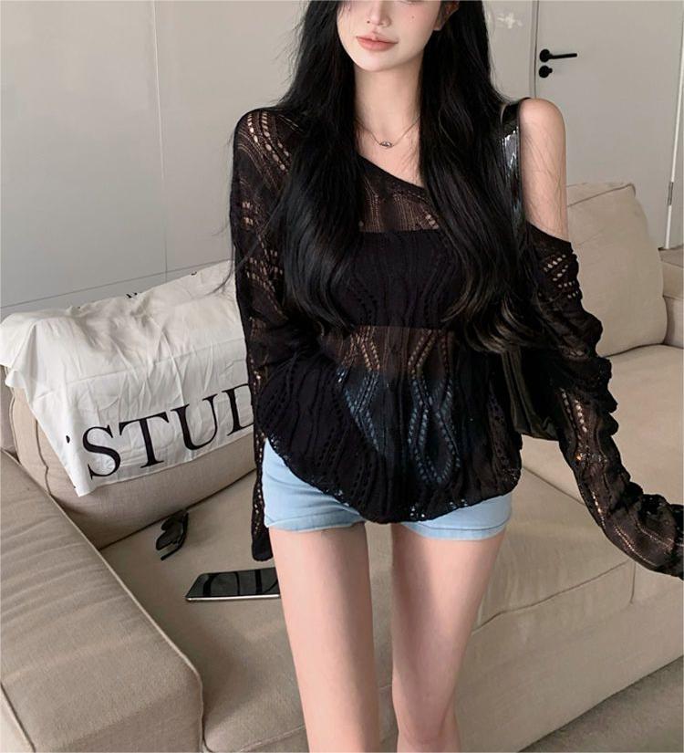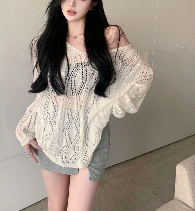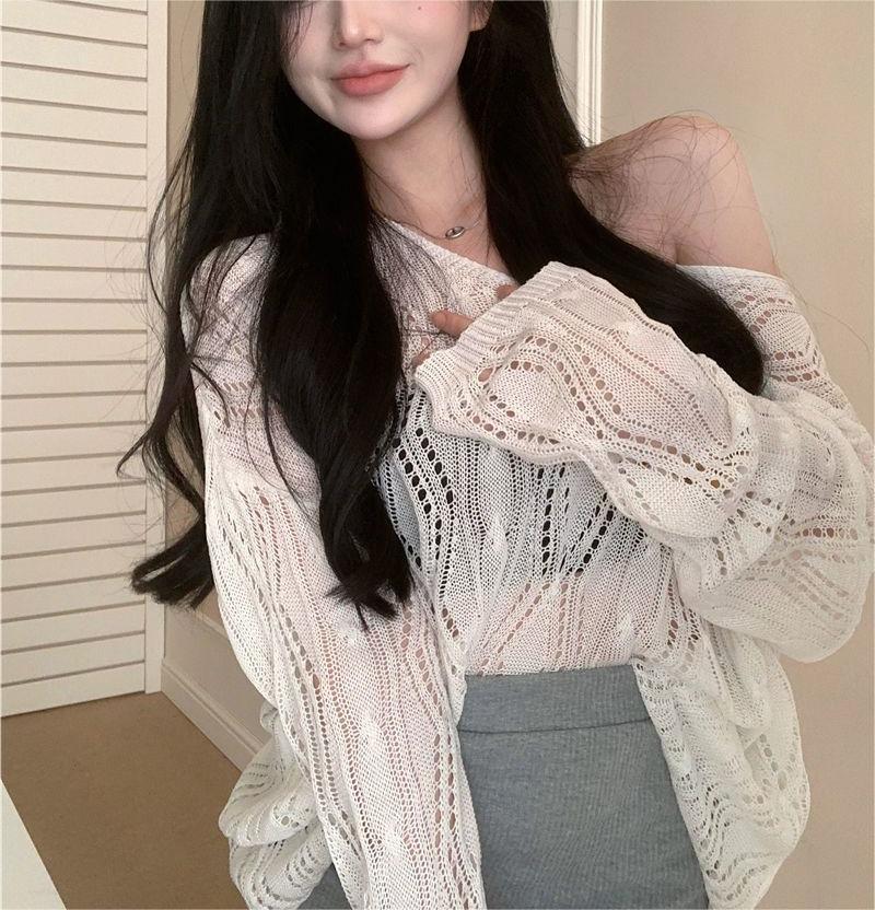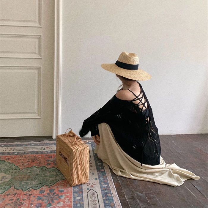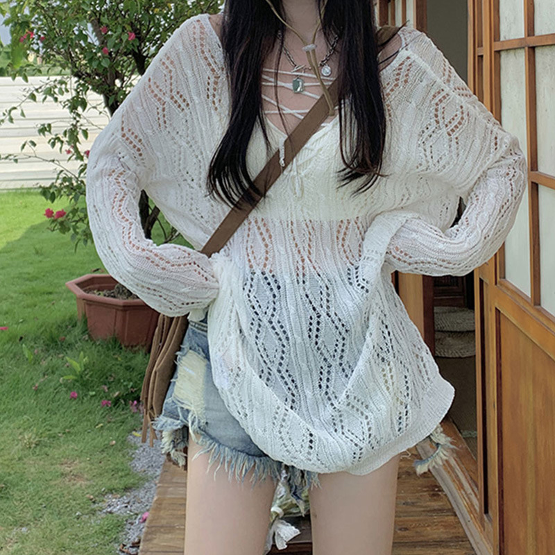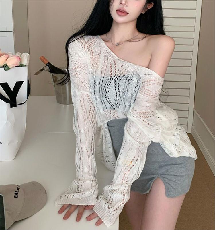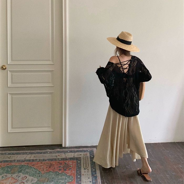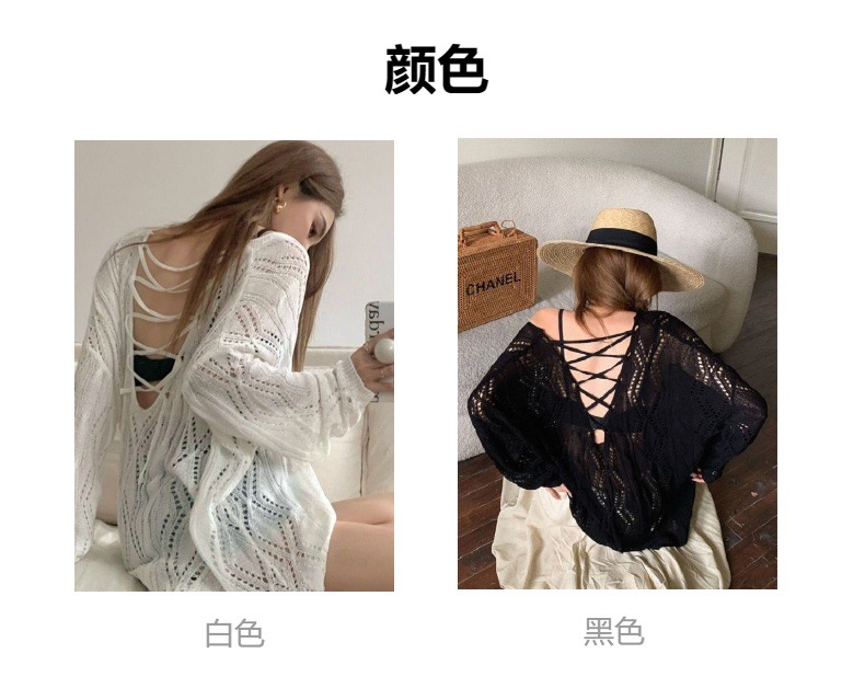흰색 중공 백리스 니트 탑 섹시한 스트랩 긴팔 비치 니트 블라우스 플러스 사이즈 여성 의류 대외 무역 여름스토어 가기