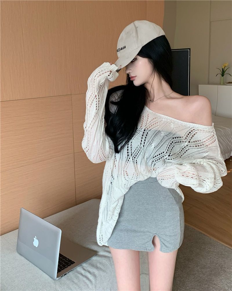 흰색 중공 백리스 니트 탑 섹시한 스트랩 긴팔 비치 니트 블라우스 플러스 사이즈 여성 의류 대외 무역 여름
