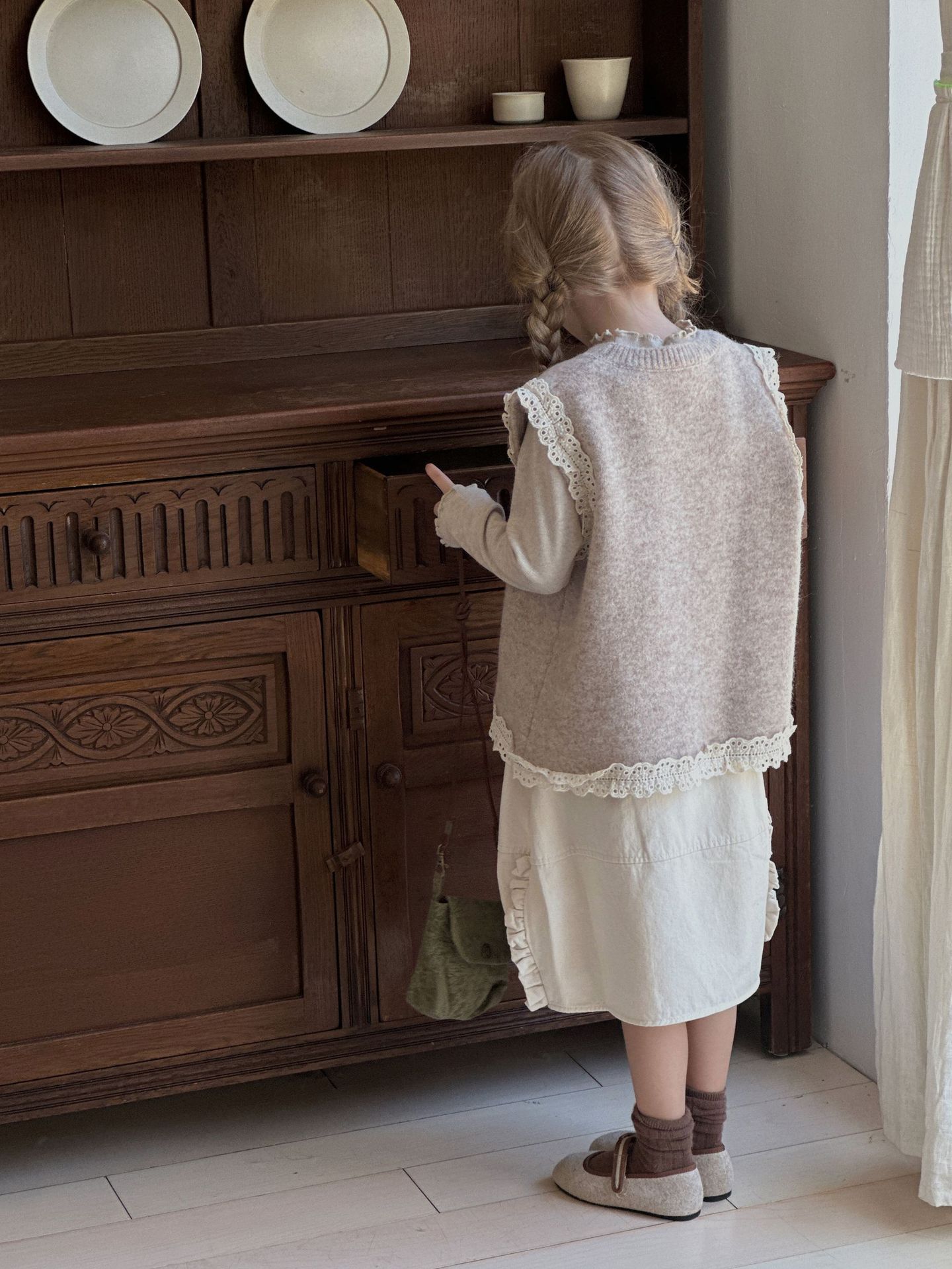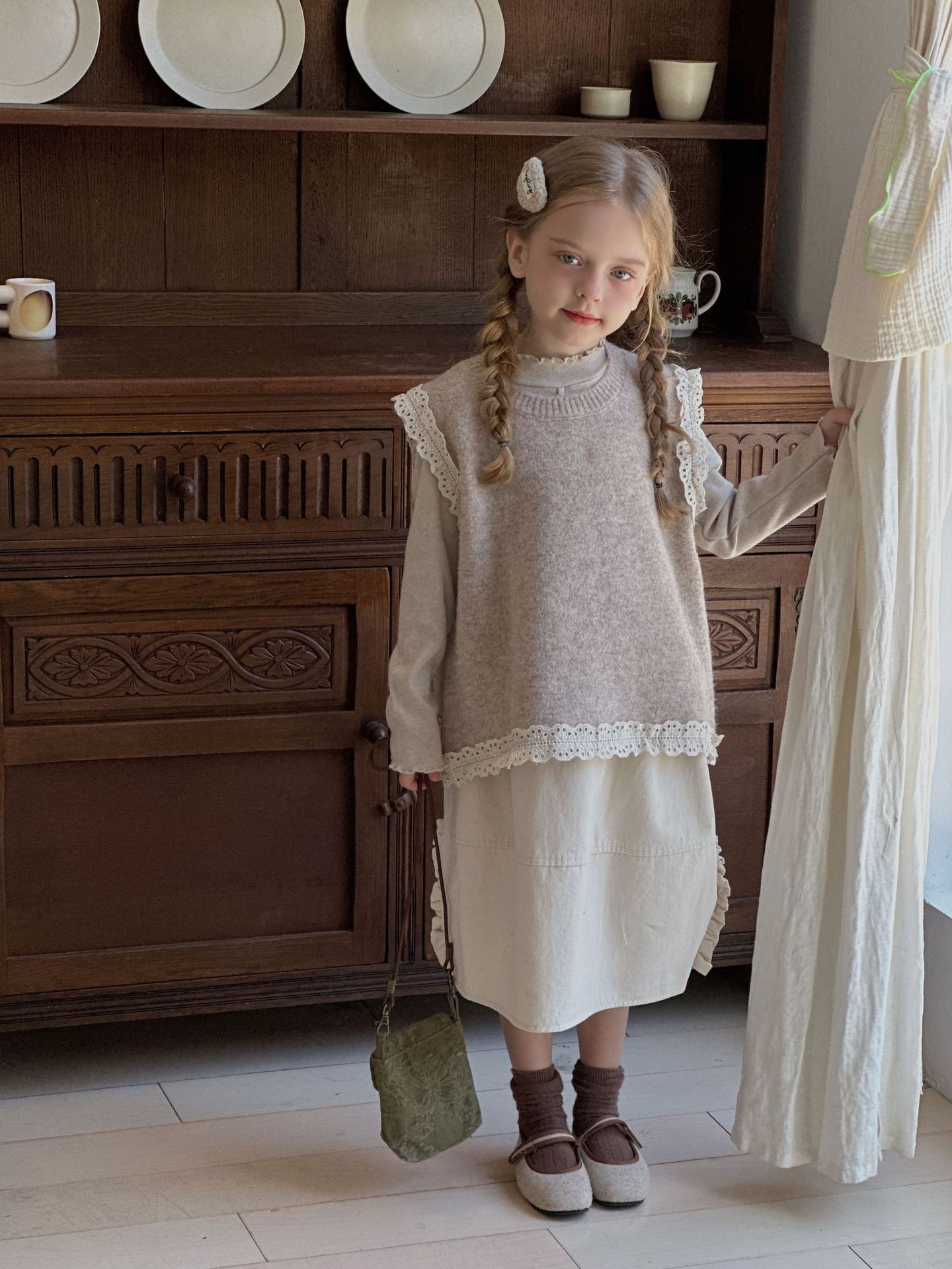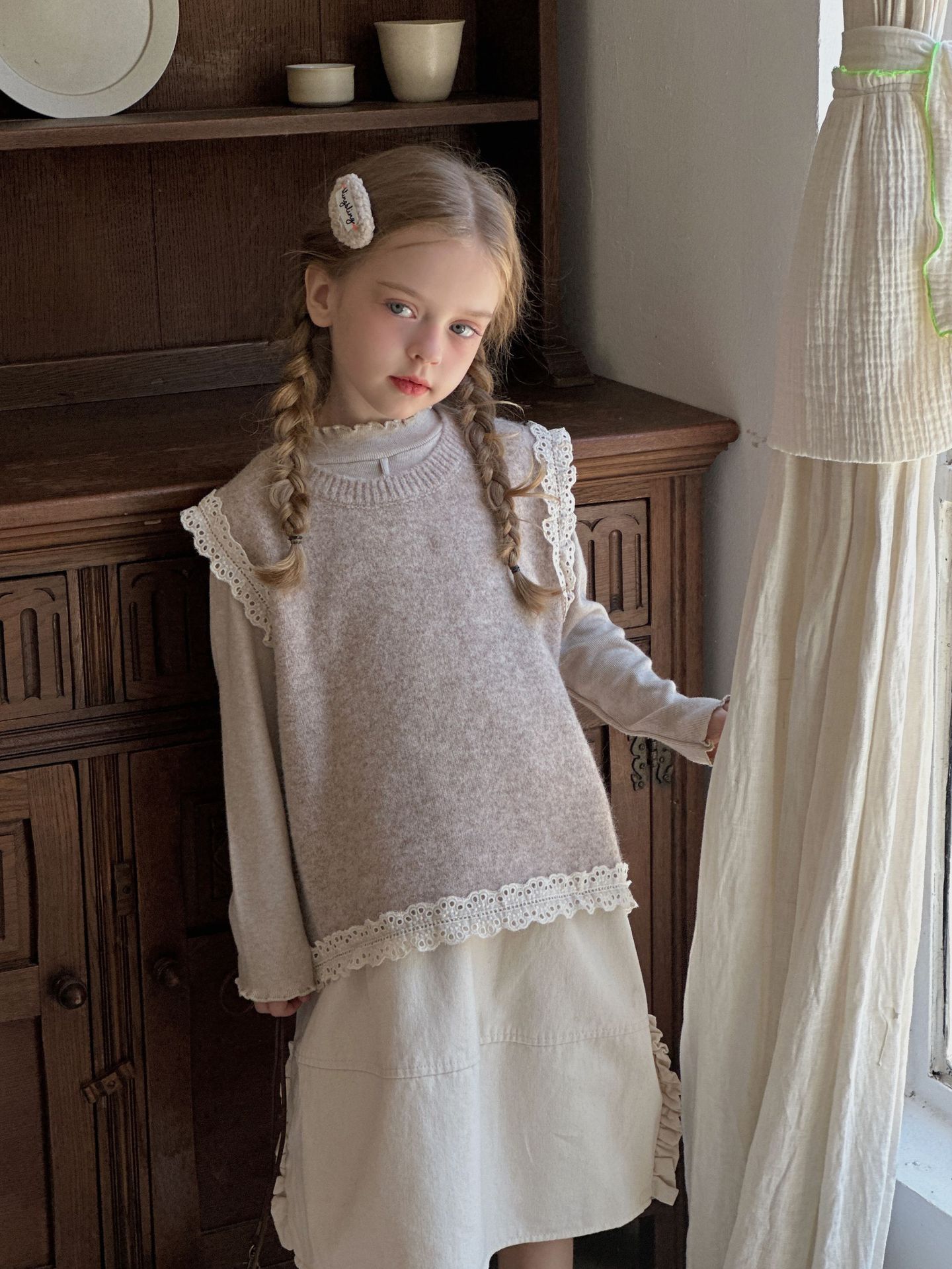 여아 정장 2024 가을 신상 한국 스타일 어린이 레이스 장식 조끼, 이너 셔츠, 스커트 3종 세트스토어 가기