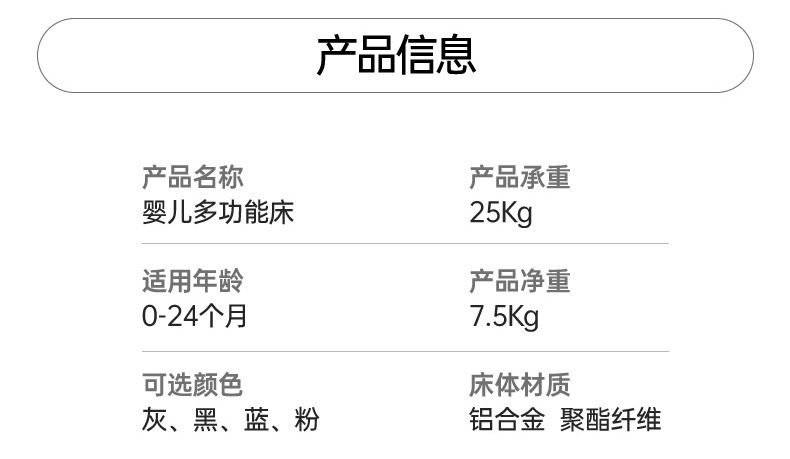 • 그레이 모델 - 알루미늄 합금 + 매트리스 + 모기장 + 보관 바구니 + 기저귀 교환대