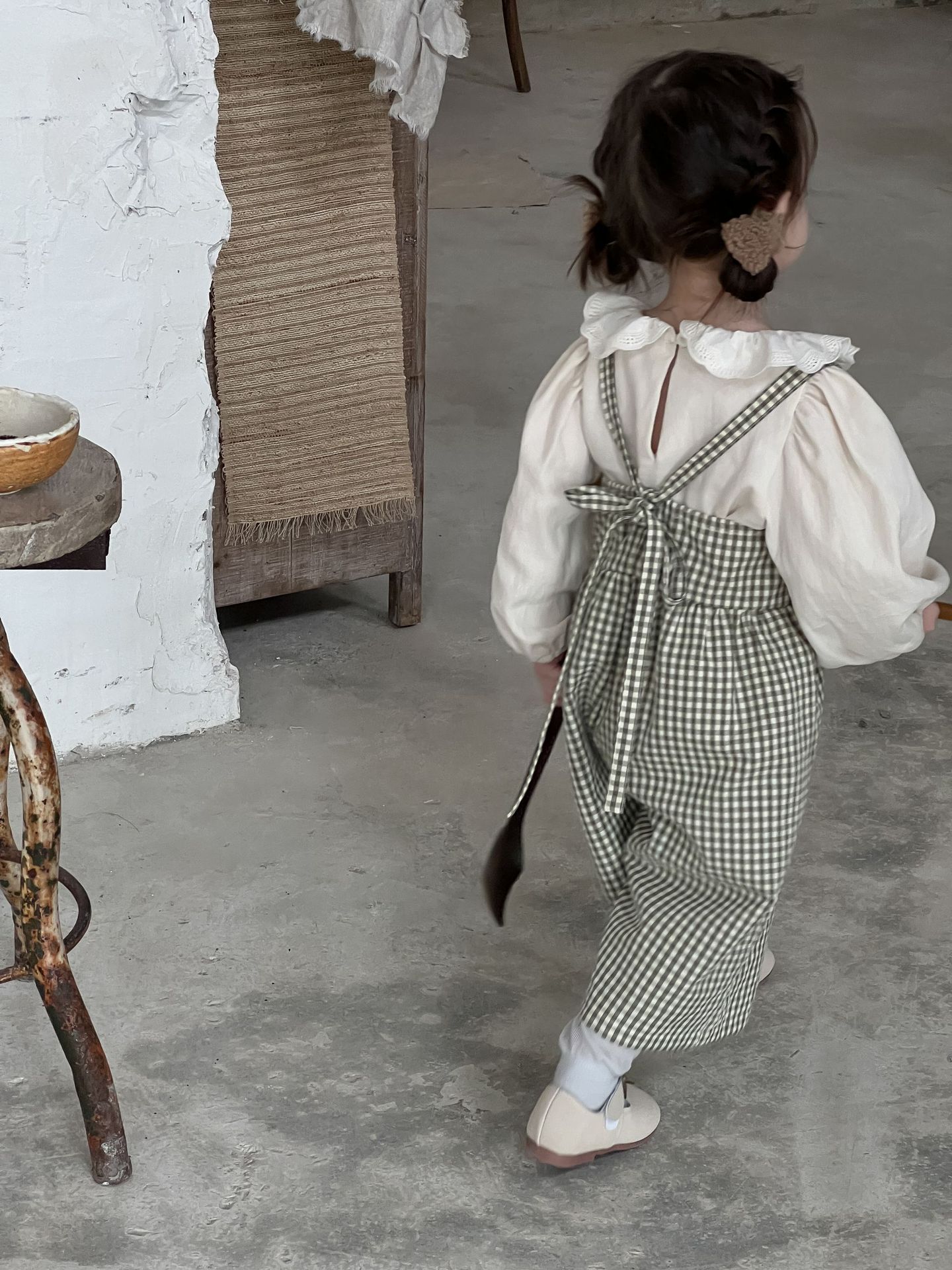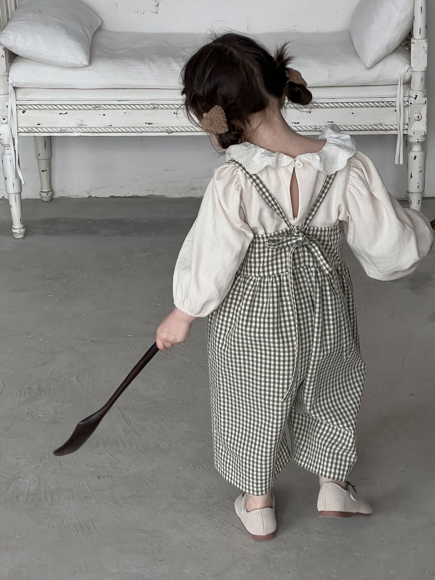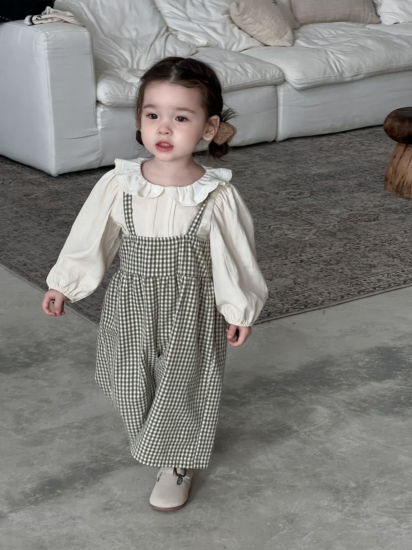 단색 러플 칼라 루즈핏 코튼 퍼프 셔츠 한국 스타일 체크무늬 멜빵 바지 투피스 세트스토어 가기