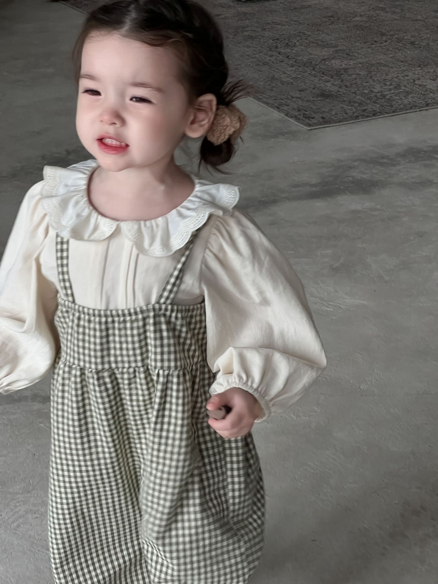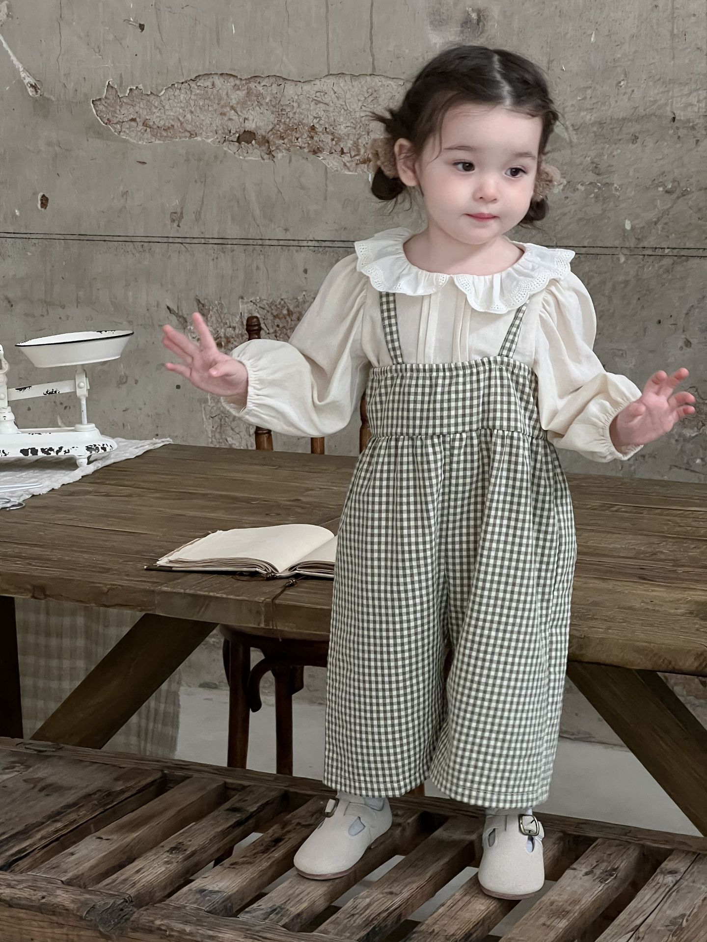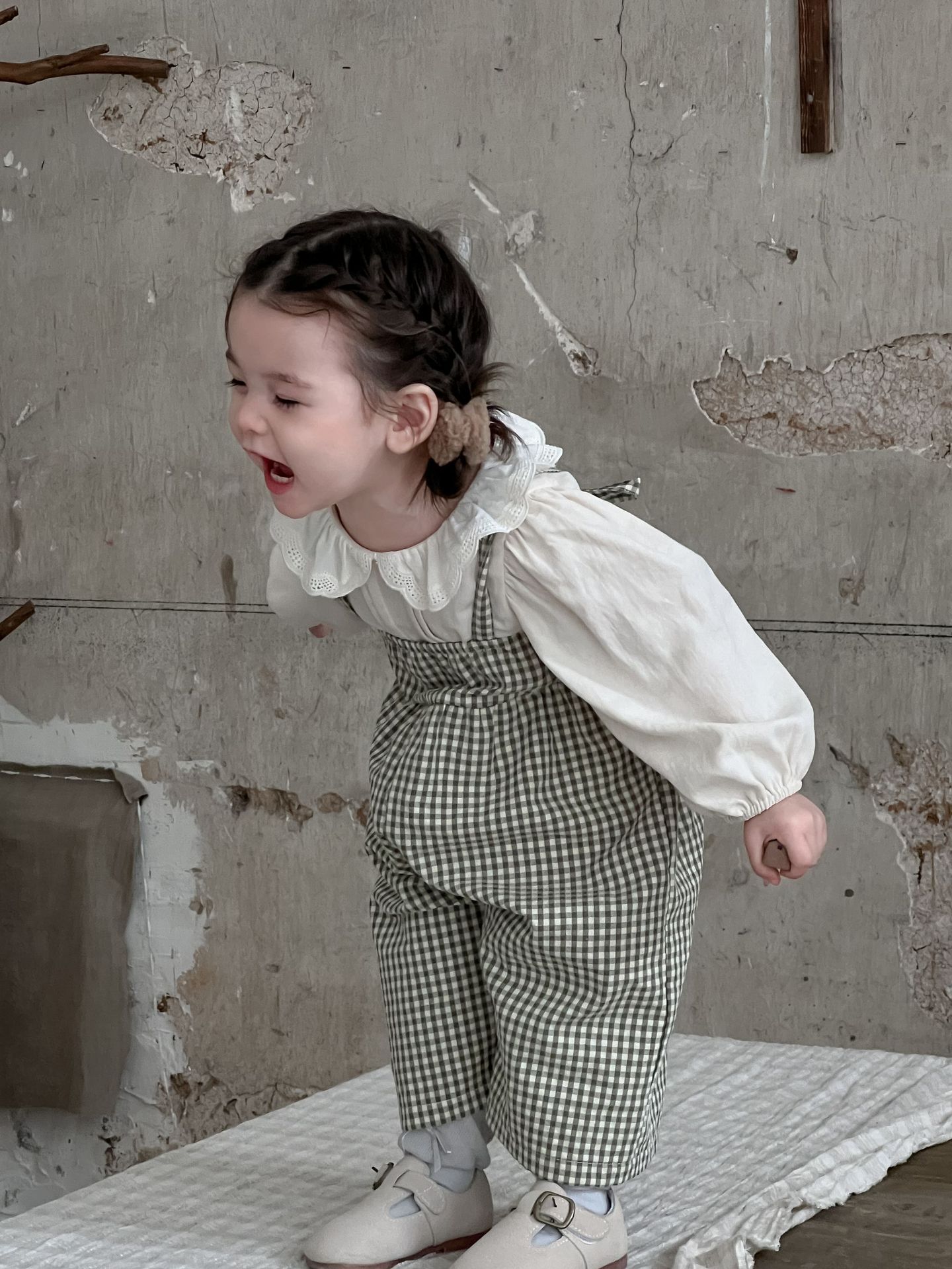 단색 러플 칼라 루즈핏 코튼 퍼프 셔츠 한국 스타일 체크무늬 멜빵 바지 투피스 세트