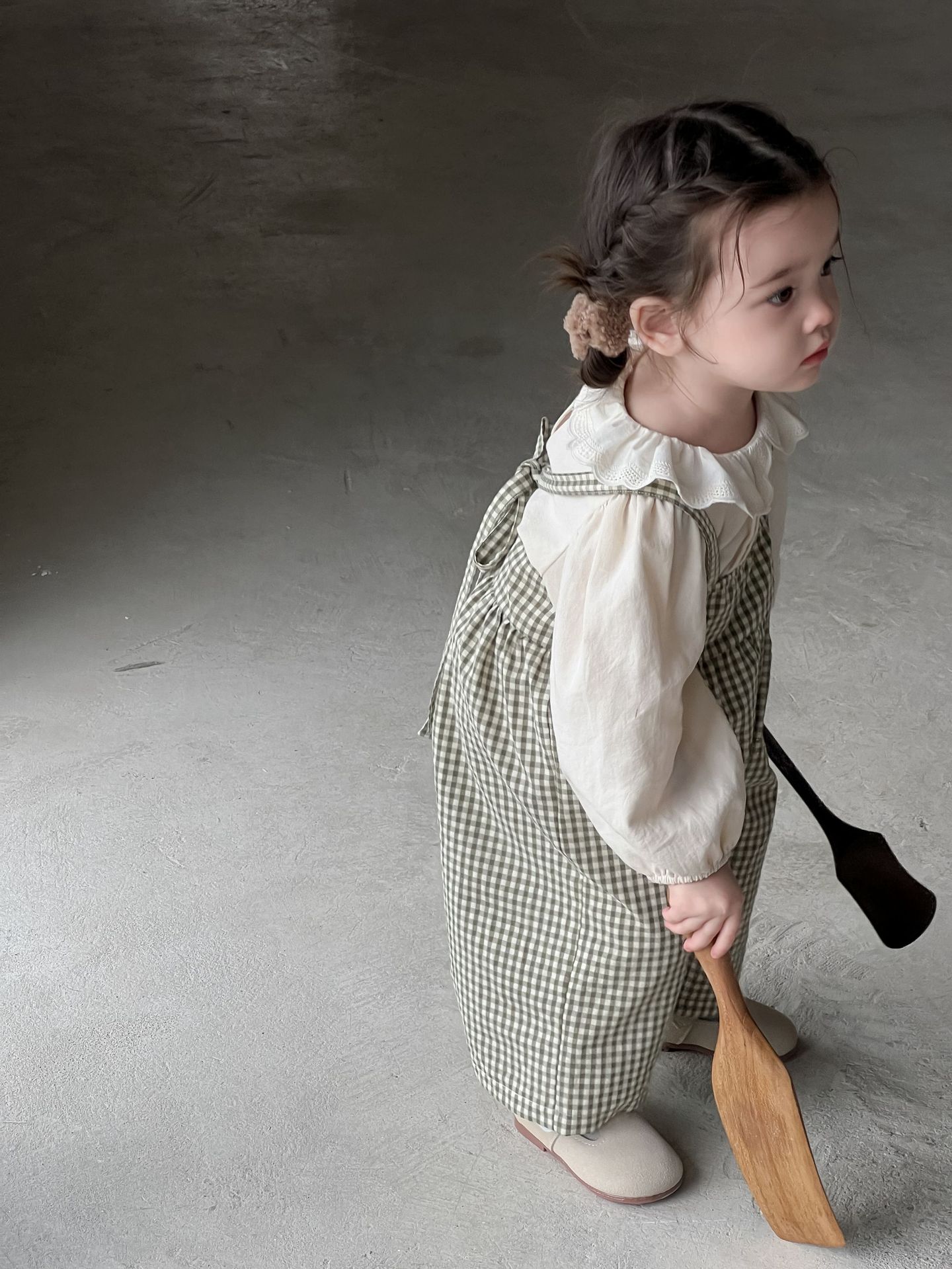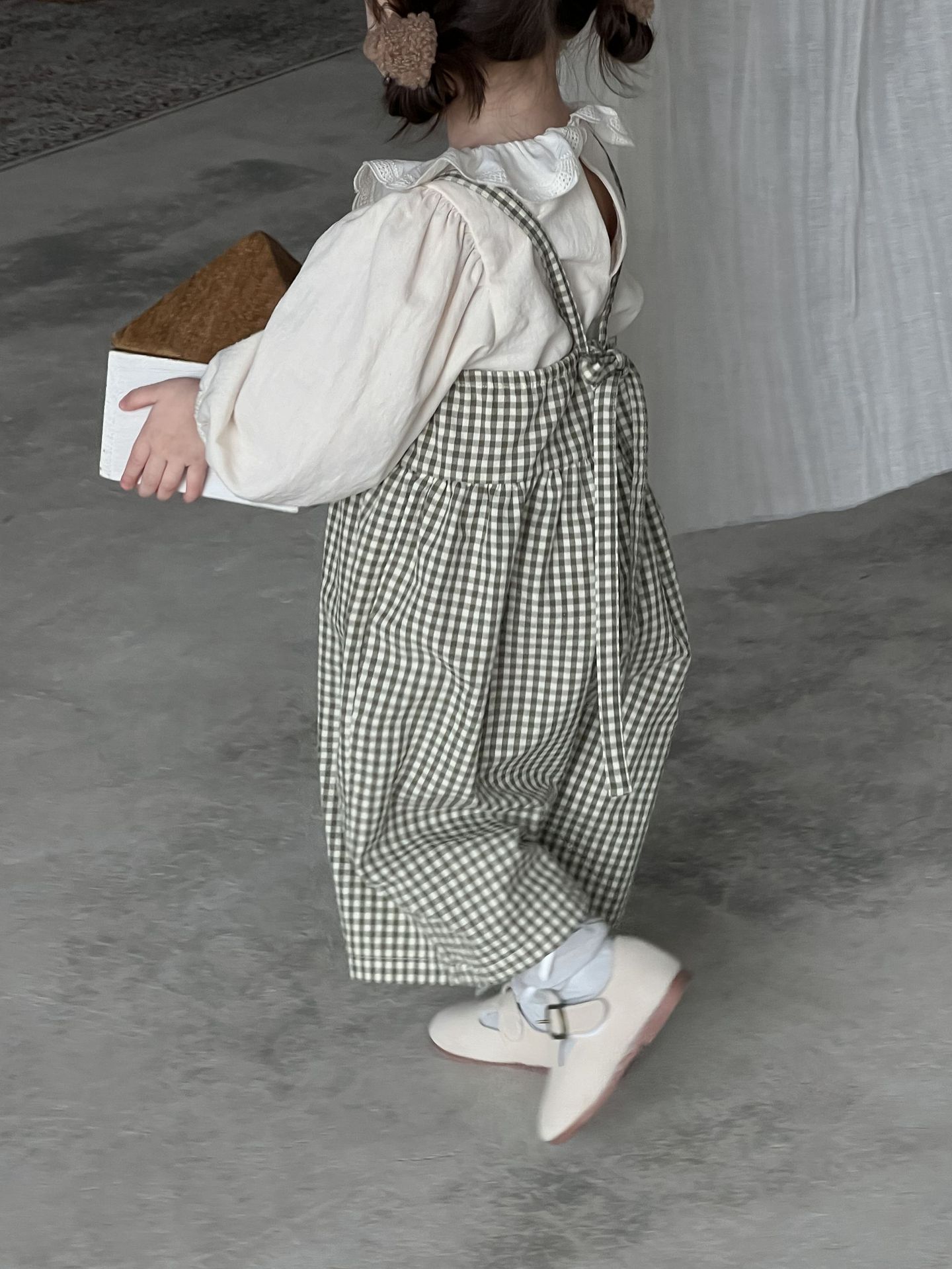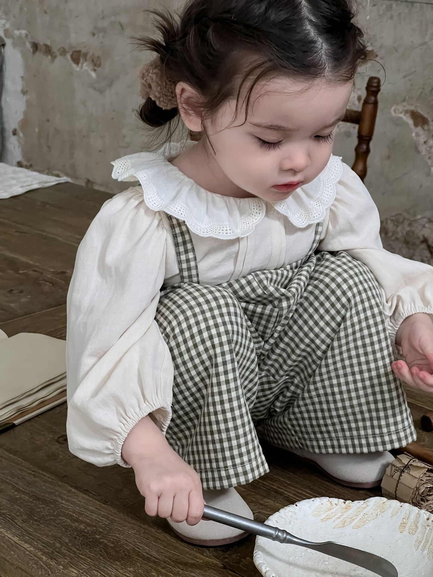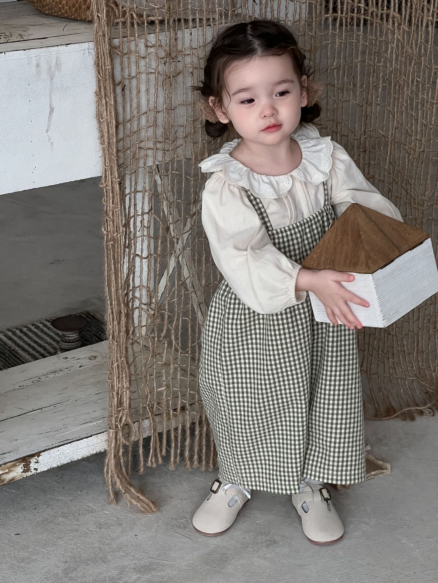 단색 러플 칼라 루즈핏 코튼 퍼프 셔츠 한국 스타일 체크무늬 멜빵 바지 투피스 세트