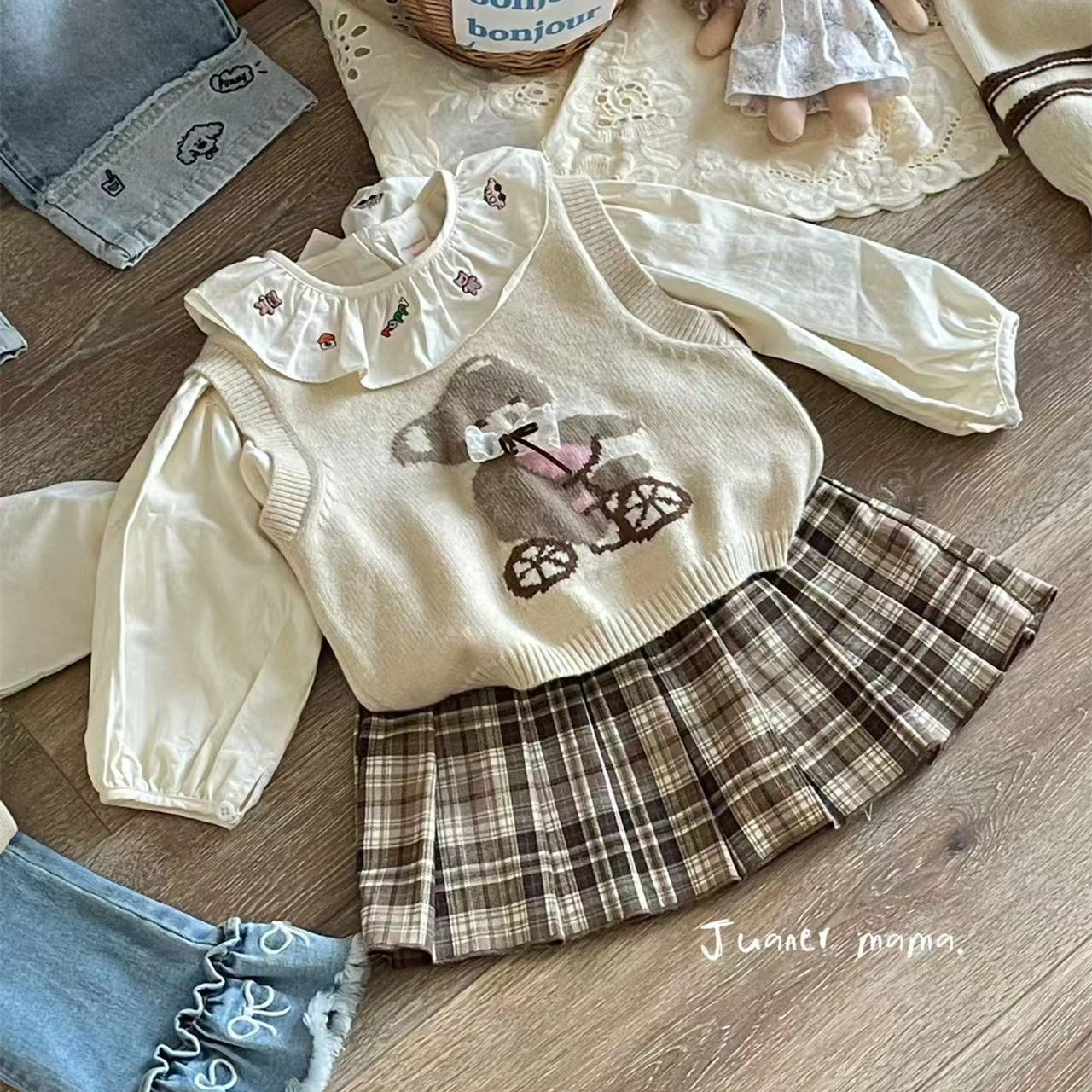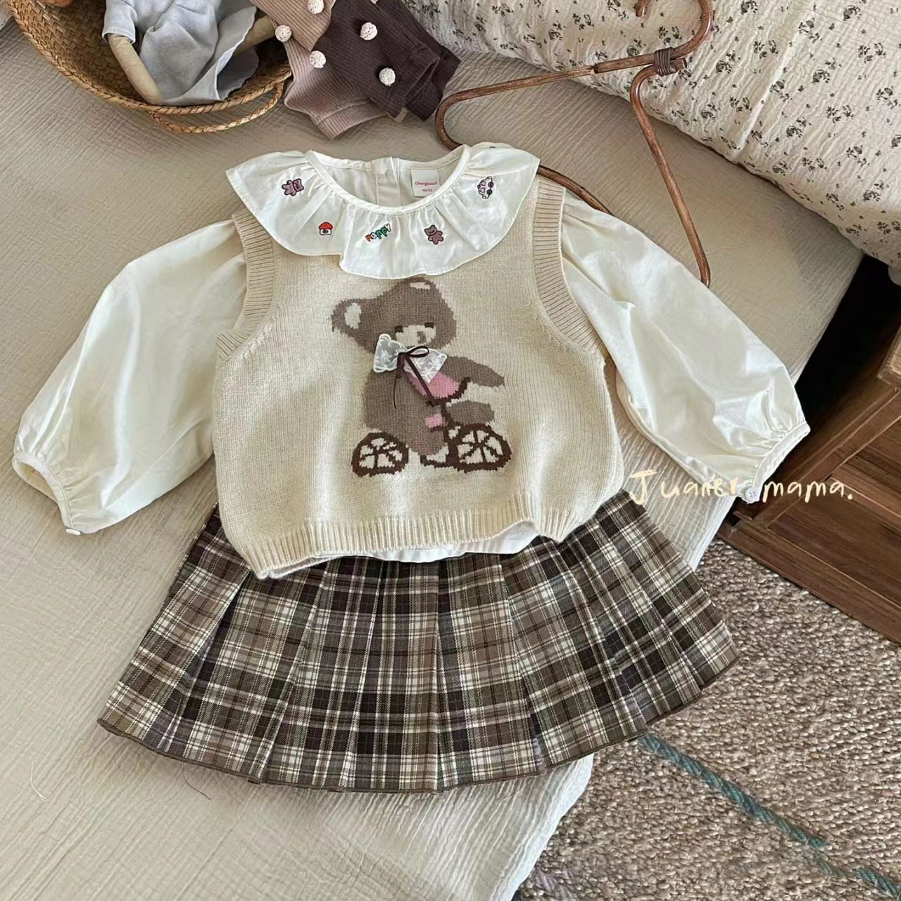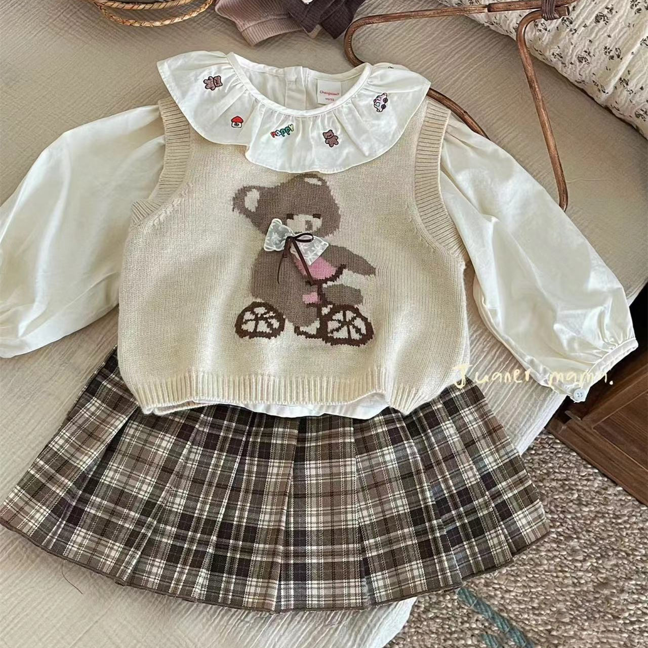 [가을 3 피스 세트] 통 싱위안 베어 스웨터 조끼 수놓은 셔츠 주름 치마 봄 · 가을 세트 대학 스타일스토어 가기