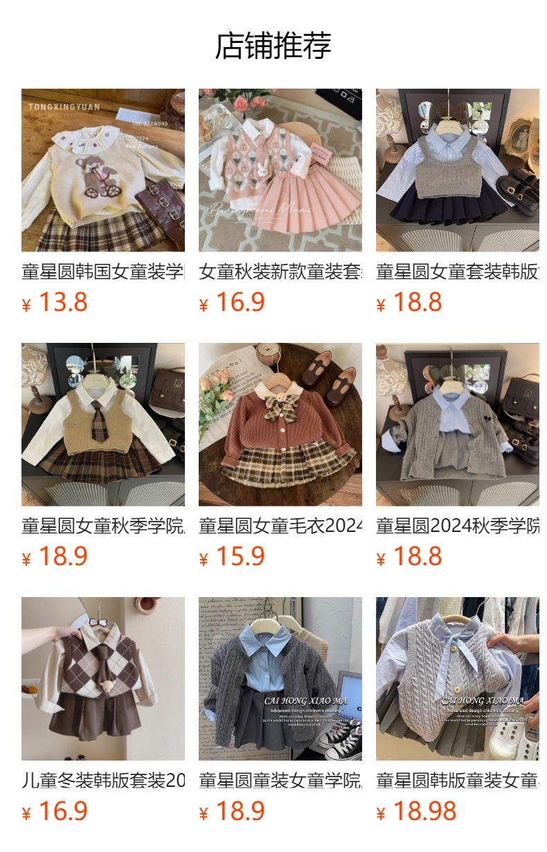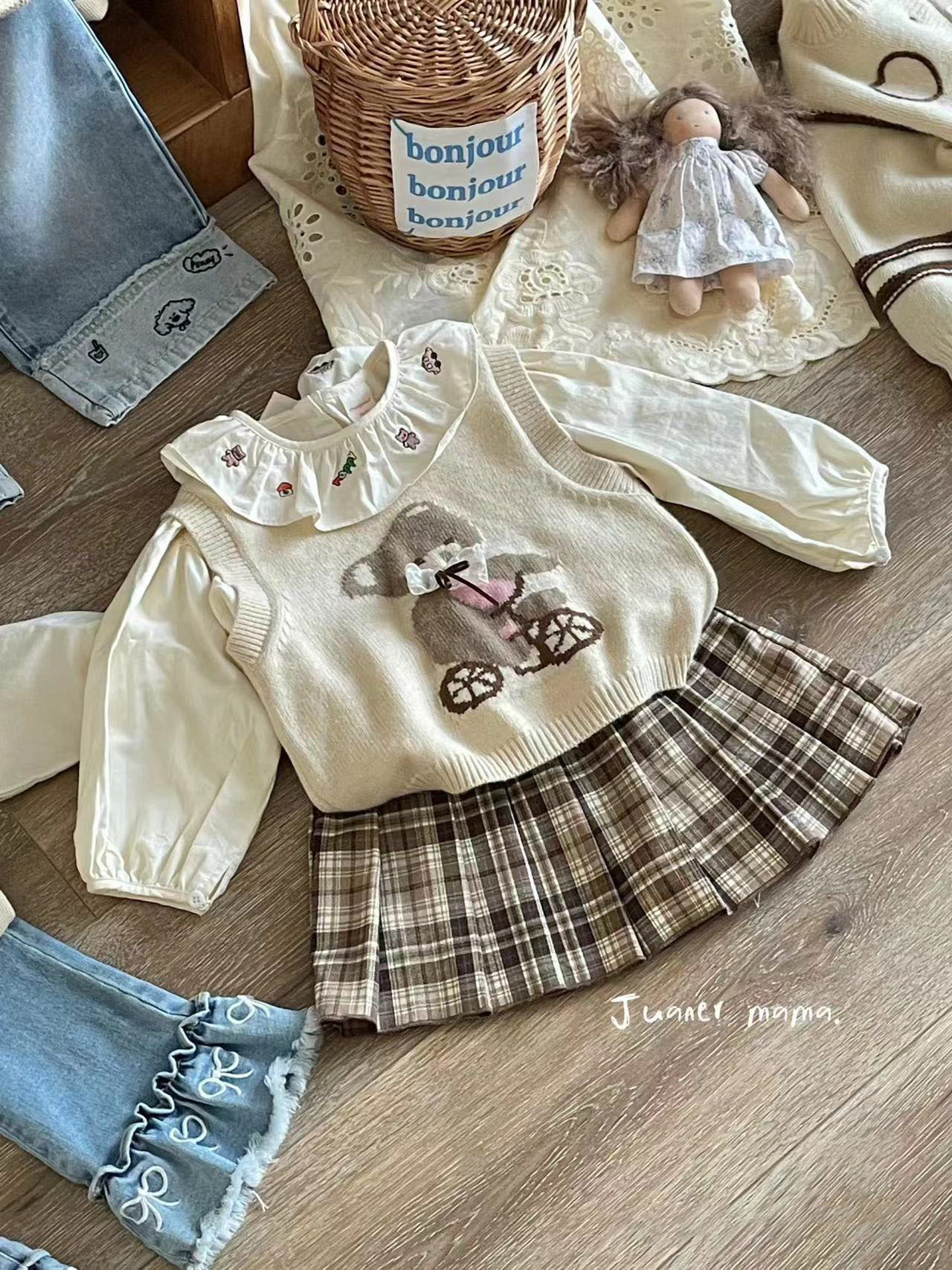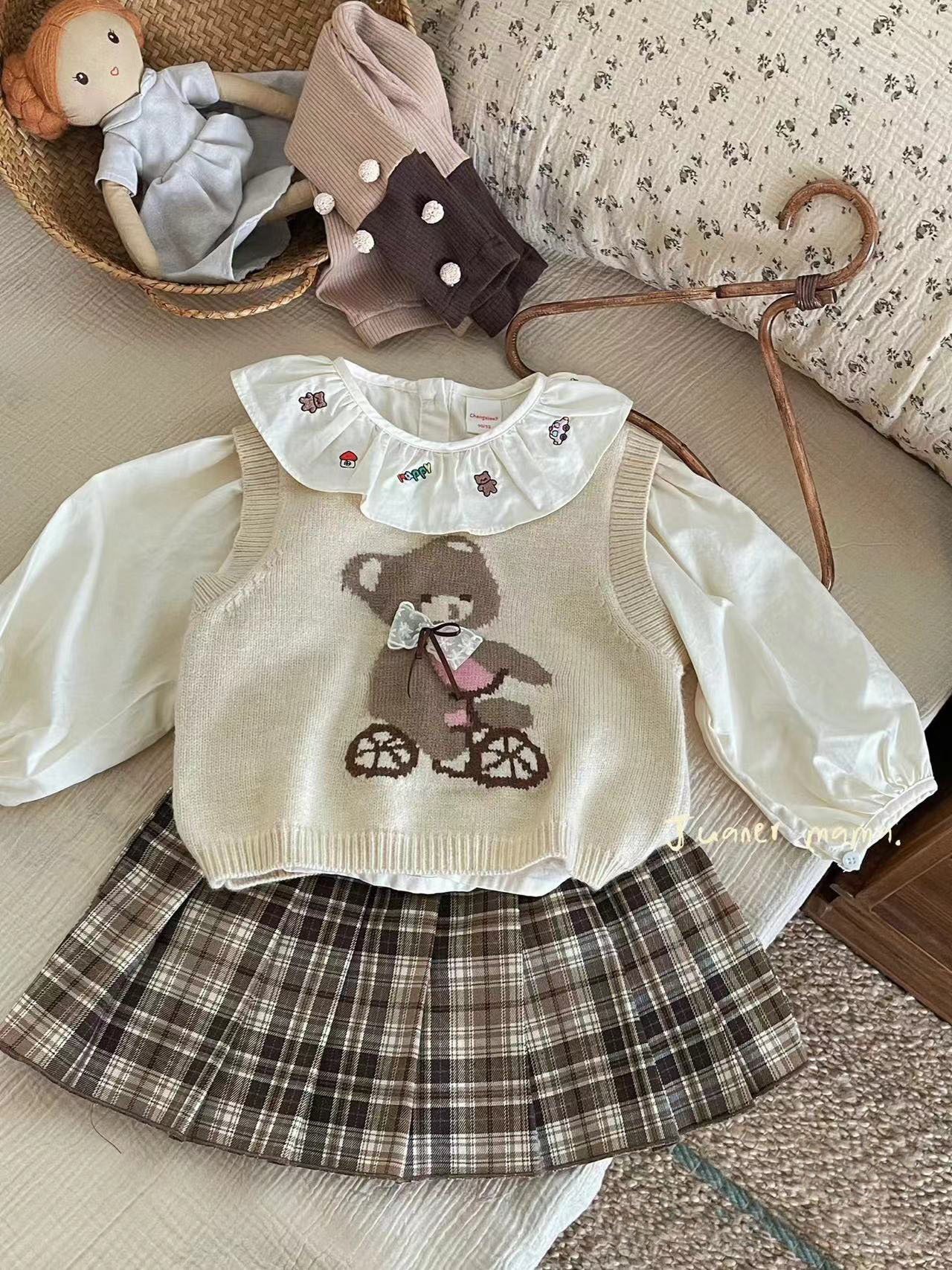 [가을 3 피스 세트] 통 싱위안 베어 스웨터 조끼 수놓은 셔츠 주름 치마 봄 · 가을 세트 대학 스타일스토어 가기