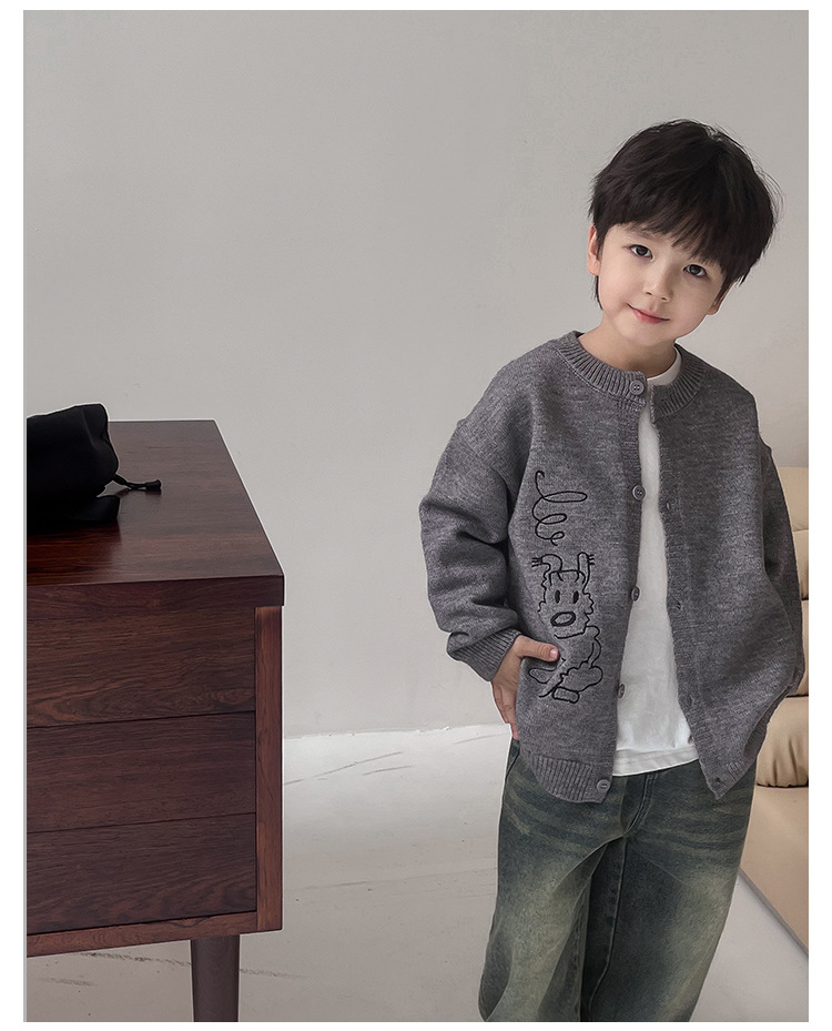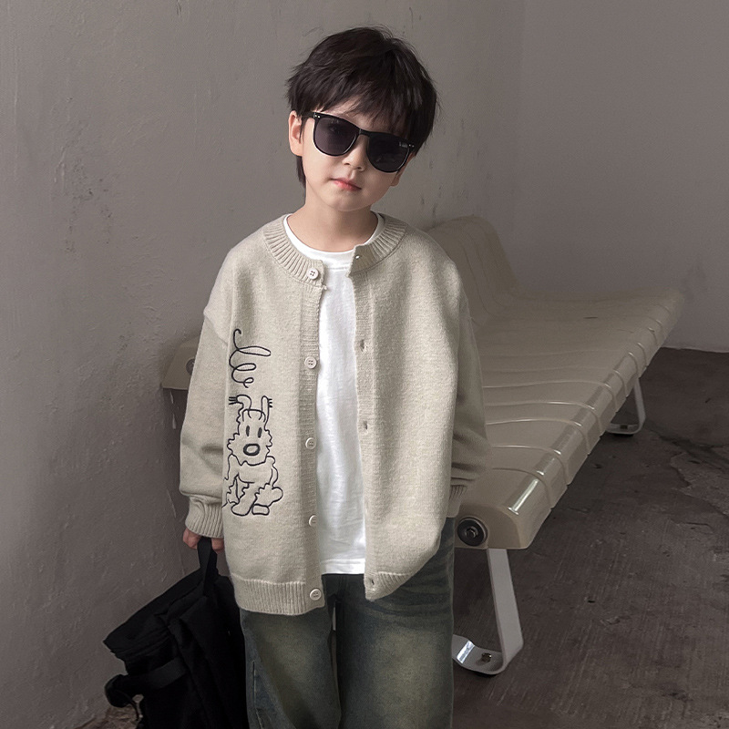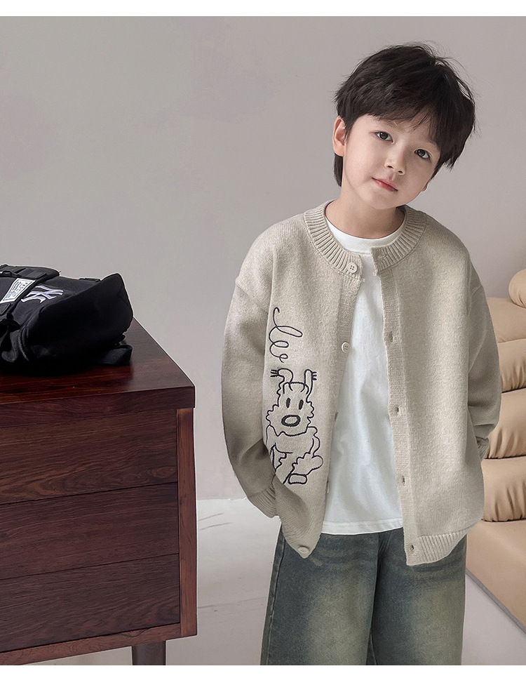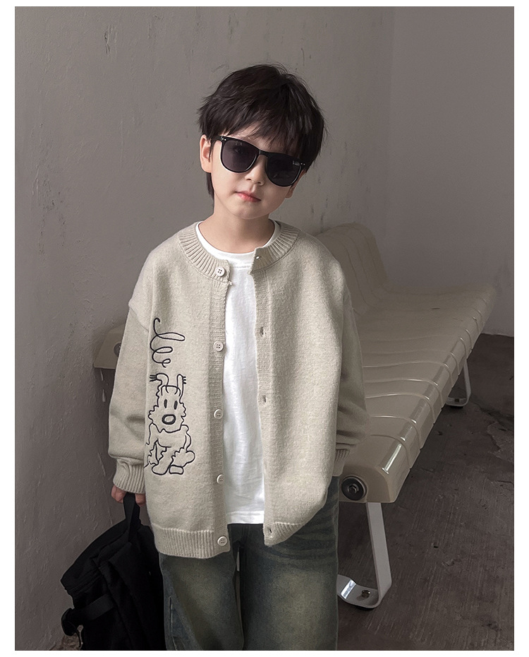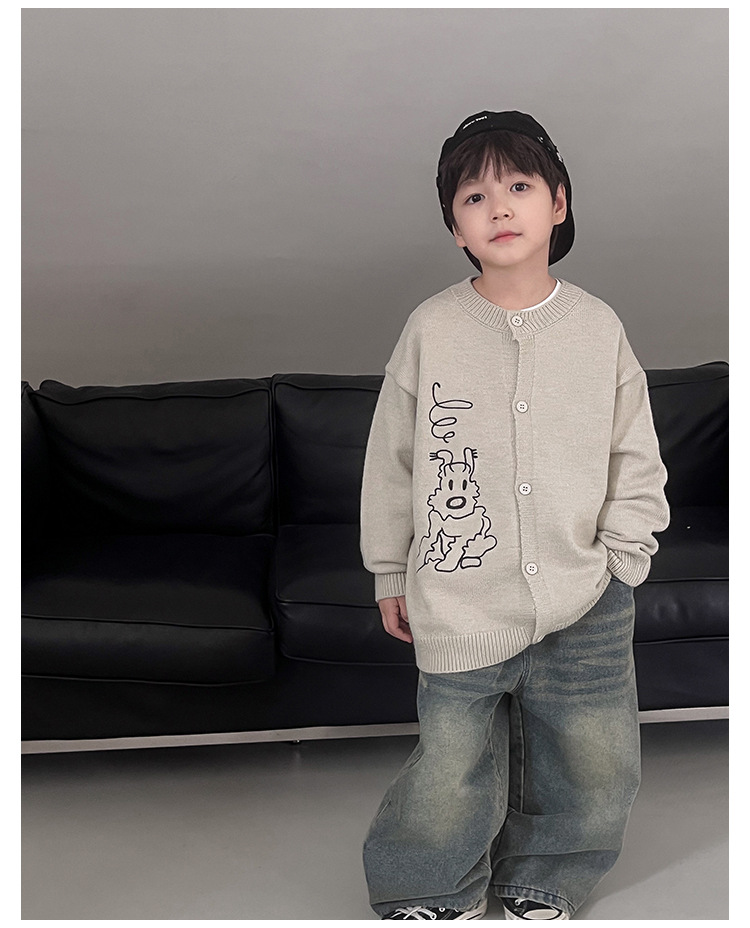 Tongku 2025 어린이 가을 모델 Huzhou Zhili 아동 의류 유행 아기 니트 카디건 강아지 자카드 소년 스웨터