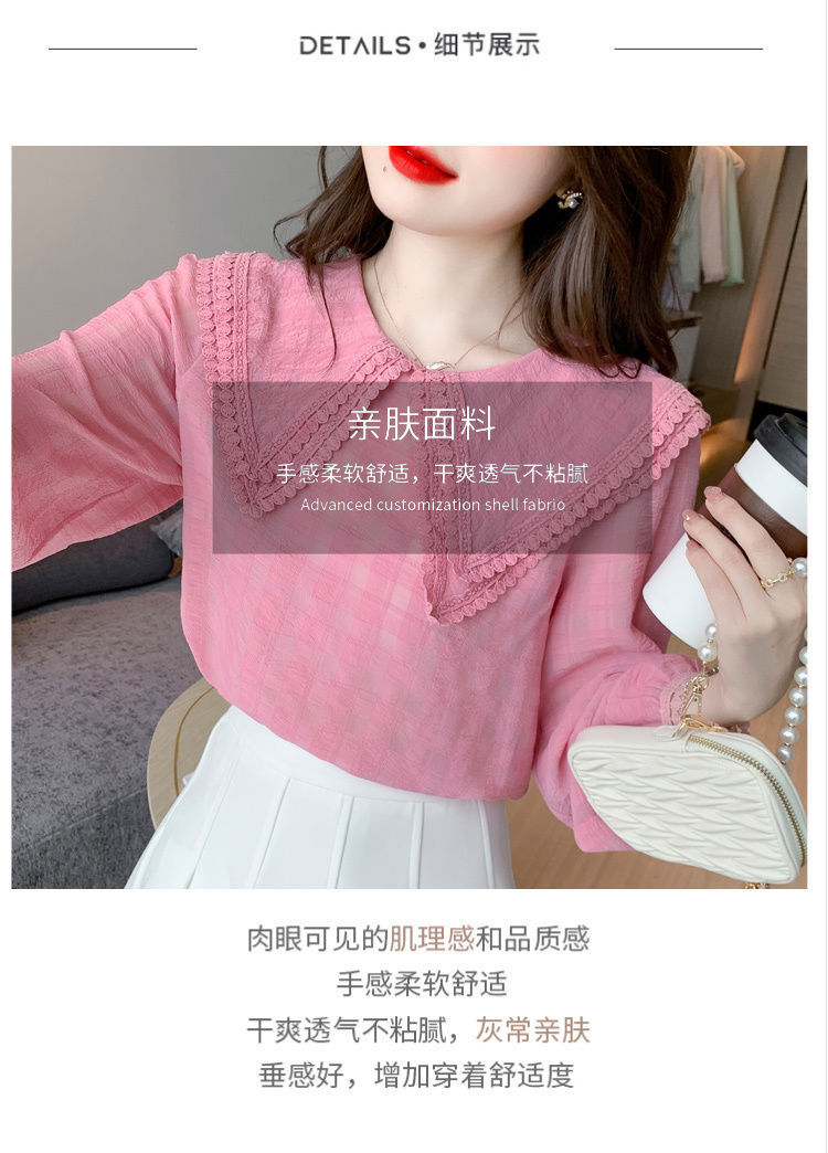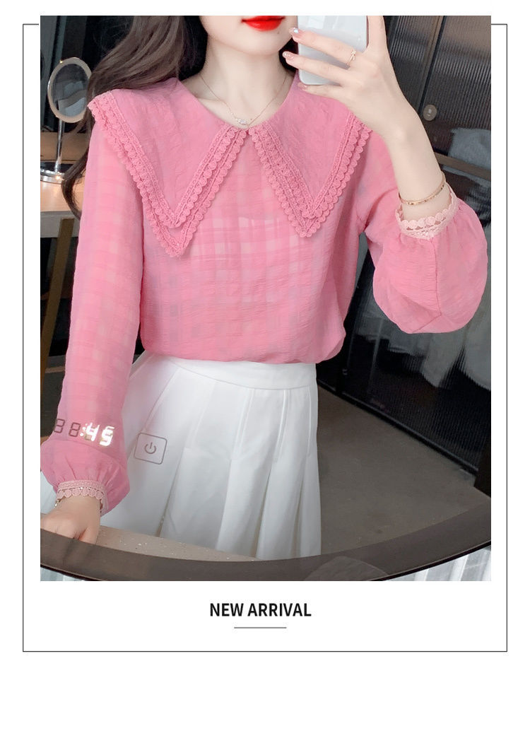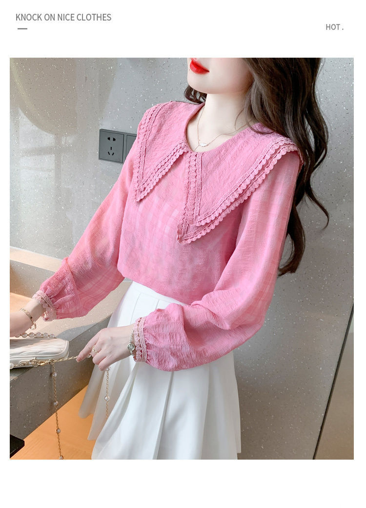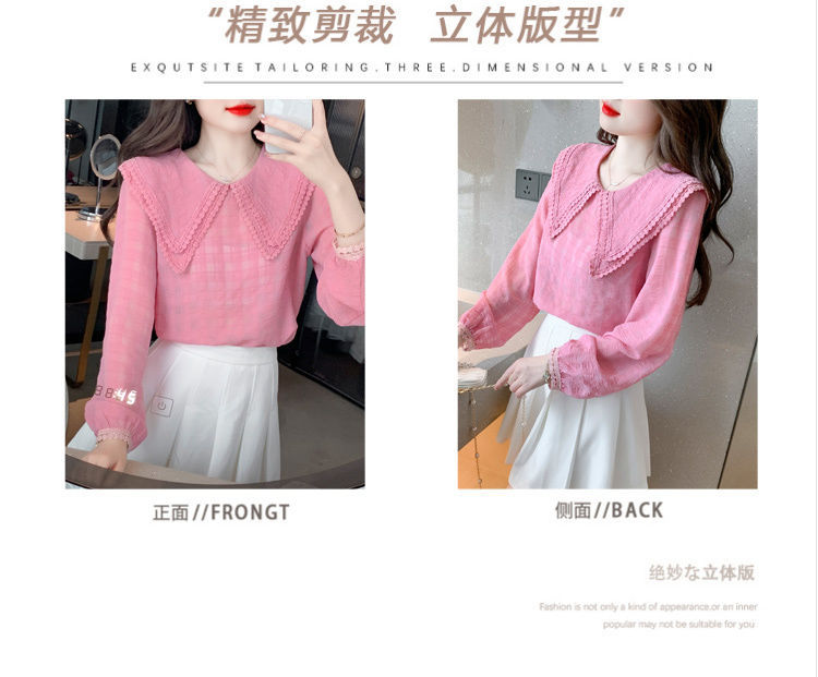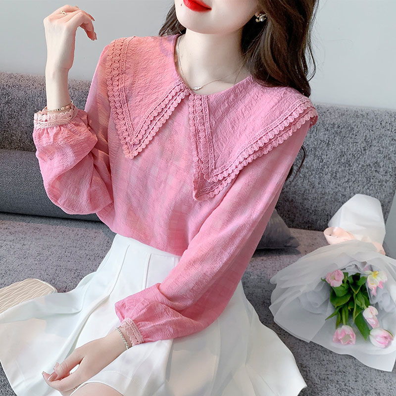 2024 가을 뉴 에이지 감소 프랑스 인형 칼라 셔츠 여성용 긴팔 우아한 쉬폰 트렌디 작은 셔츠 탑