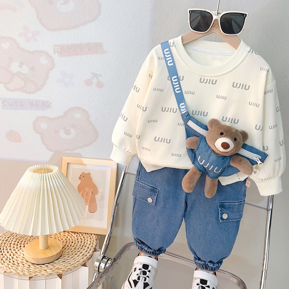아기의 입체 만화 가방 가을 2024 봄과 가을 새로운 소년과 소녀 루서 캐주얼 긴 소매 2 피스 유행 세트스토어 가기