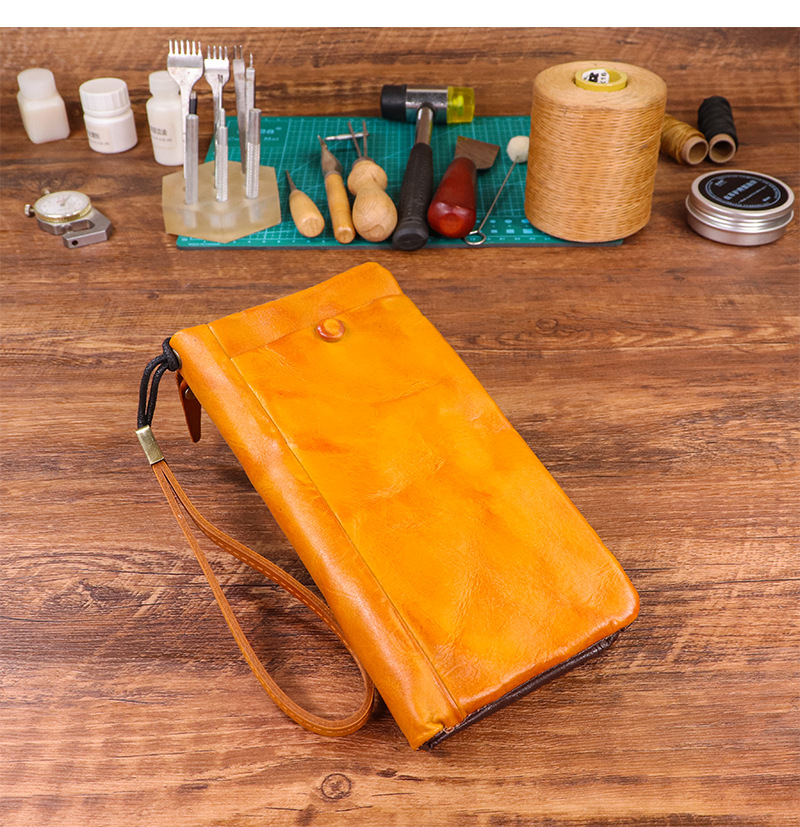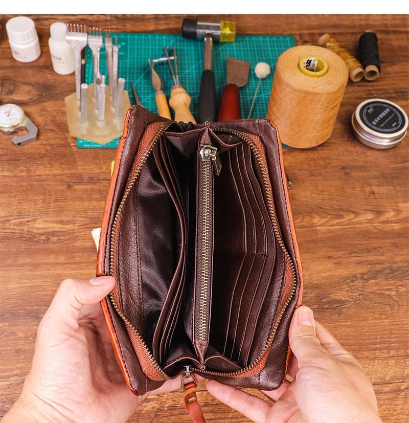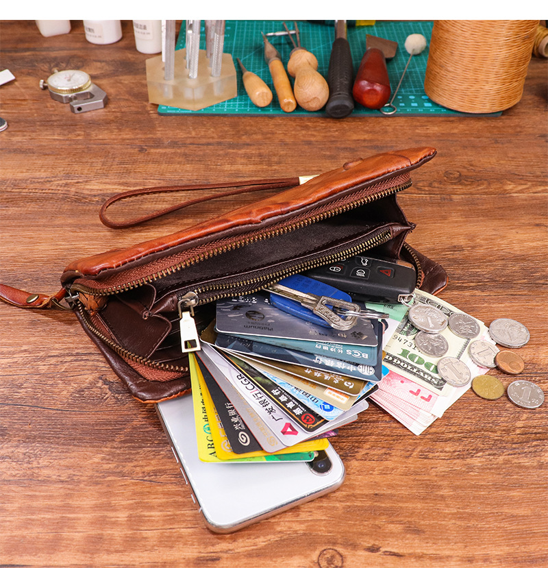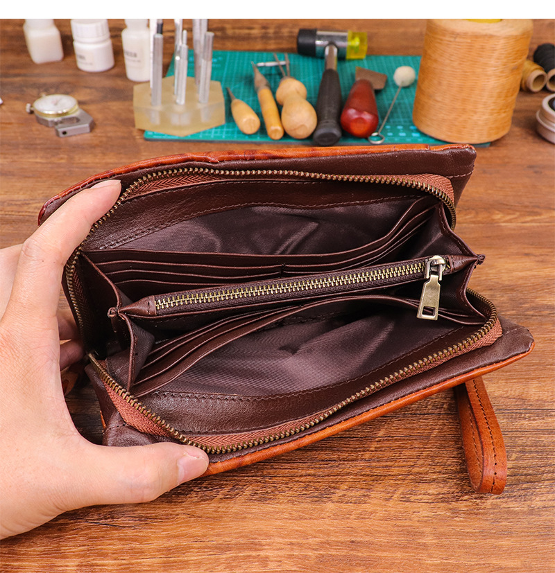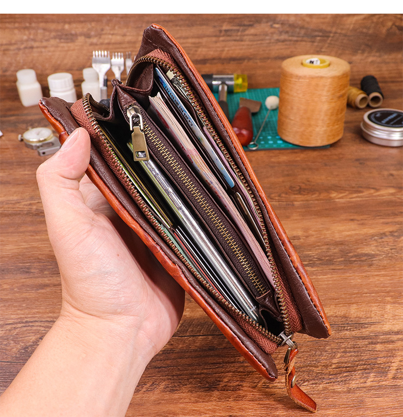 톱 레이어 Cowhide 수제 대용량 야채 태닝 가죽 오래 된 남성 지갑 긴 지퍼 남성용 다기능 레트로 핸드백