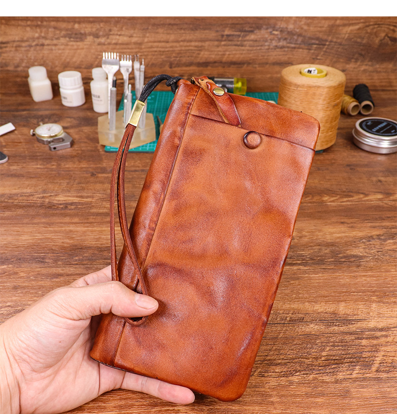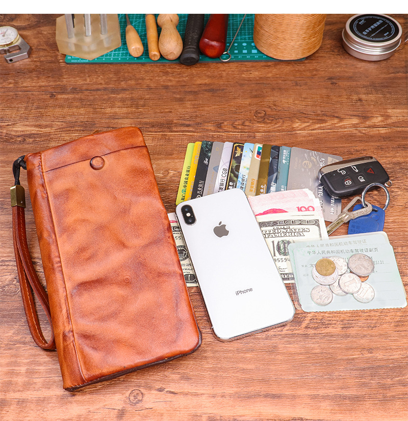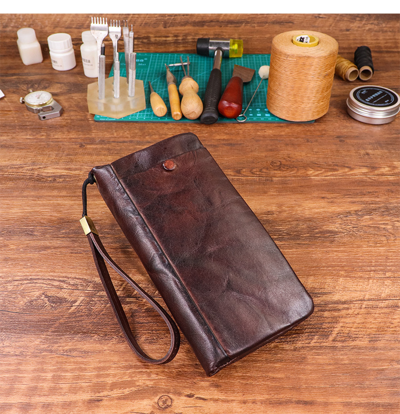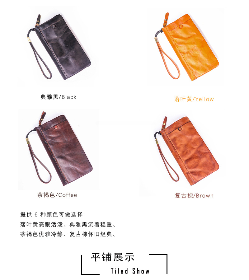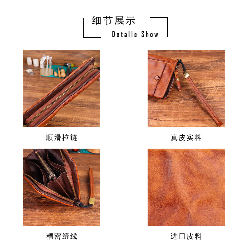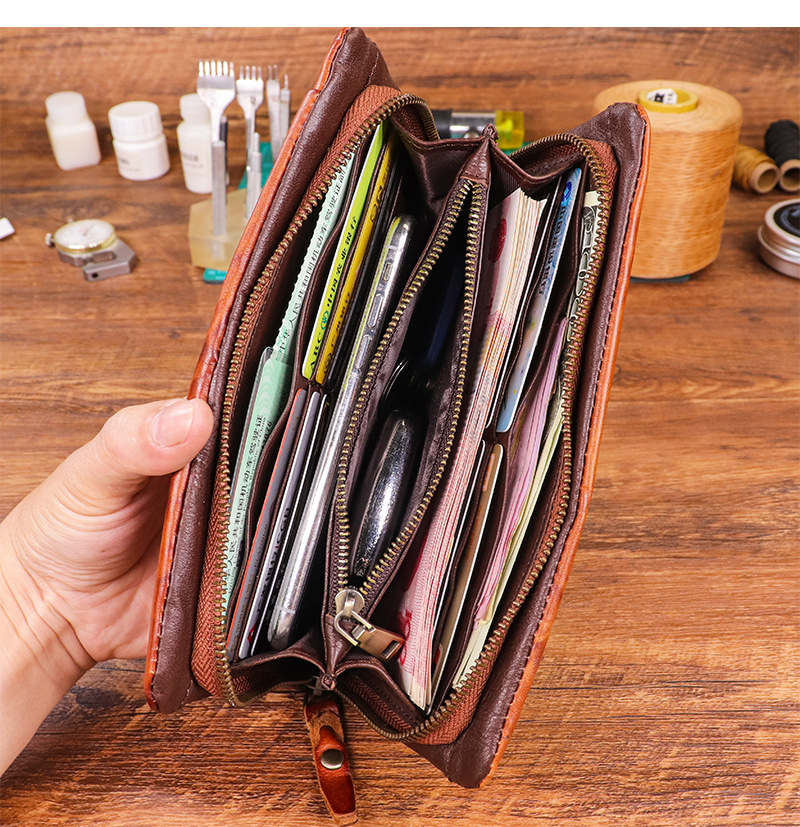 톱 레이어 Cowhide 수제 대용량 야채 태닝 가죽 오래 된 남성 지갑 긴 지퍼 남성용 다기능 레트로 핸드백스토어 가기
