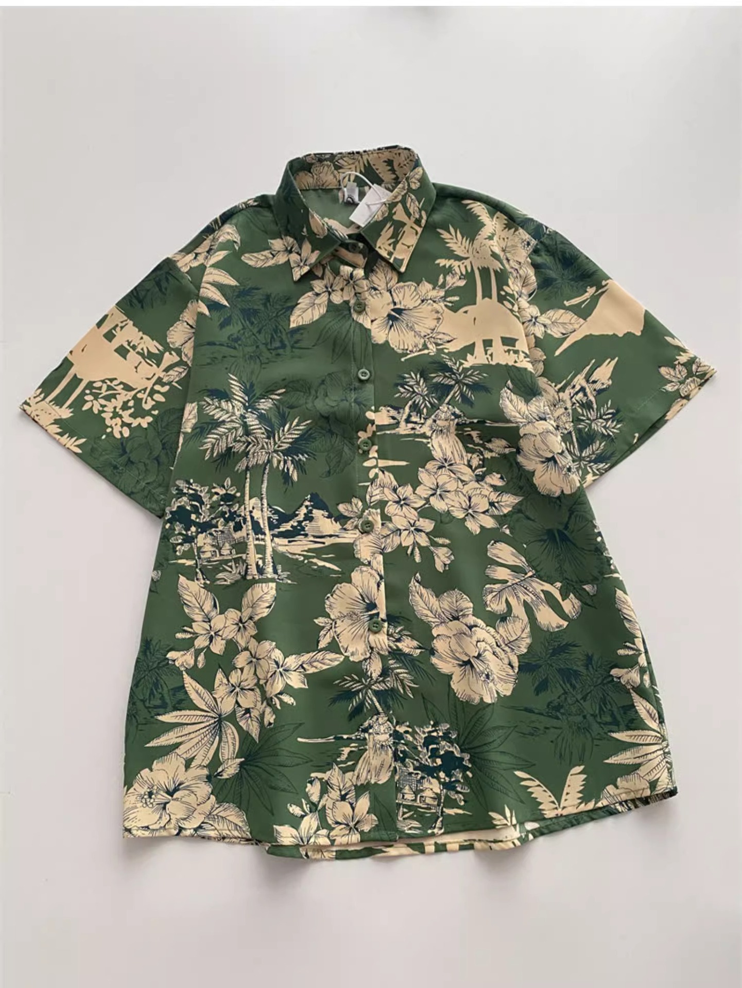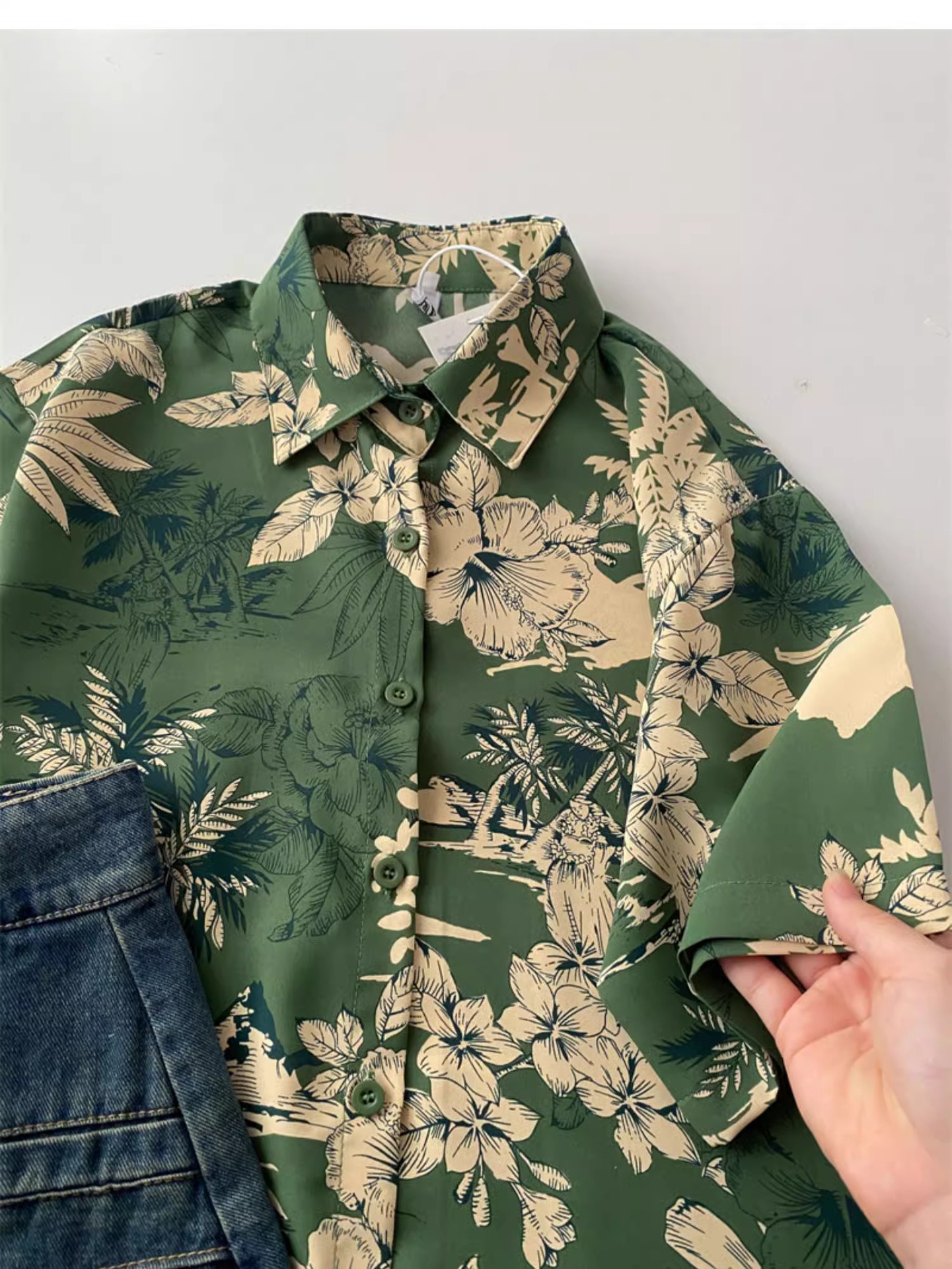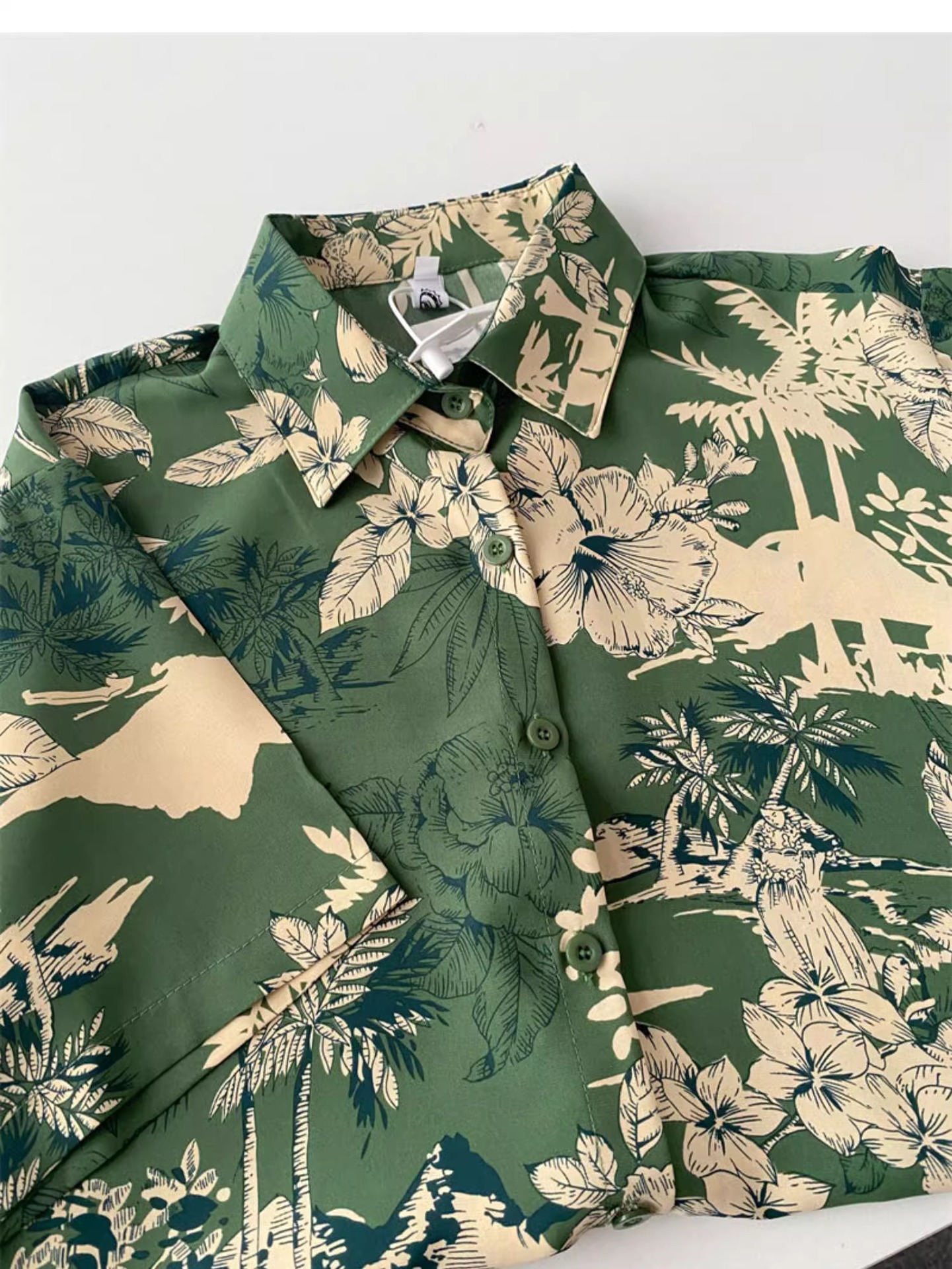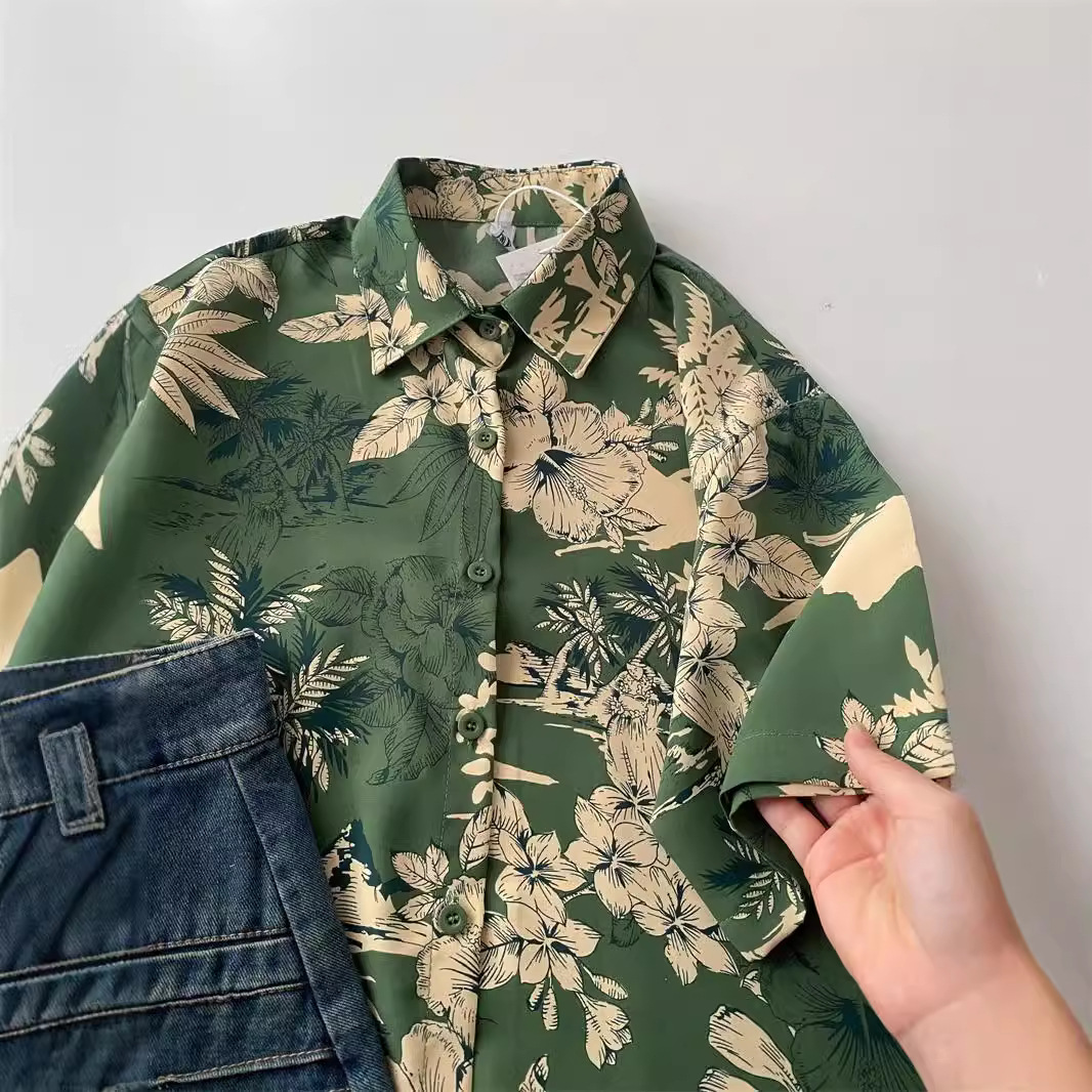 녹색 꽃 셔츠 여성 디자인 감각 틈새 여름 한국식 새로운 느슨한 중간 길이 휴가 반팔 카디건 탑스토어 가기