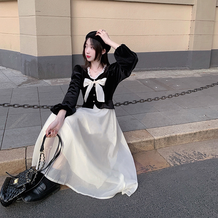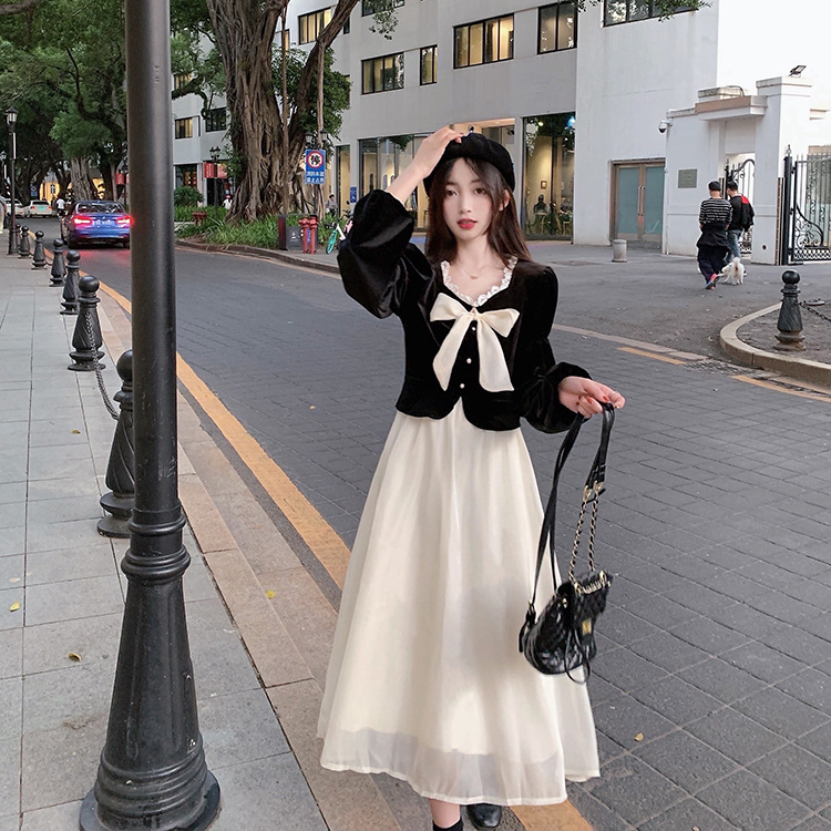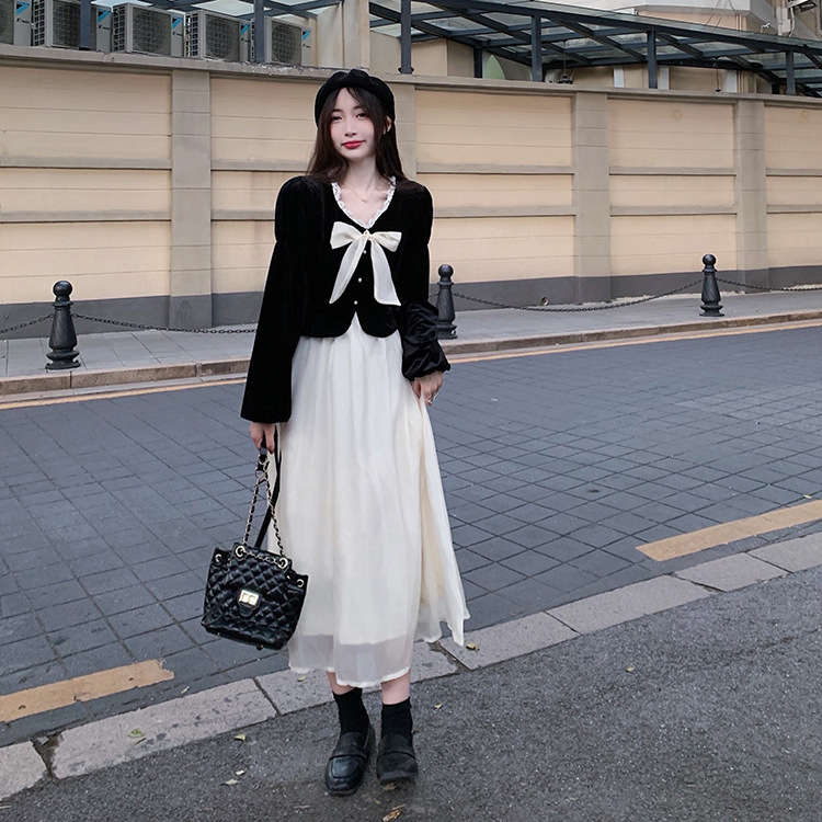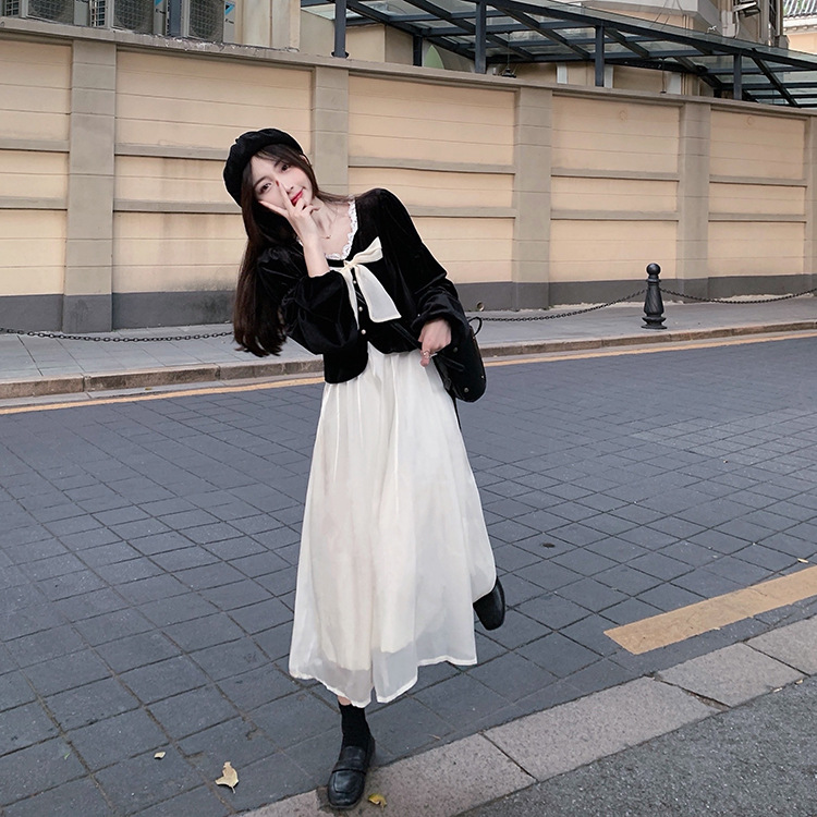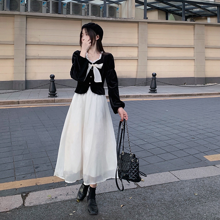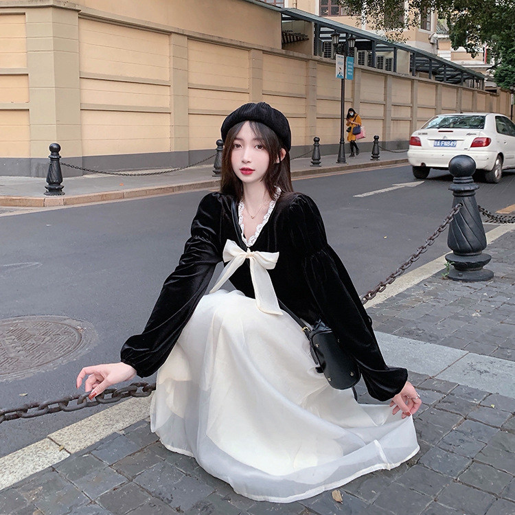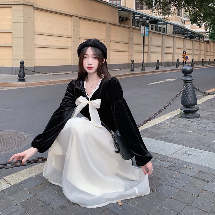 플러스 사이즈 가을과 겨울 새로운 도착 활 바느질 가짜 2 피스 벨벳 원피스 여성 통통녀 허리 슬리밍 배꼽 덮음 긴 원피스스토어 가기