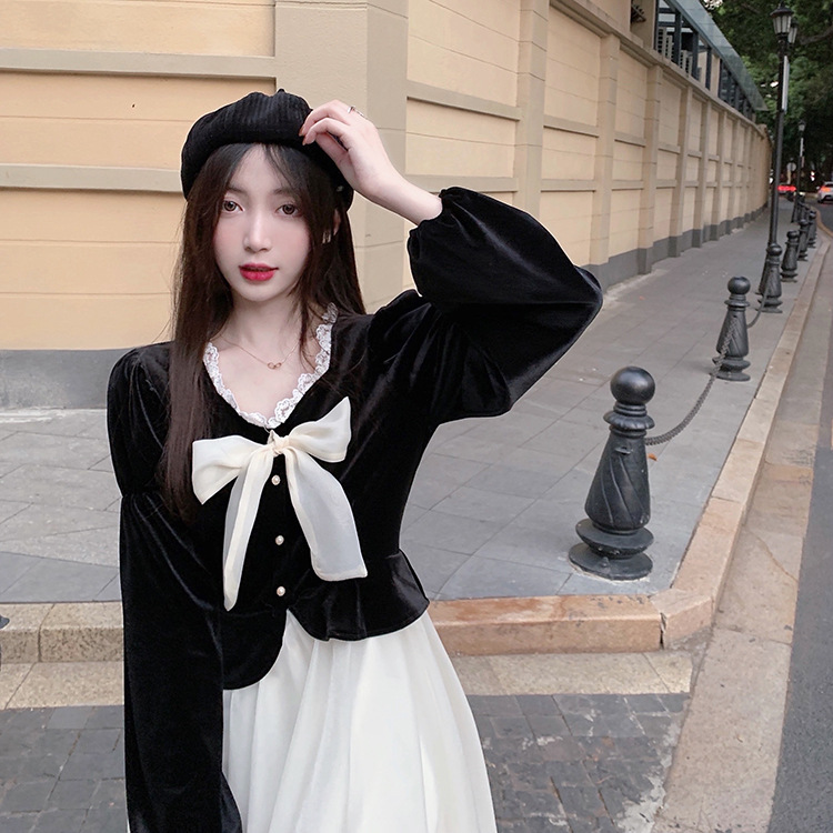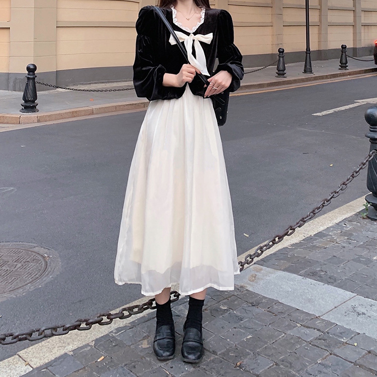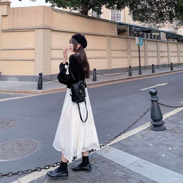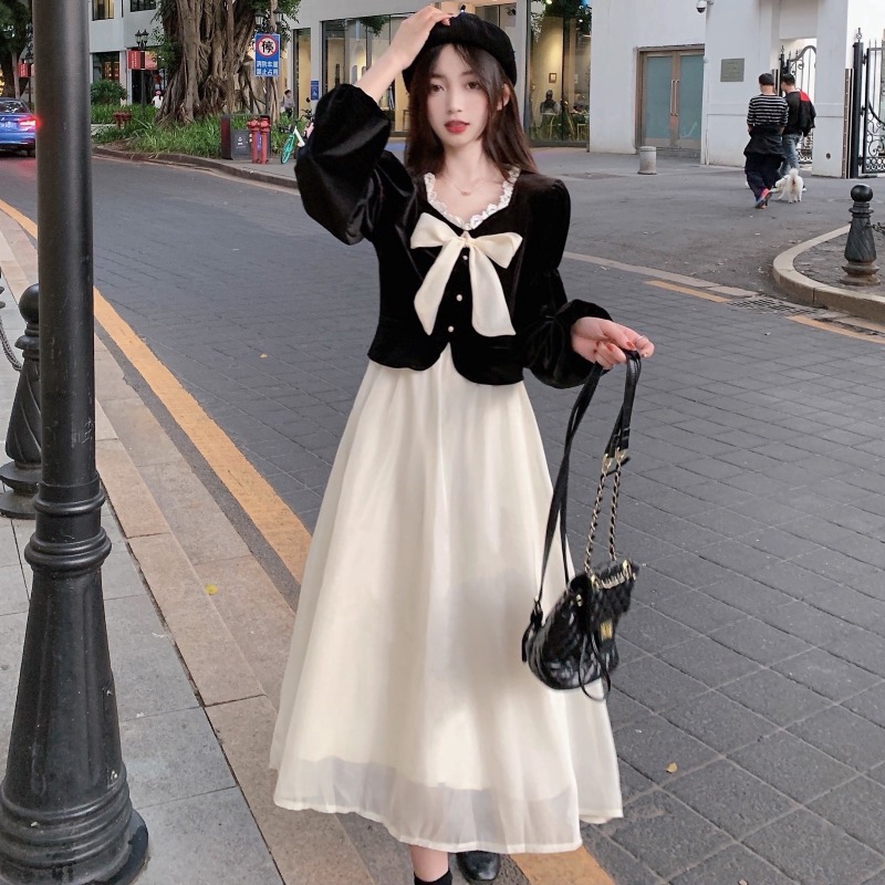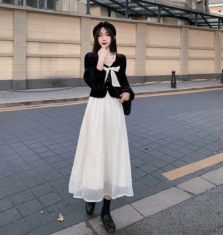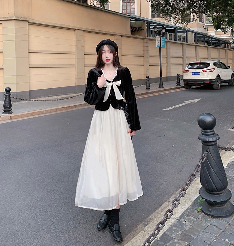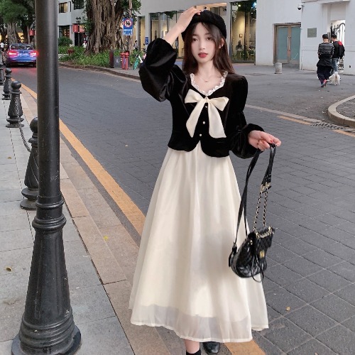 플러스 사이즈 가을과 겨울 새로운 도착 활 바느질 가짜 2 피스 벨벳 원피스 여성 통통녀 허리 슬리밍 배꼽 덮음 긴 원피스스토어 가기