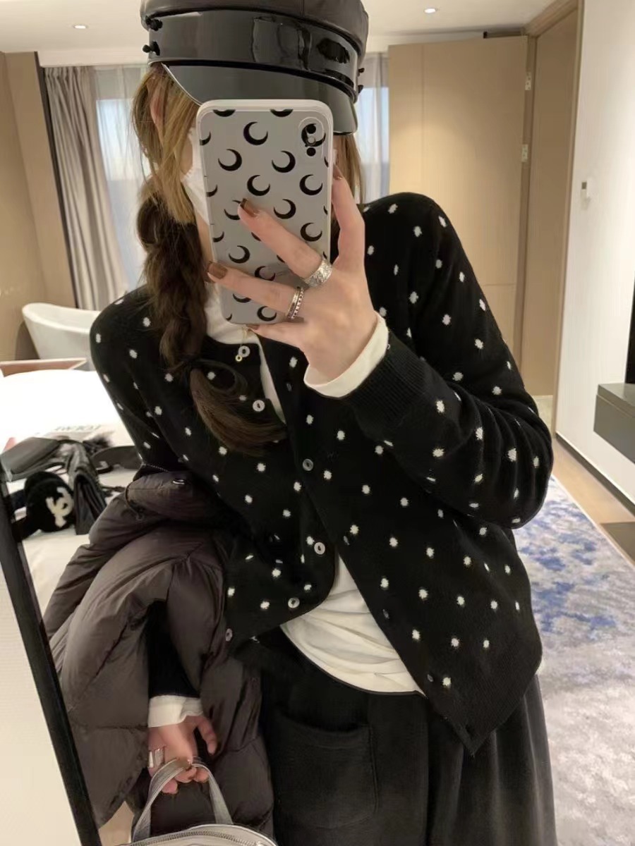 대외 무역 새로운 폴카 도트 자카드 라운드 넥 싱글 브레스트 루즈 레트로 작은 카디건 여성용 긴팔 간단한 캐주얼 재킷스토어 가기